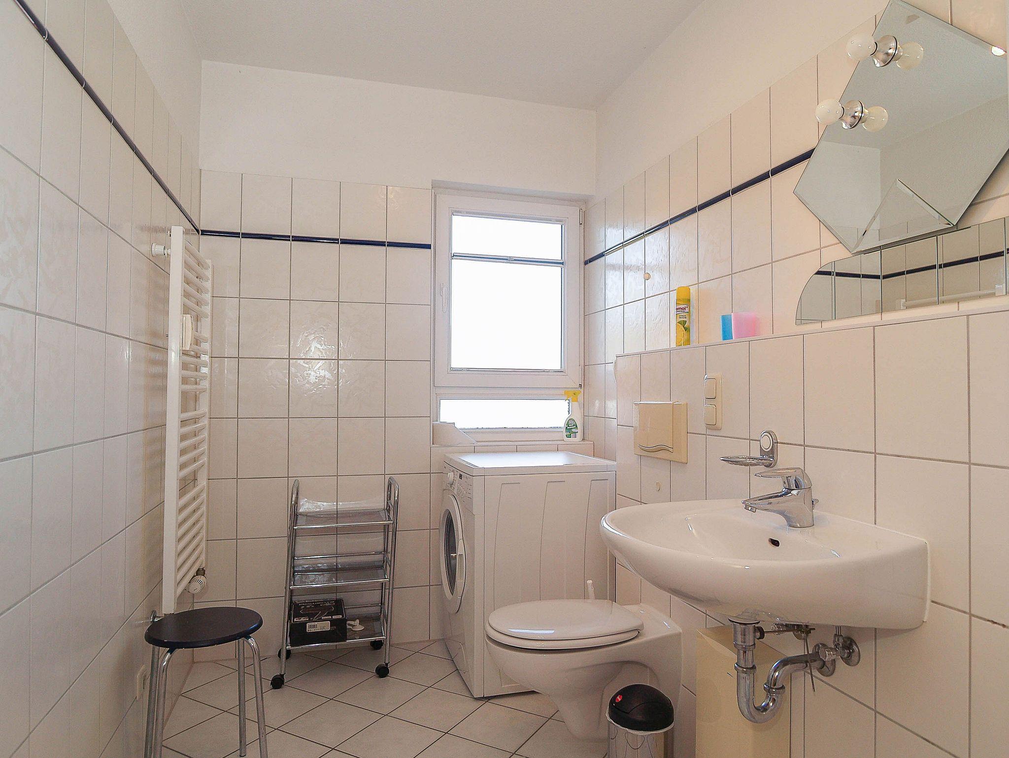 Das geflieste Tageslichtbad ist ausgestattet mit einer Dusche, Waschbecken, WC und einer Waschmaschine. Ein Handtuchheizkörper sorgt für kuschelig warme Handtücher.