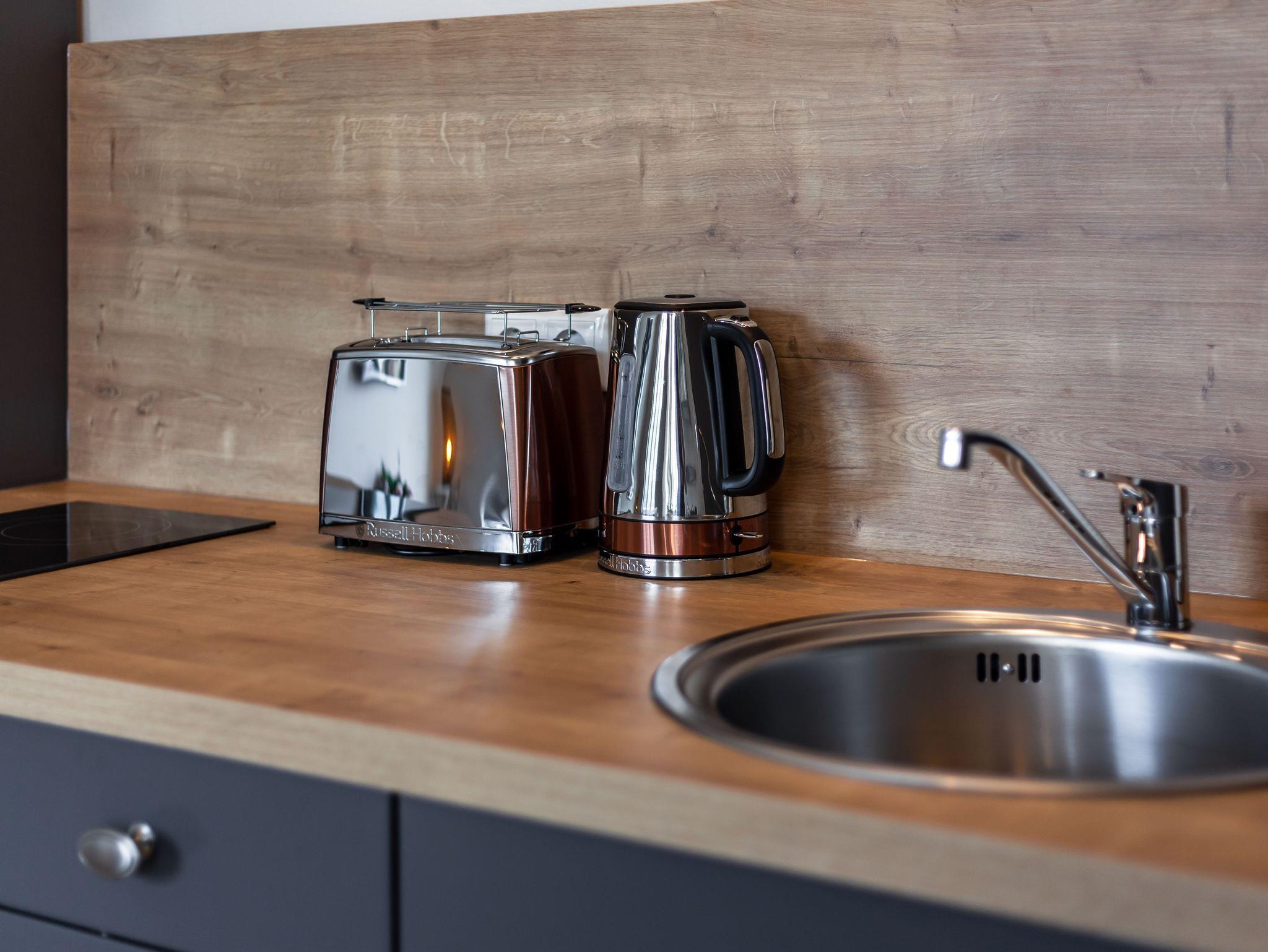Küchenzeile mit Mikrowelle, Zweiplattenceranfeld, Backofen, Kühlschrank mit Gefrierfach, Kaffeemaschine, Wasserkocher, Toaster und Geschirrspüler. Der Balkon geht zur Südseite.