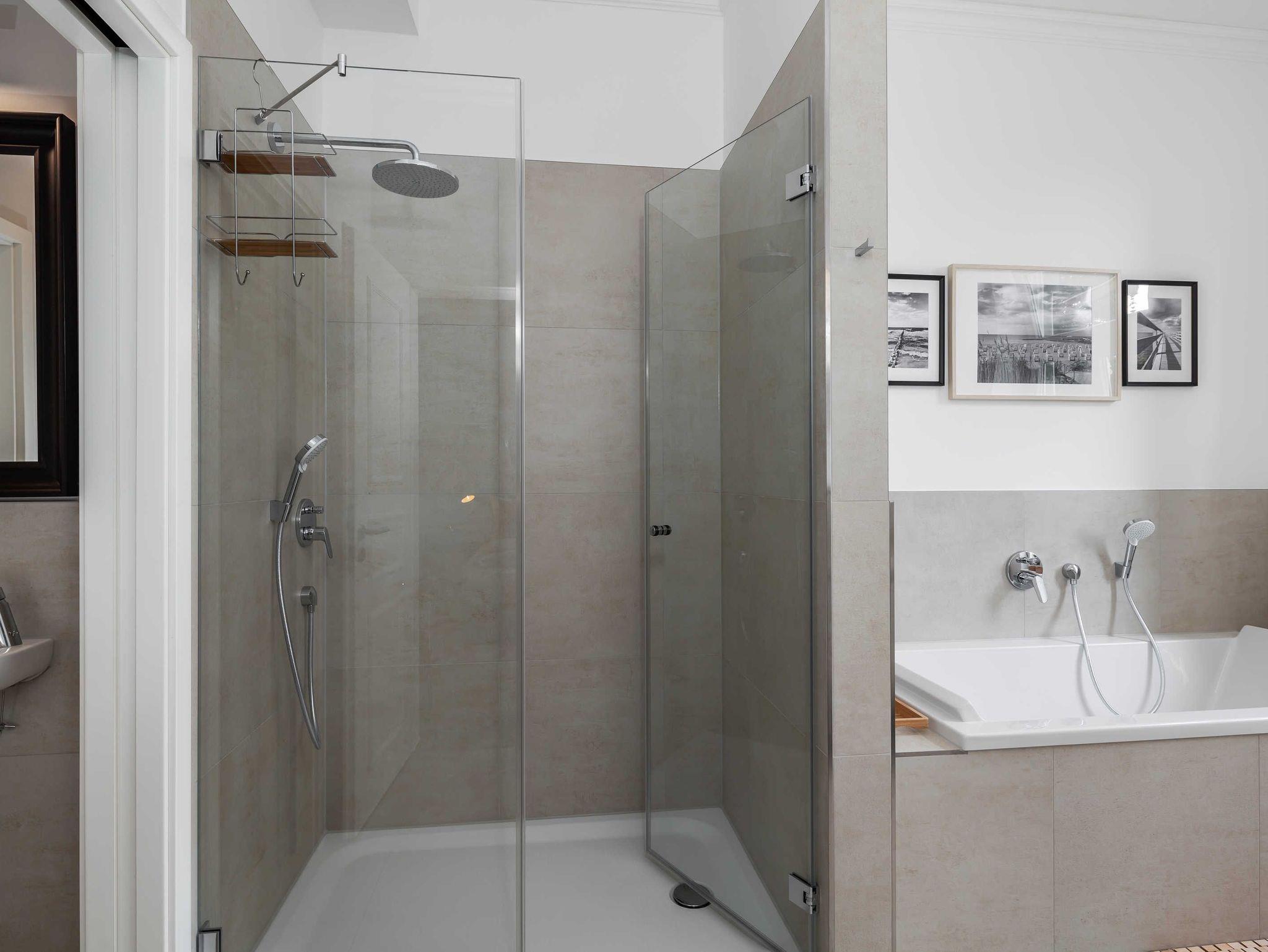 Das luxeriöse Bad mit ebenerdiger Dusche und Badewanne. Der Balkon zur
