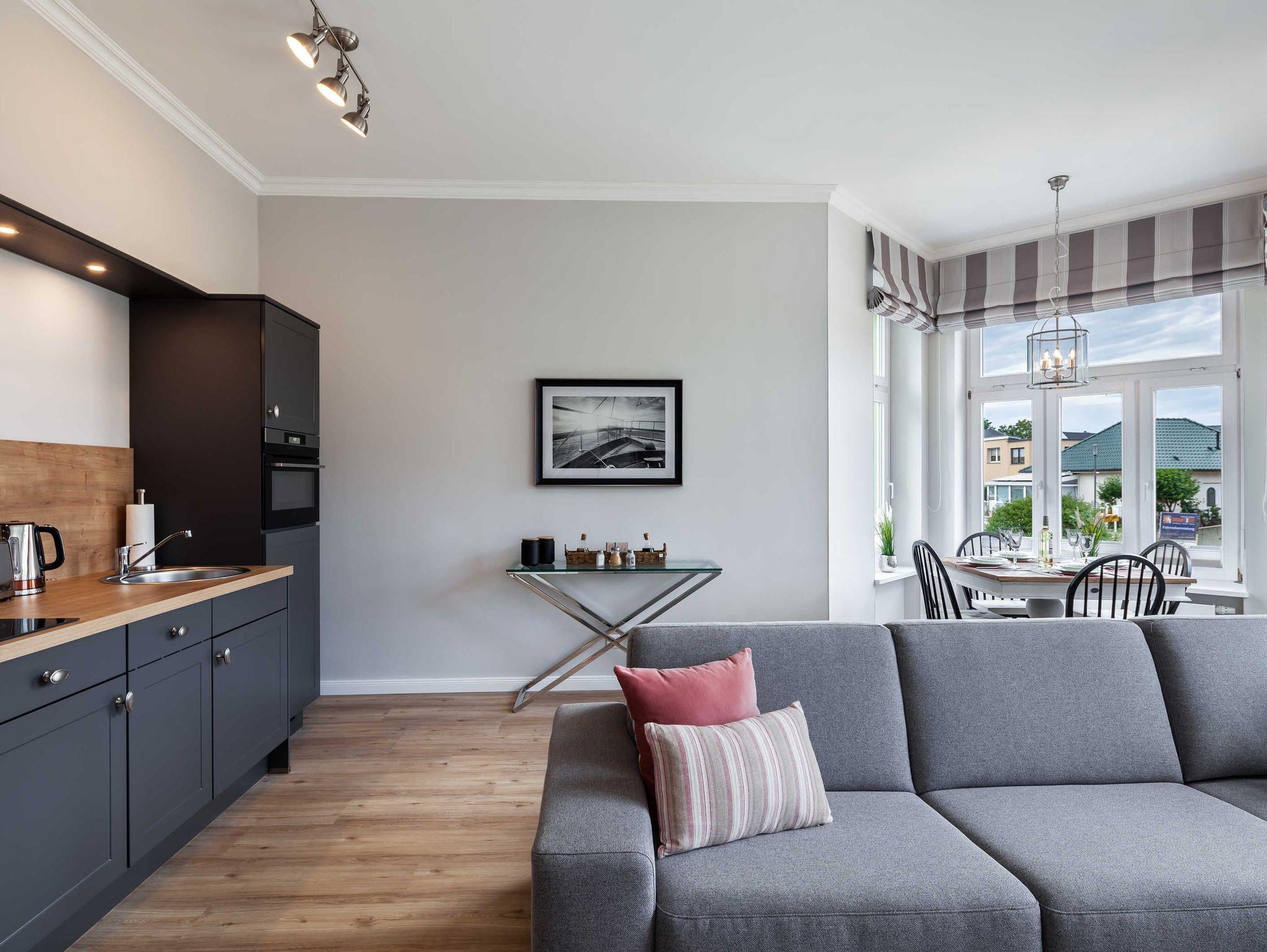 Wohnzimmer mit Schlafcouch, Esstisch, Küchenzeile, Kabel-TV, Radio und passwortgeschützes WLan