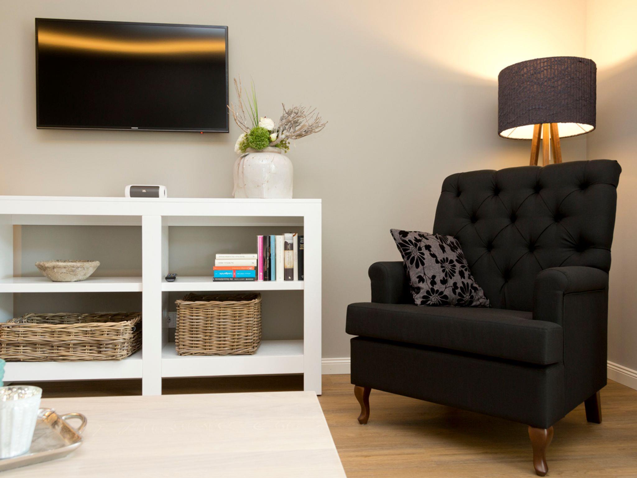 Zur Ausstattung der 55 m² großen Wohnung gehören u.a. eine komplette Küche mit Herd, Backofen, Spülmaschine, Kühlschrank mit Gefrierfach, Kaffeemaschine, Toaster, Nespresso-Maschine, Handmixer etc.; CD-Radio & Bluetooth-Lautsprecher, TV in Wohn- und Schlafzimmer (Doppelbett 180x200 m), WLAN-Hotspot, Bügeleisen und-brett, Fön, Schranksafe, etc. Alle Möbel wurden exklusiv und individuell aus Holz von einem Tischler gefertigt, ebenso die nach historischem Vorbild erstellten Fenster und Türen. Die Wohnung ist insgesamt sehr hochwertig und geschmackvoll eingerichtet und mit entsprechendem Ambiente geschmückt. Natürliche Materialien und schöne, ruhige Farben geben Ihnen ein hochwertiges Umfeld für Ihren Urlaub.