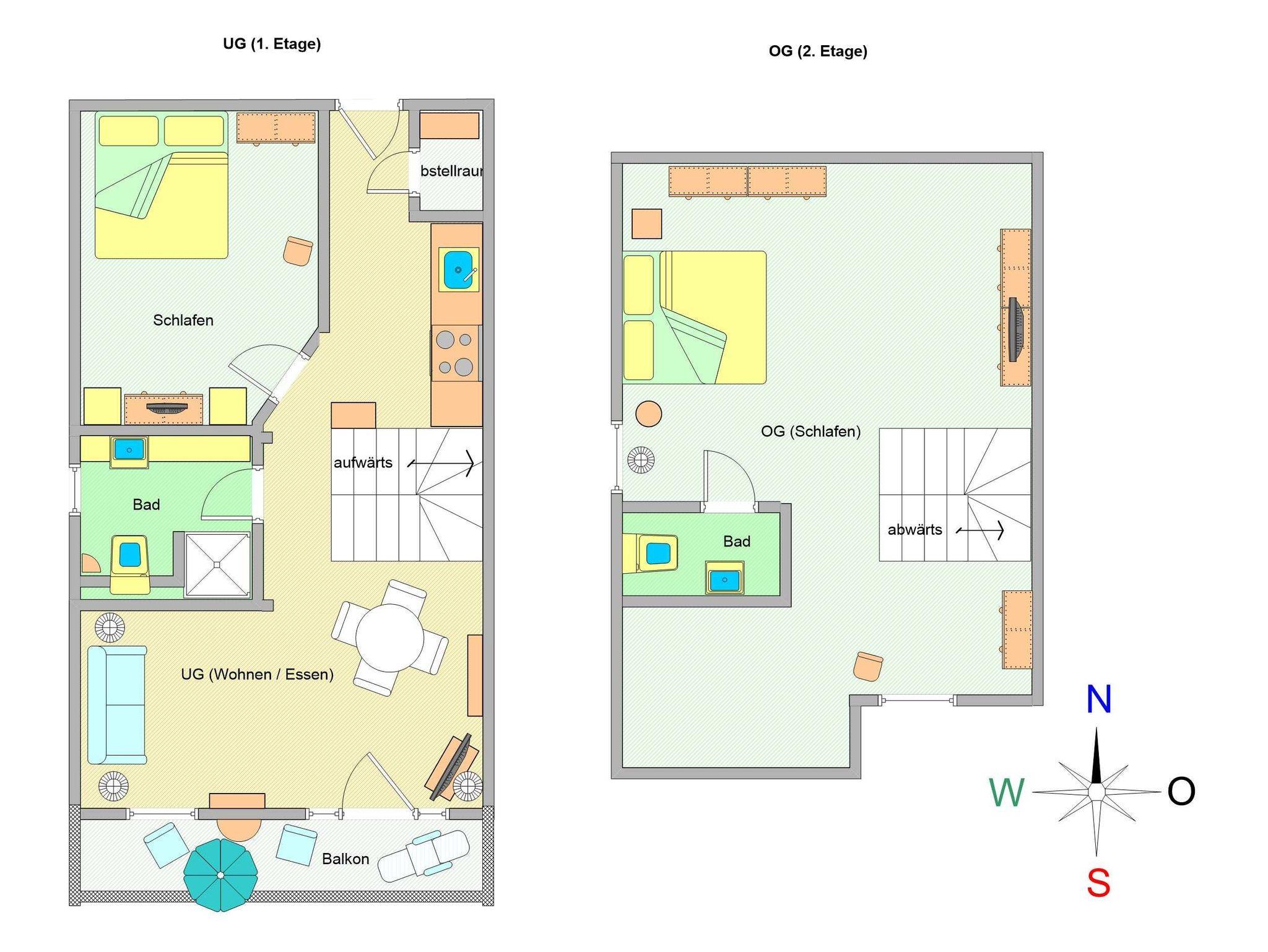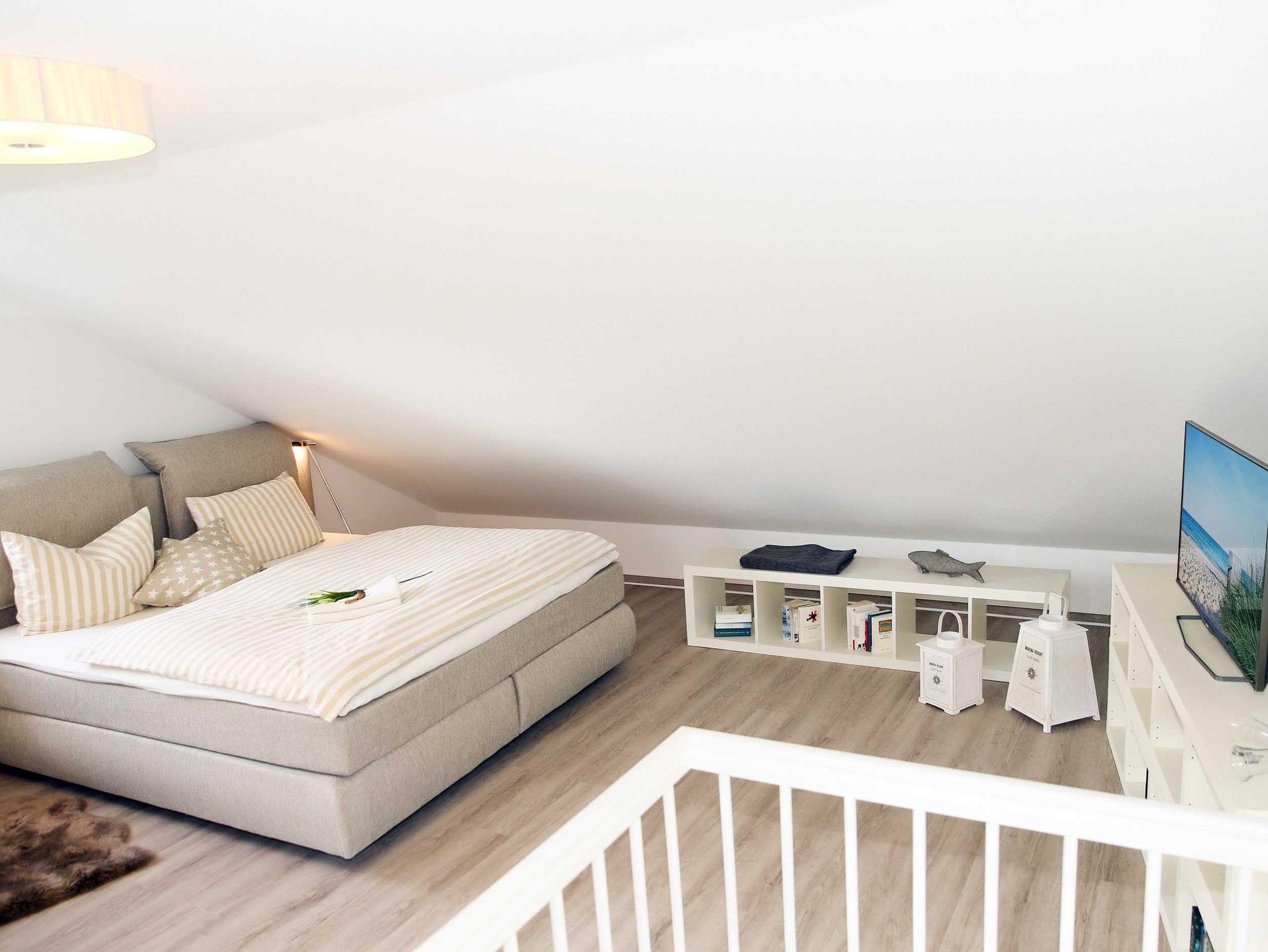 Sie wohnen in einer 3-Zimmer-Maisonettewohnung mit ca. 73 qm Wohnfläche, die sich im 1. Obergeschoss befindet. Der Wohnbereich ist ausgestattet mit einer Sitzecke, 45-Zoll-Flachbild-TV, Essecke und der offenen Küche. (4-Zonen-Ceranfeld mit Backofen, Geschirrspüler, Mikrowelle, Kühlschrank mit Gefrierfach). Vom Wohnbereich aus gelangen Sie auf den möblierten Südbalkon. Auf dieser Ebene finden Sie auch eines der beiden Schlafzimmer, das mit einem Doppelbett (180 cm x 200 cm), Kleiderschrank und zusätzlichen Flachbild-TV (31 Zoll) ausgestattet ist. Über eine Treppe gelangen Sie in das offene und zweite Schlafzimmer, das ebenfalls mit einem Doppelbett (200 cm x 200 cm) und Flachbild-TV (42 Zoll) ausgestattet ist. An das obere Schlafzimmer grenzt eine zusätzliches WC. Das Bad mit Dusche und WC vervollständigt das Gesamtbild dieser gemütlichen und modern eingerichteten Wohnung.