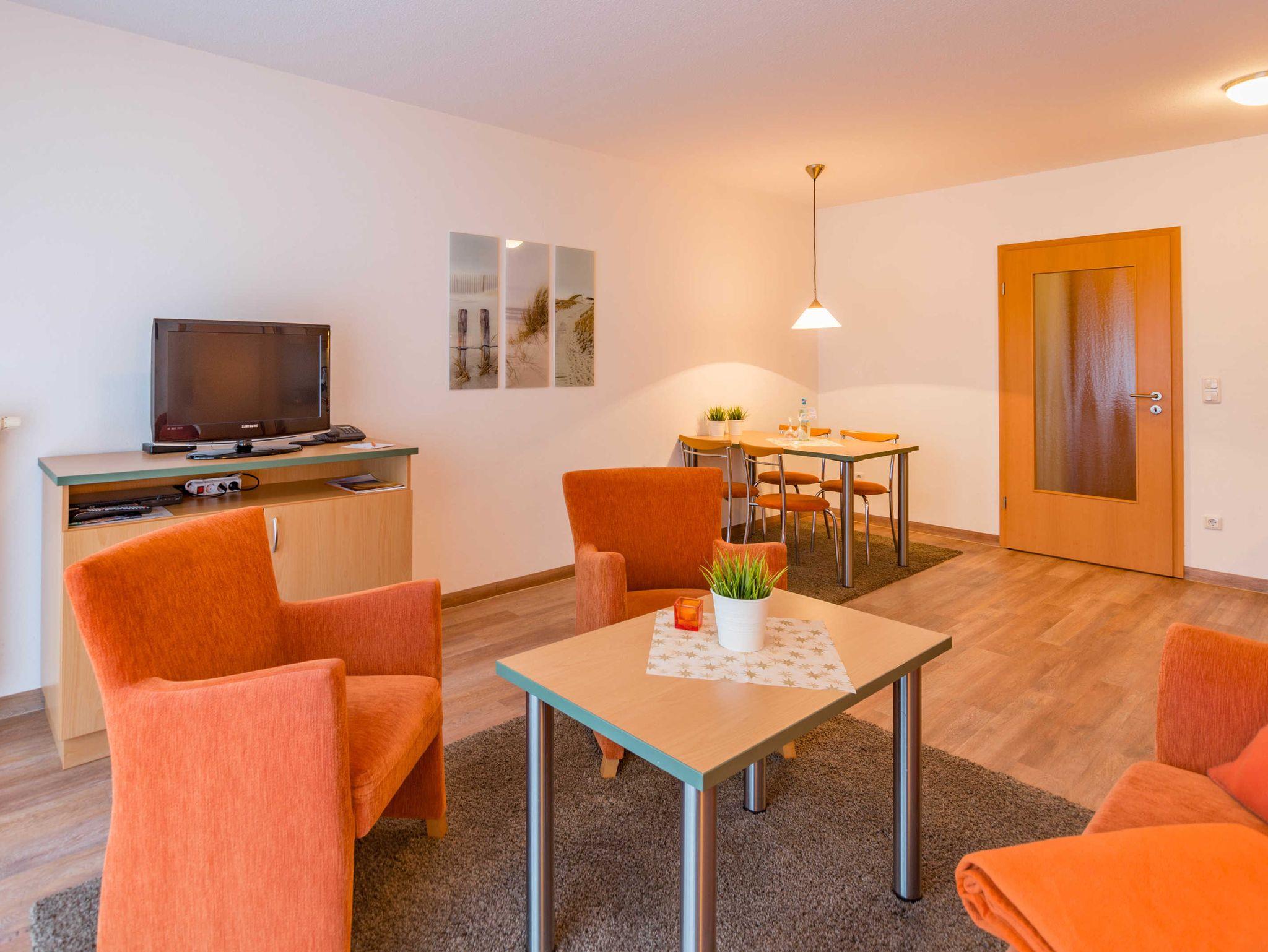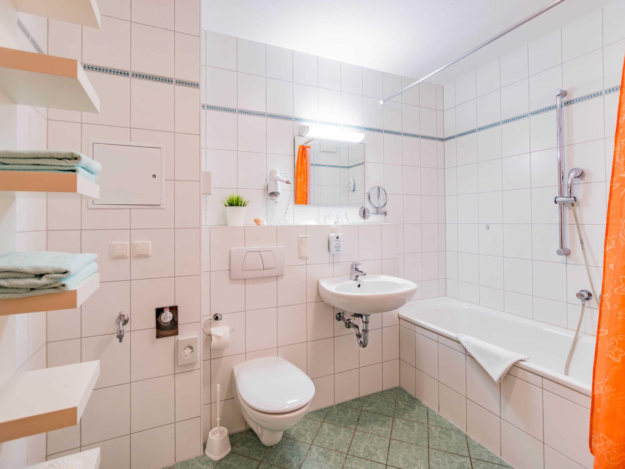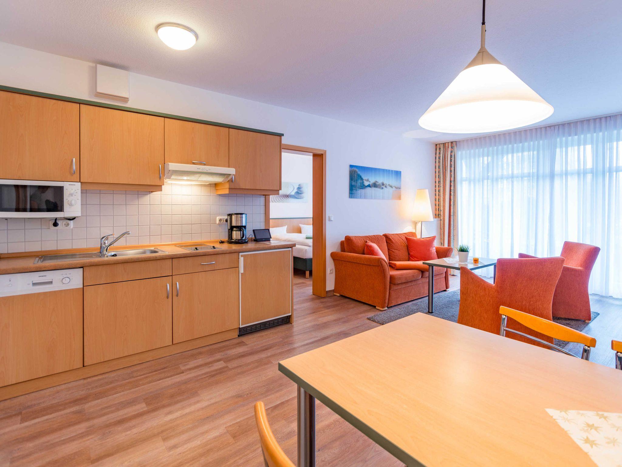 Das 2-Zimmer-Apartment mit Holzoptik-Boden befindet sich im Erdgeschoss des Apartmenthauses Waldeck. Mit rund 50 m² Wohnfläche und einer Terrasse zur Ostseite, besteht das geräumige Apartment aus einem Wohnzimmer mit Schlafcouch und einer voll ausgestatteten Küchenzeile mit Geschirrspülmaschine, Kühlschrank, Mikrowelle, Zwei-Platten-Cerankochfeld, Kaffeemaschine, Wasserkocher und einem Toaster. Das Schlafzimmer verfügt über ein Doppelbett und ein Einzelbett, darüber hinaus bietet es genügend Platz für ein Kinderbett. Im Badezimmer befindet sich eine Badewanne, ein Fön wird Ihnen zur Verfügung gestellt. Das Apartment ist für maximal 3 Erwachsene und insgesamt 4 Personen geeignet, auch Hunde sind gestattet.