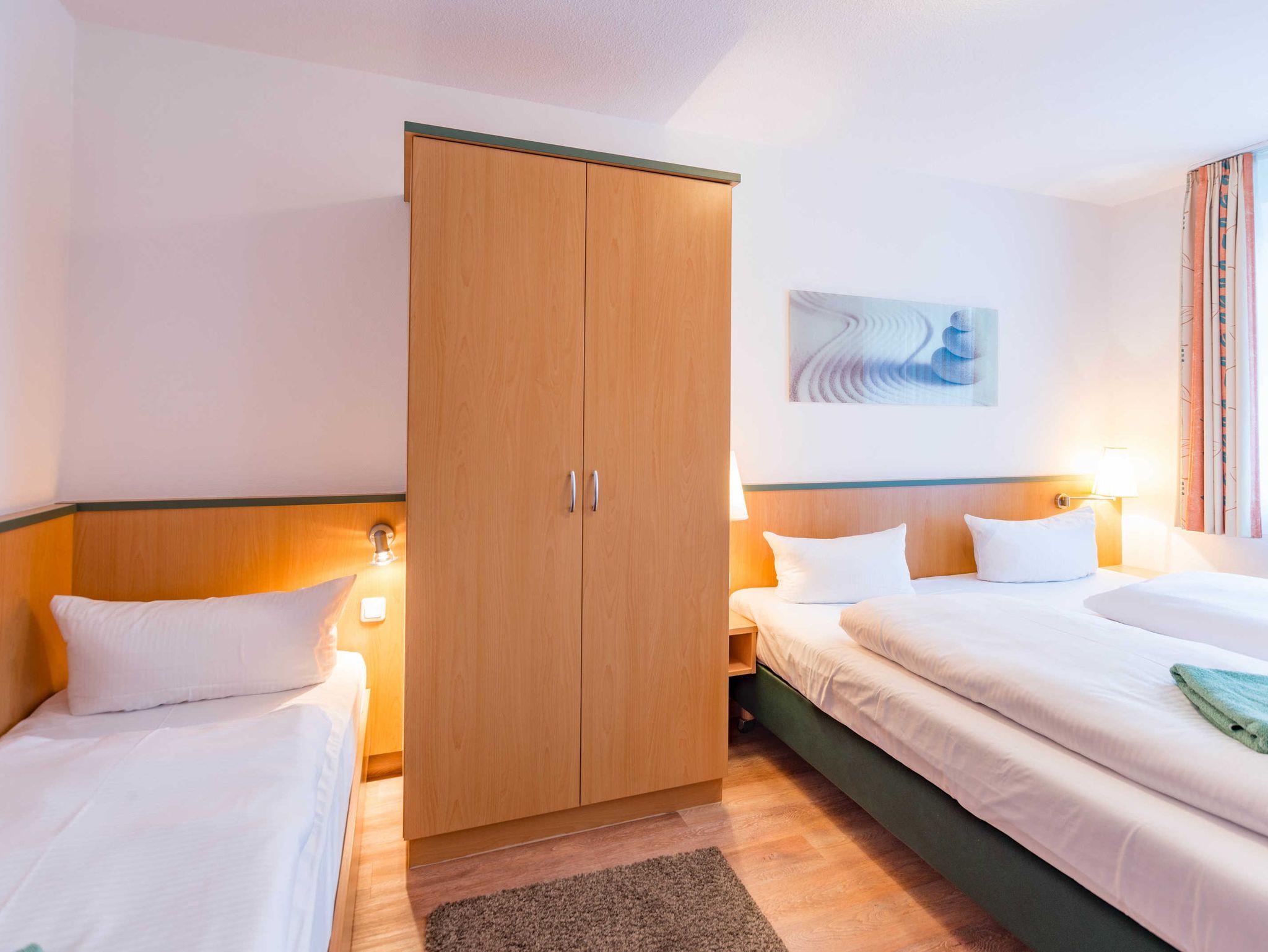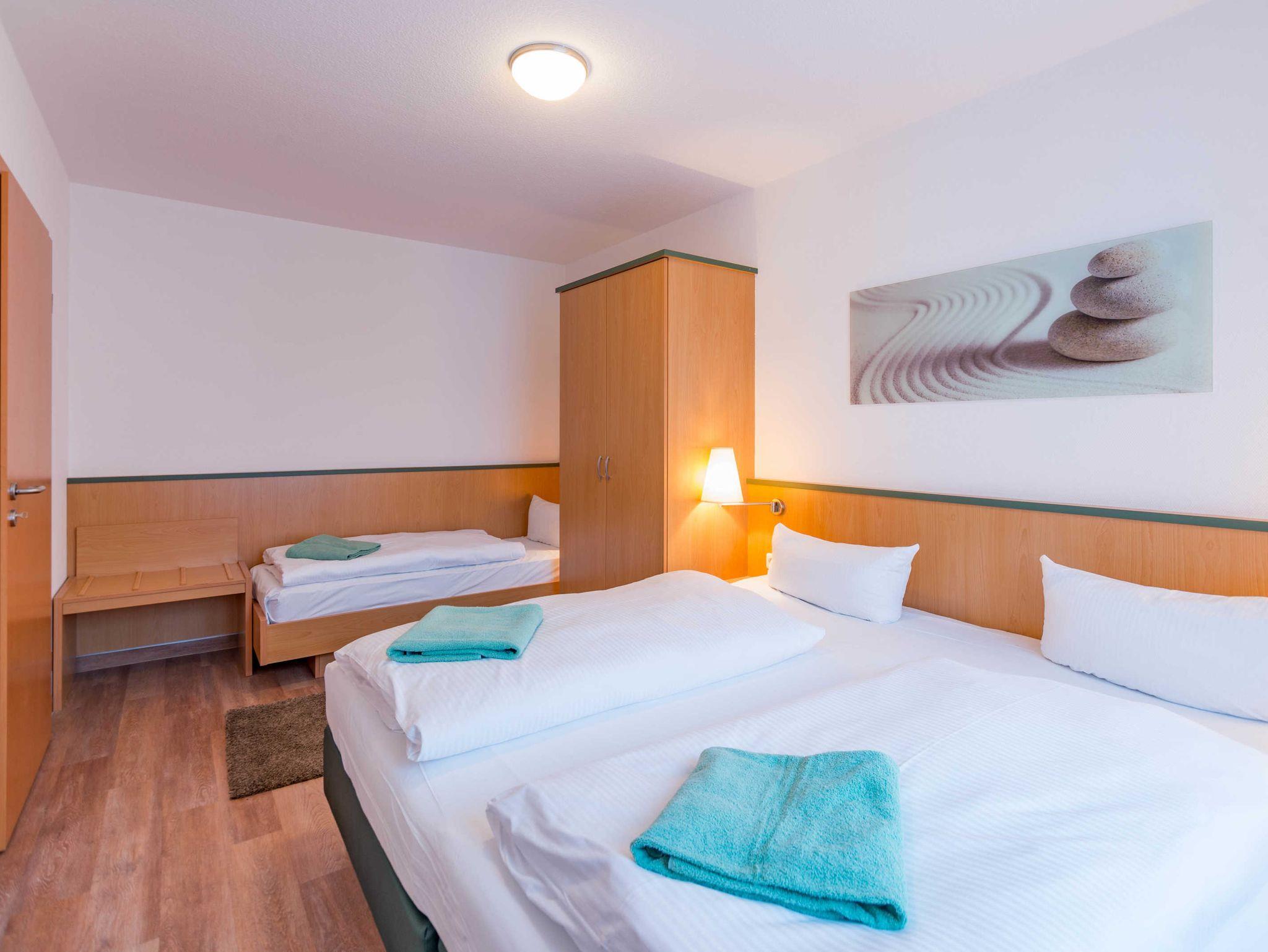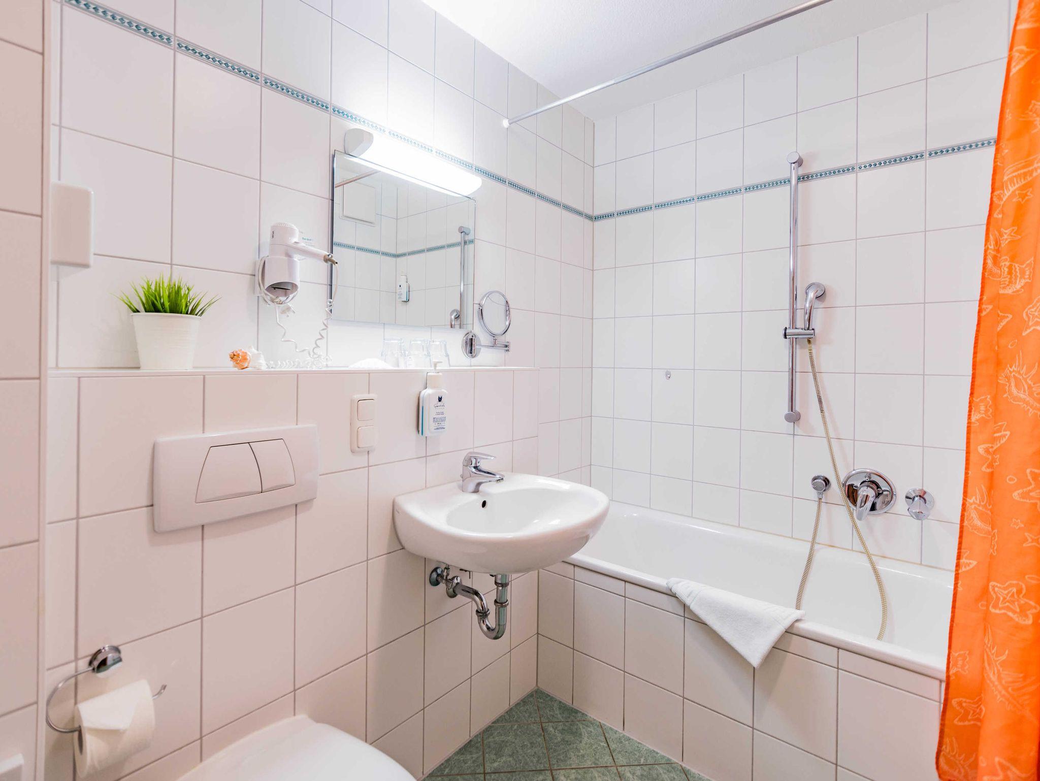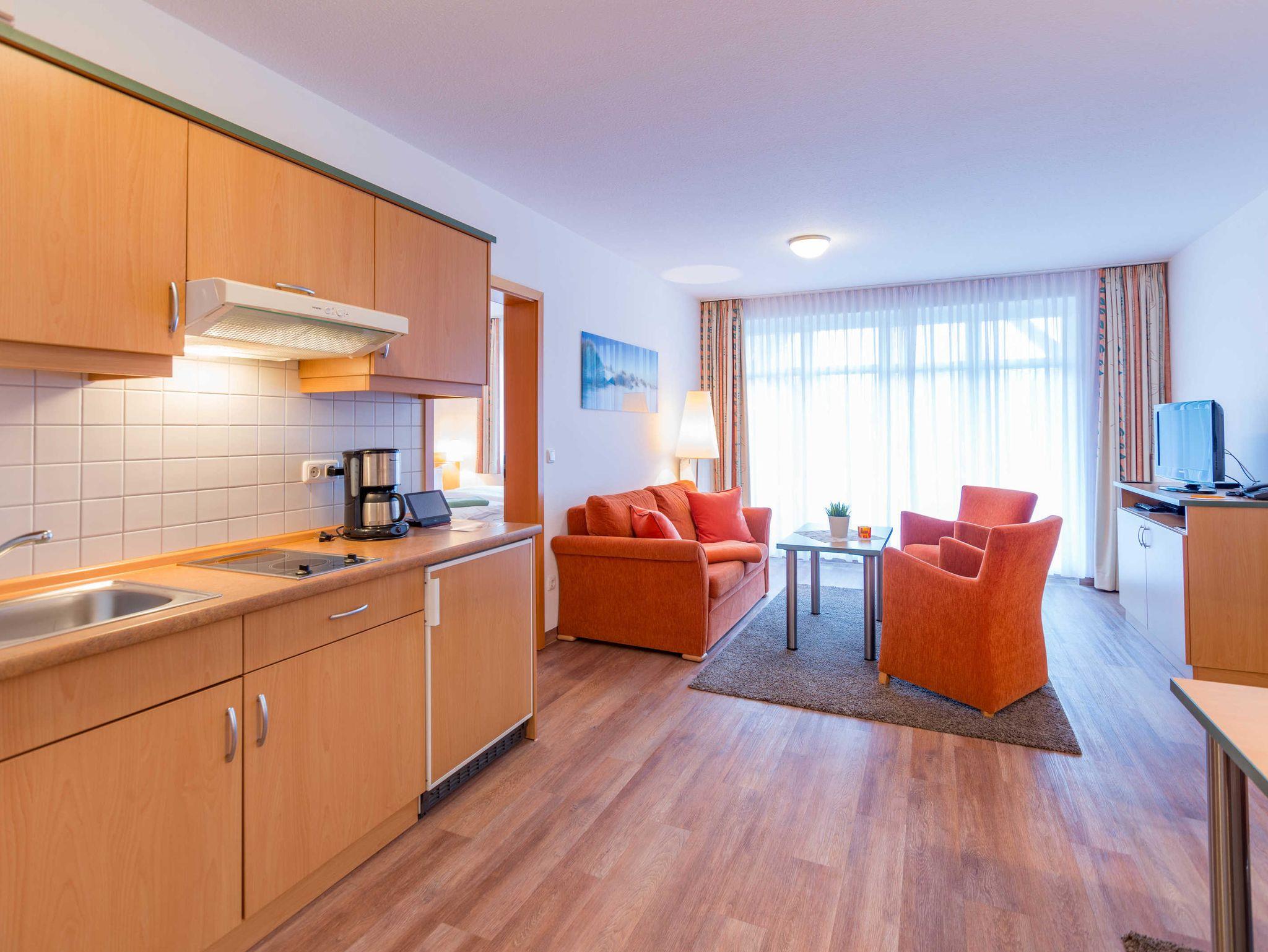 Das 2-Zimmer-Apartment mit Holzoptik-Boden befindet sich im Erdgeschoss des Apartmenthauses Waldeck. Mit rund 50 m² Wohnfläche und einer Terrasse zur Ostseite, besteht das geräumige Apartment aus einem Wohnzimmer mit Schlafcouch und einer voll ausgestatteten Küchenzeile mit Geschirrspülmaschine, Kühlschrank, Mikrowelle, Zwei-Platten-Cerankochfeld, Kaffeemaschine, Wasserkocher und einem Toaster. Das Schlafzimmer verfügt über ein Doppelbett und ein Einzelbett, darüber hinaus bietet es genügend Platz für ein Kinderbett. Im Badezimmer befindet sich eine Badewanne, ein Fön wird Ihnen zur Verfügung gestellt. Das Apartment ist für maximal 3 Erwachsene und insgesamt 4 Personen geeignet, auch Hunde sind gestattet.