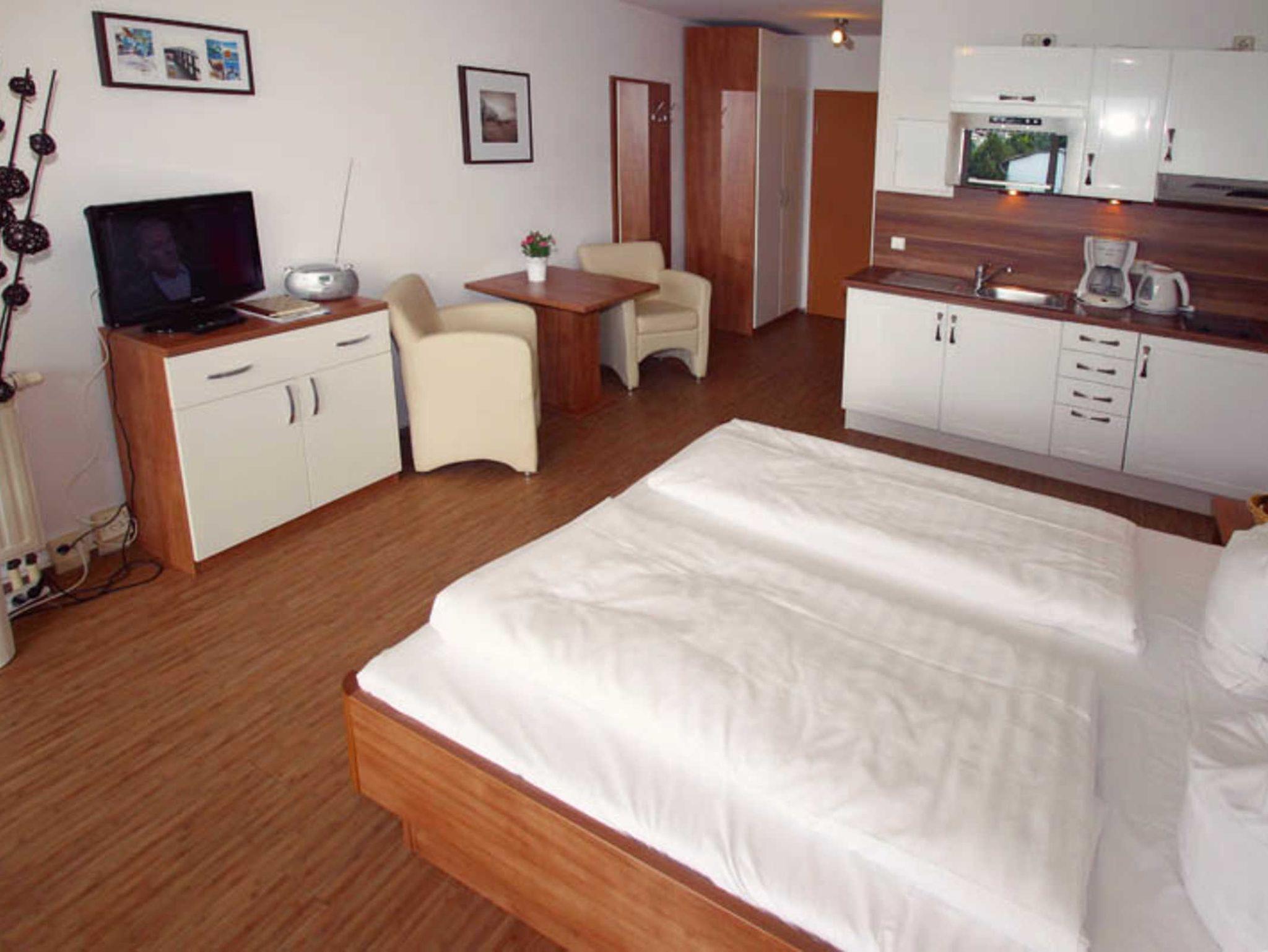 Einrichtung entspricht nicht mehr dem heute üblichen Standard. Schrank, Nachttische, Stühle, Tisch und Beleuchtung gehören auf den Sperrmüll, WLAN und Spülmaschine fehlen!