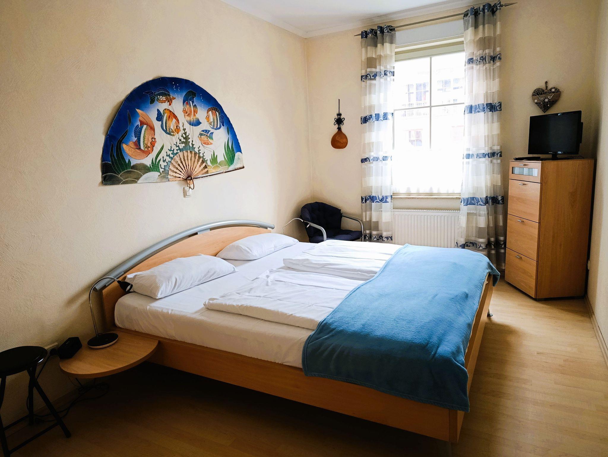Damit haben Sie einen herrlichen großen Raum von knapp 30qm, der hell und lichtdurchflutet ist und an zwei Seiten von Balkonen flankiert wird, auf denen Sie den ganzen Tag die Sonne genießen können (Südwest- und Südost-Lage). Neben dem Wohnzimmer mit Pantry und Essecke besteht die Wohnung aus einem ca. 15 qm großen Schlafzimmer mit Doppelbett, einem Bad mit Dusche und WC, einem Flur sowie einem kleinen Abstellraum für Ihre Gepäckstücke. Im Wohnzimmer befindet sich eine Schlafcouch. Die Küchenecke ist mit Herd, Backofen, Geschirrspüler und Mirkowelle. Toaster, Wasserkocher und Kaffeemaschine ausgestattet.