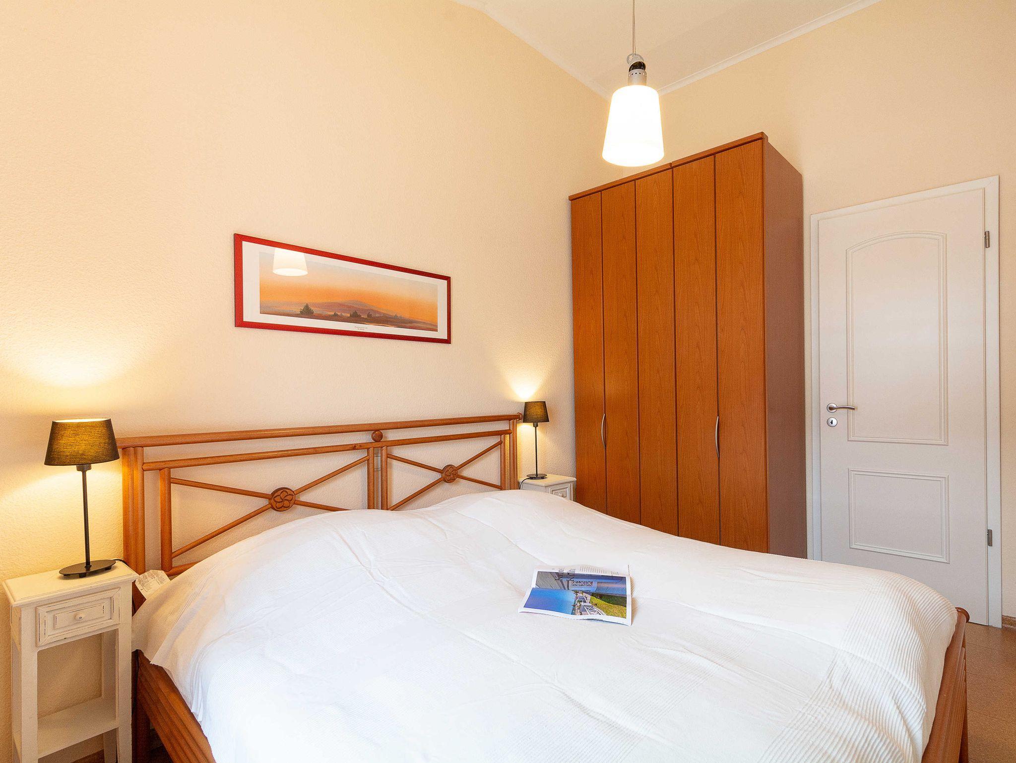 Im Schlafzimmer lädt Sie ein komfortables Doppelbett (2 x 80cm x 200 cm) zur Nachtruhe ein. Der großzügige Kleiderschrank bietet genügend Platz für Ihre Urlaubsgarderobe. Auch von hier können Sie den Balkon betreten.