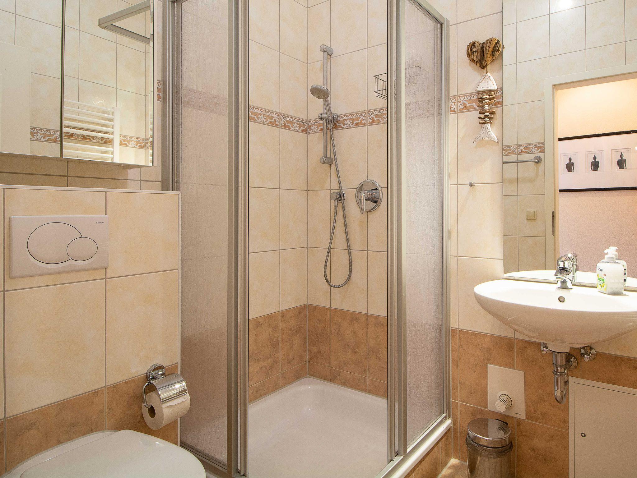 Das geflieste Bad ist ausgestattet mit einer Dusche, Waschbecken und WC. Ein Handtuchheizkörper sorgt für kuschelig warme Handtücher und komplettiert die Badeinrichtung.