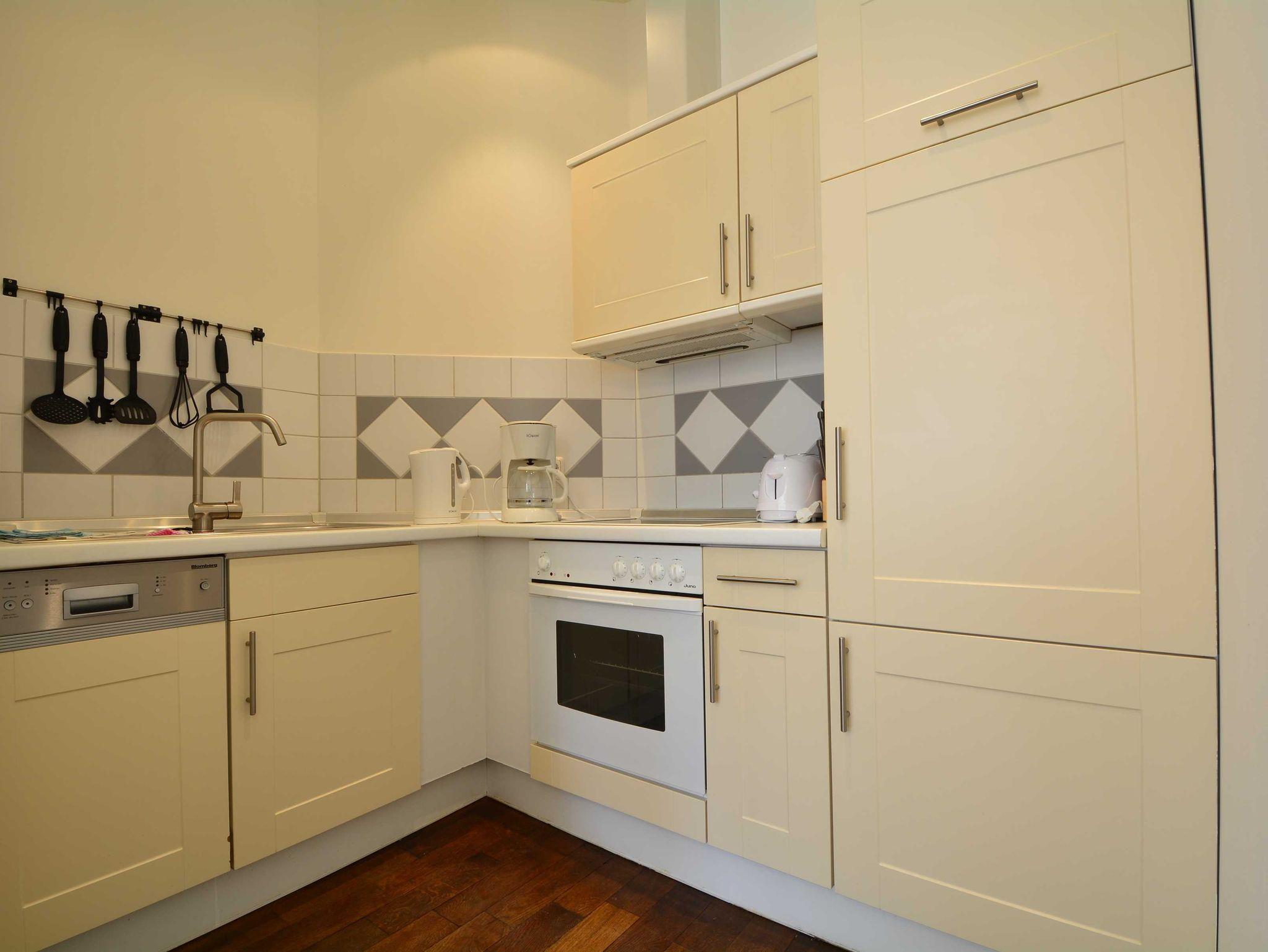 Die offene Küchenzeile bietet alle wichtigen Küchengeräte, die Sie für Ihren perfekten Urlaub an der Ostsee benötigen: Ein Backofen mit Dunstabzug und 4-Zonen-Ceranfeld, ein kleiner Geschirrspüler sowie ein Kühlschrank mit Gefrierfach befinden sich in der gut ausgestatteten Küche. Eine Kaffeemaschine, ein Wasserkocher, ein Toaster sowie genügend Geschirr und Kochutensilien komplettieren die Kücheneinrichtung.