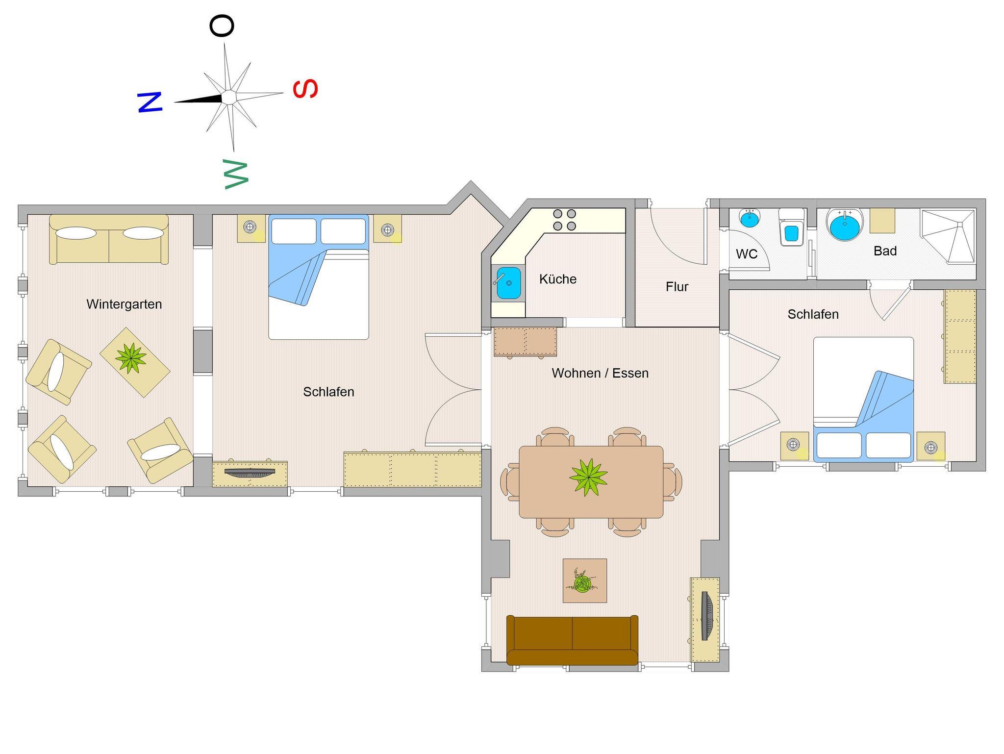 Das erste Schlafzimmer ist nach Norden ausgerichtet und besticht durch den hellen freundlichen Wintergarten, der zur möblierten Nordterrasse führt. Hier können Sie den Abend nach einem erlebnisreichen Tag am Mehr ausklingen lassen oder einfach tagsüber in der Sonne relaxen. Das zweite Schlafzimmer ist nach Süd- Westen ausgerichtet und bietet ebenfalls ein Doppelbett sowie einen geräumigen Kleiderschrank mit Ganzkörperspiegel. Das Bad mit Dusche und WC sowie das Gäste-WC vervollständigen das Gesamtbild dieser Wohnung.