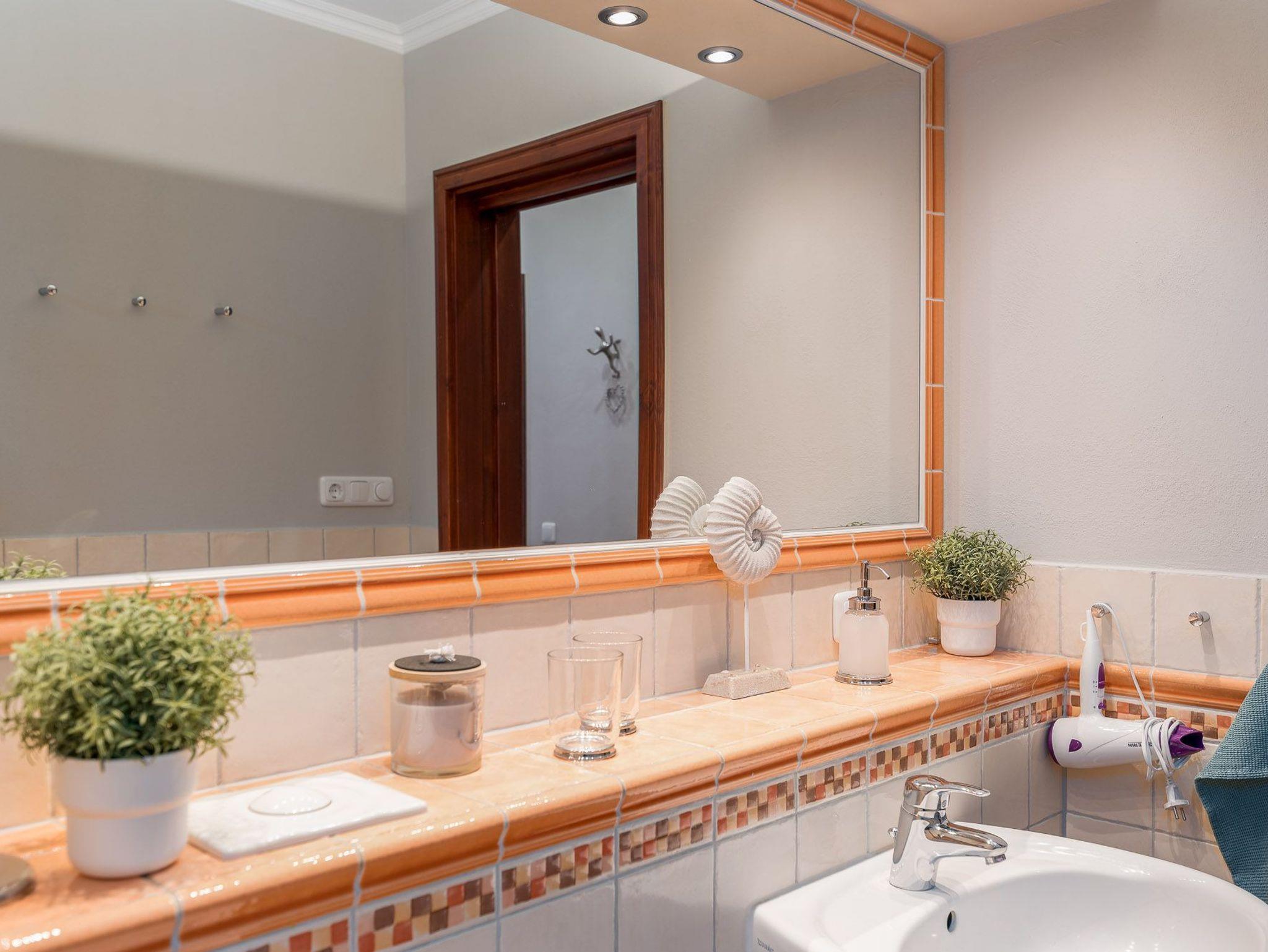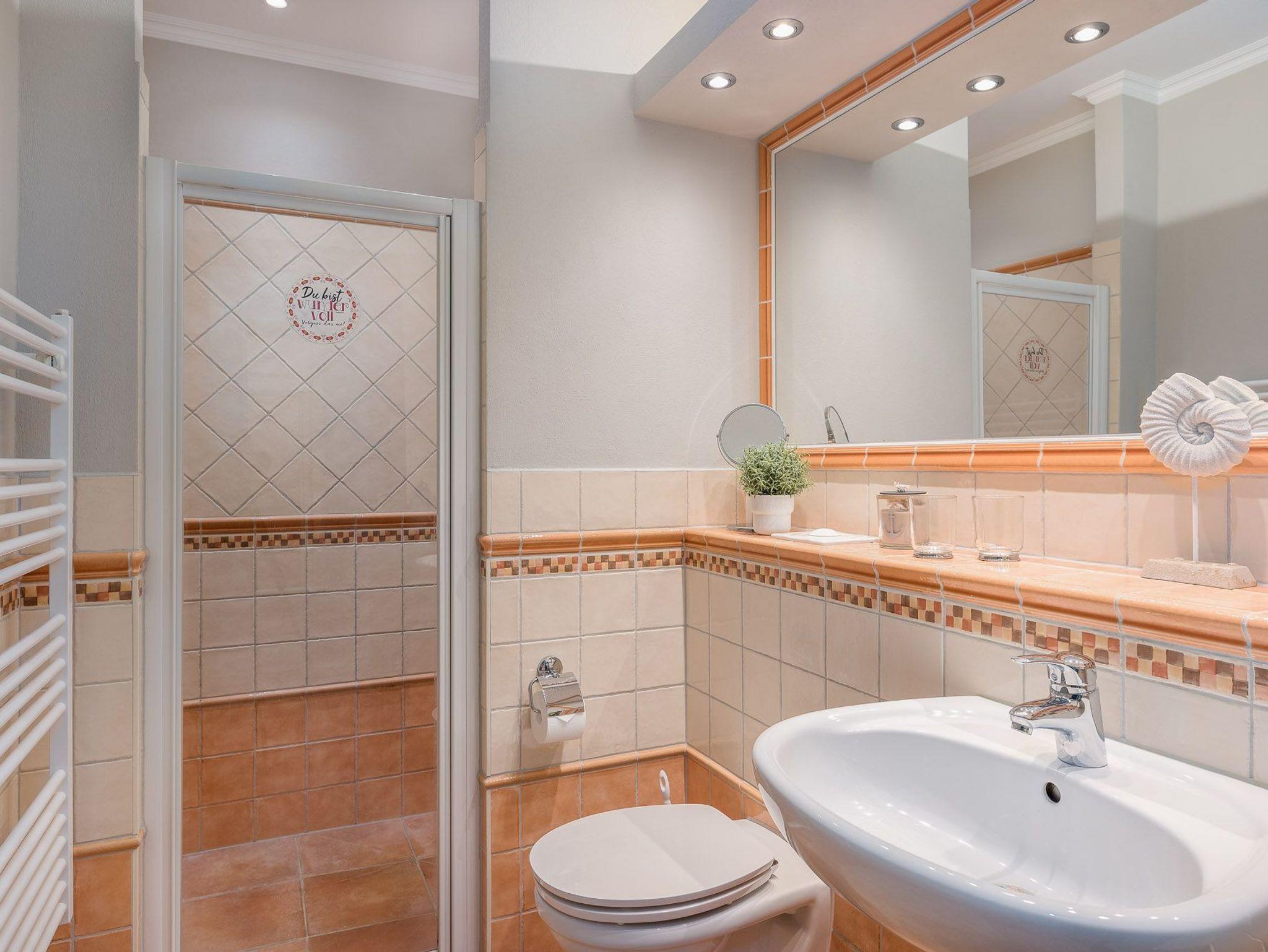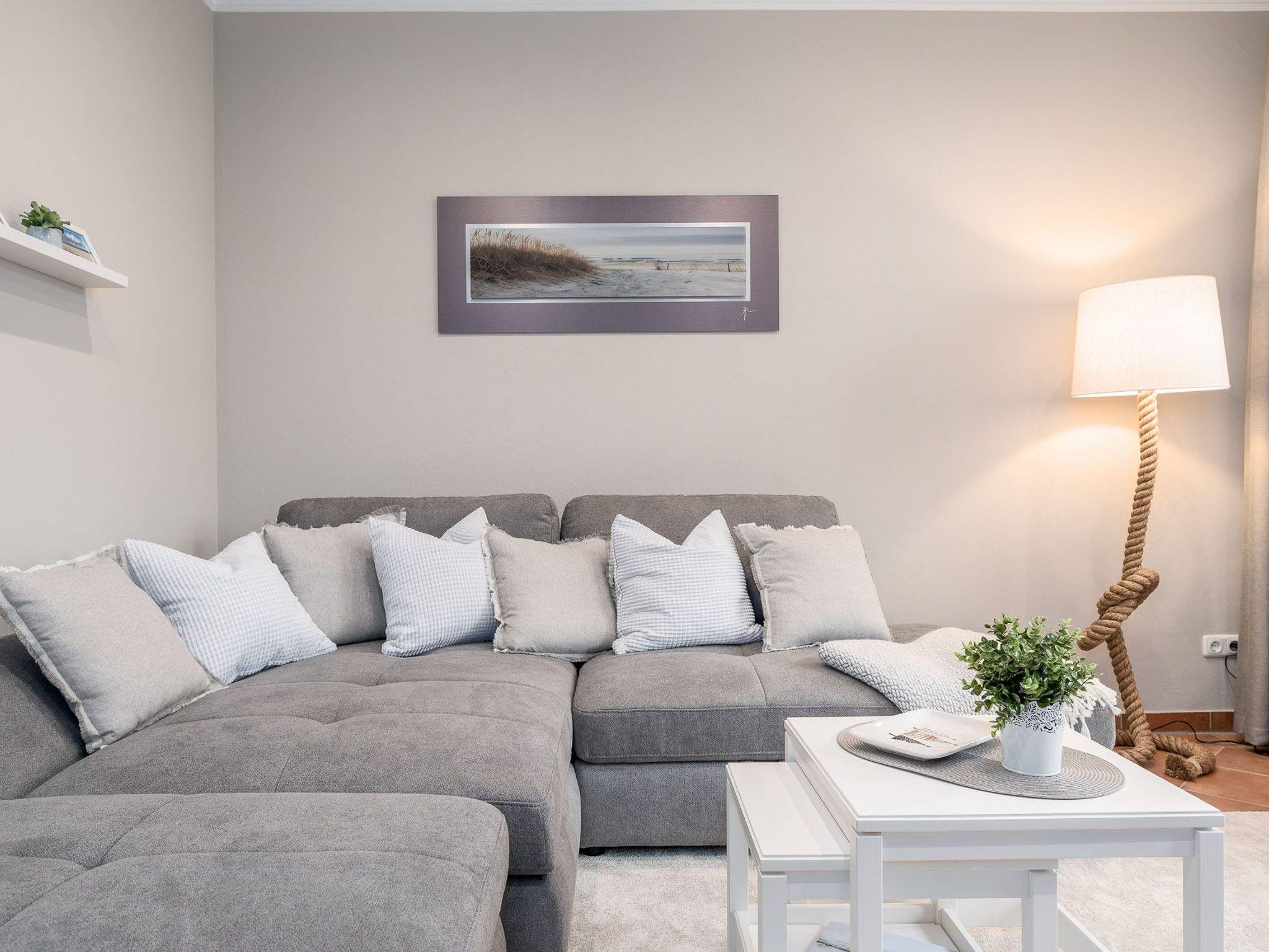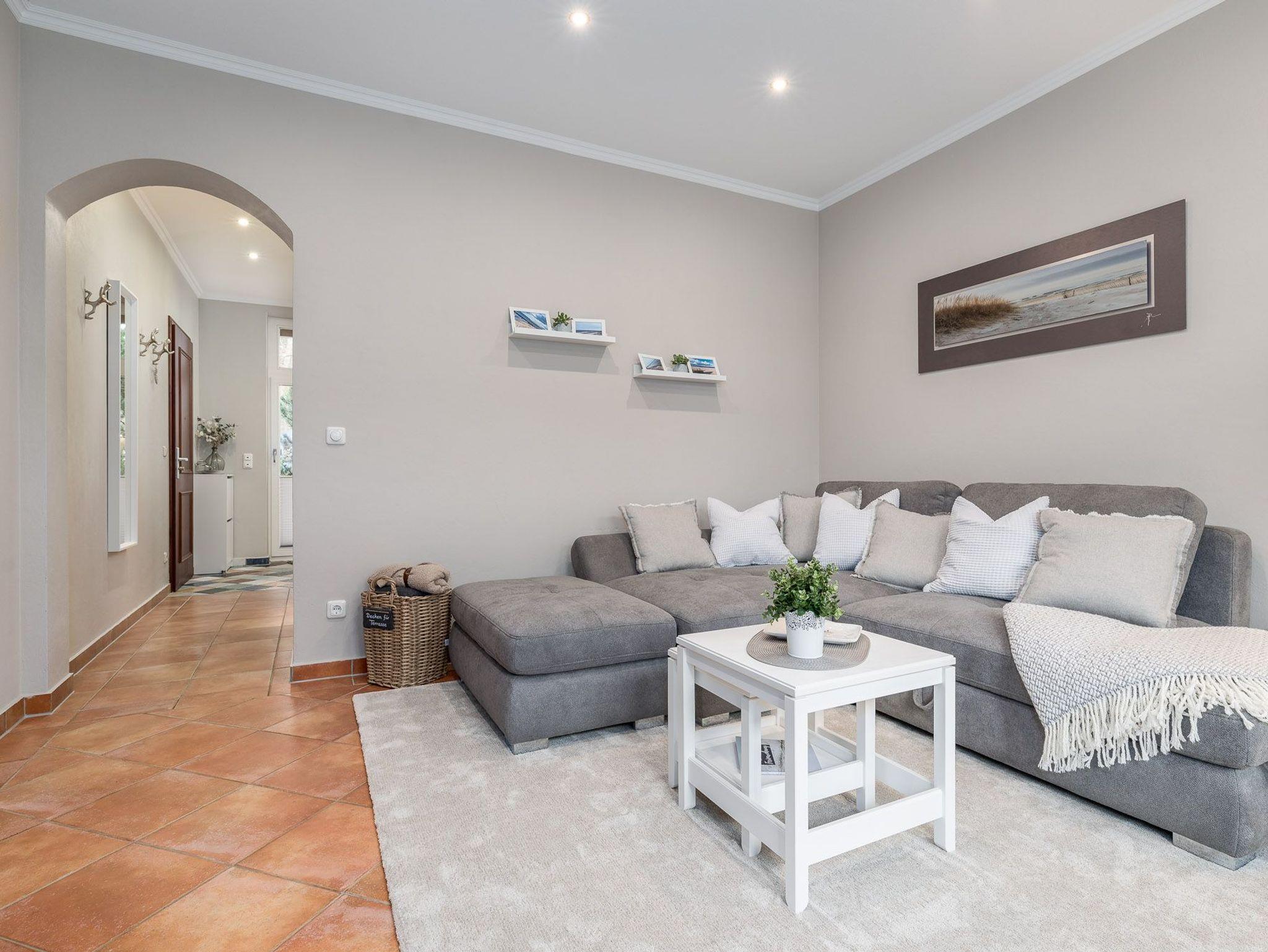 Der Wohnbereich ist hell und gemütlich eingerichtet. Es erwarten Sie ein geräumiges Sofa mit Schlaffunktion (Liegefläche 200 x 200 cm) und ein an der wand montierter großer Flat-TV. Die hochwertige Einbauküche verfügt über eine Kaffeemaschine, einen Toaster, einen Wasserkocher, einen Kühlschrank mit Tiefkühlfach, einen Geschirrspüler und ein 4 Platten Cerankochfeld. Der große Esstisch mit vier Stühlen ermöglicht gemütliches Essen und ist auch bestens geeignet für gesellige Spieleabende. Von der Küche und von dem Wohnraum haben Sie jeweils Zugang zu den Terrassen, die zum Verweilen einladen. Das Schlafzimmer ist mit einem komfortablen Bett (180 x 200 cm / getrennte Matratzen 90 x 200 cm) und einem weiteren Flat-TV ausgestattet. Angrenzend befindet sich ein kleines Ankleidezimmer mit Stauraum für Ihre Mitbringsel. Das Badezimmer mit bodengleicher Dusche besticht mit einem großen Waschtisch mit entsprechendem Spiegel, Toilette und Haartrockner.