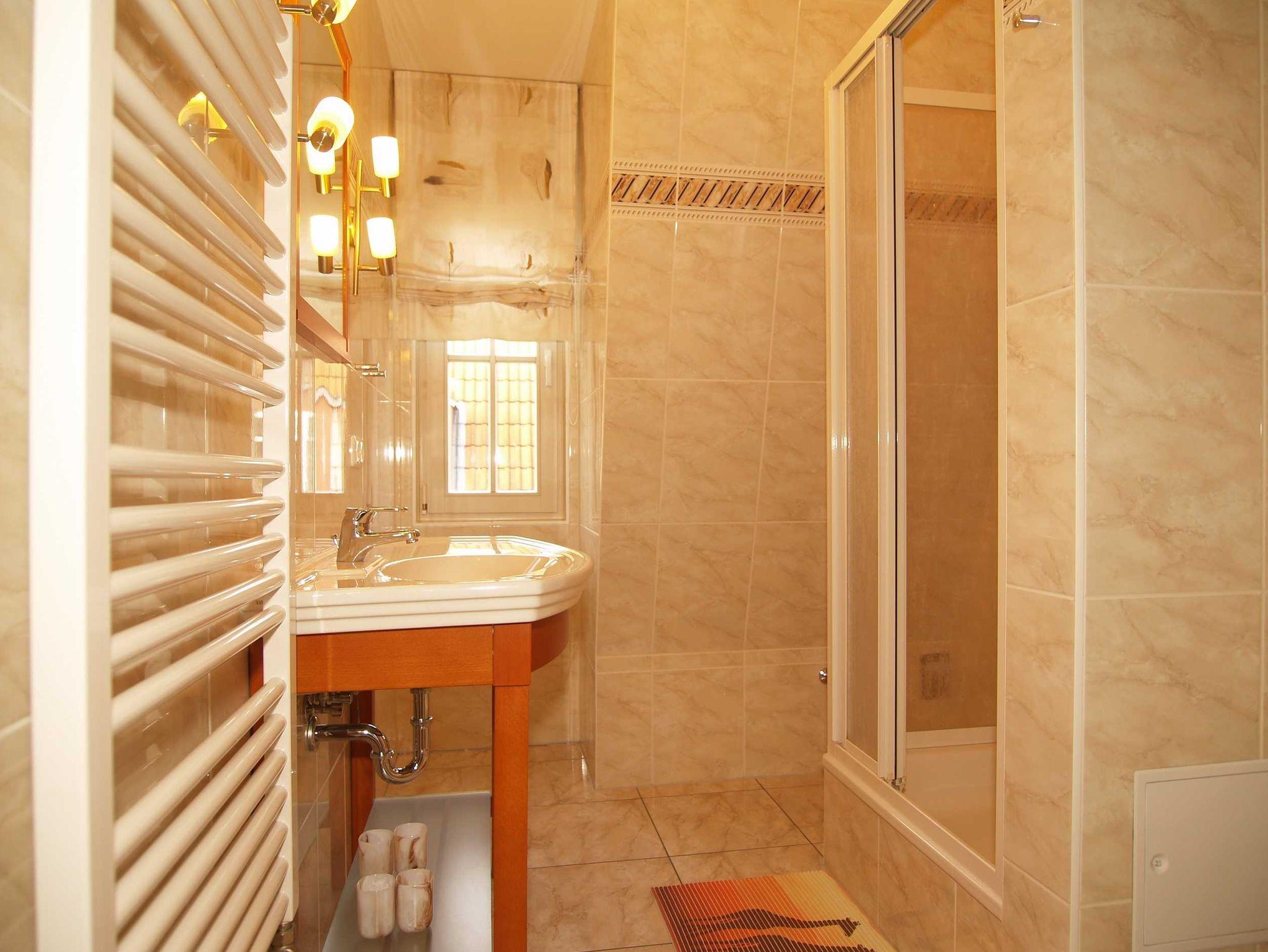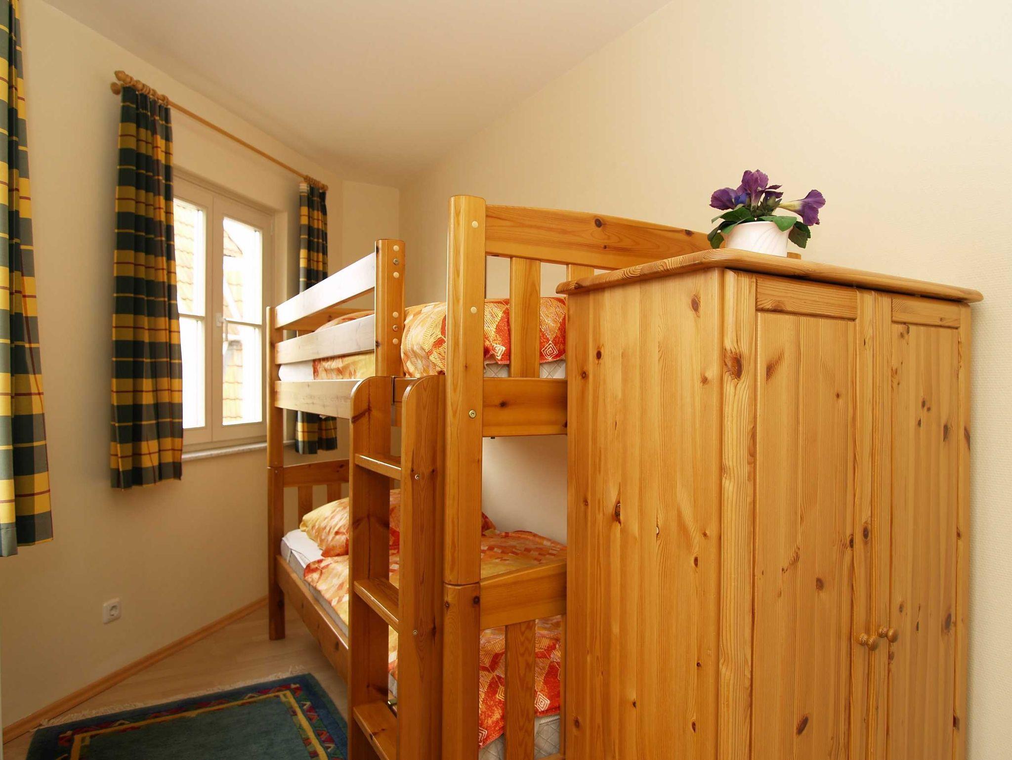 Sie wohnen in einer exklusiv eingerichteten 3-Raum-Wohnung von ca. 55 qm Größe, die im ersten Obergeschoss liegt. Das Wohnzimmer ist ausgestattet mit Küchenzeile (Herd mit Backofen, Geschirrspüler, Kaffeemaschine, Wasserkocher), bequemer Sitzgarnitur, Essecke, Stereoanlage und TV-Gerät. Vom Wohnraum aus betreten Sie den Balkon in Richtung Osten, von wo aus Sie einen seitlichen Blick auf das Meer haben. Ein Schlafzimmer mit Doppelbett und ein Schlafzimmer mit Etagenbett sowie das Bad mit Dusche und WC vervollständigen das Gesamtbild dieser Wohnung.
