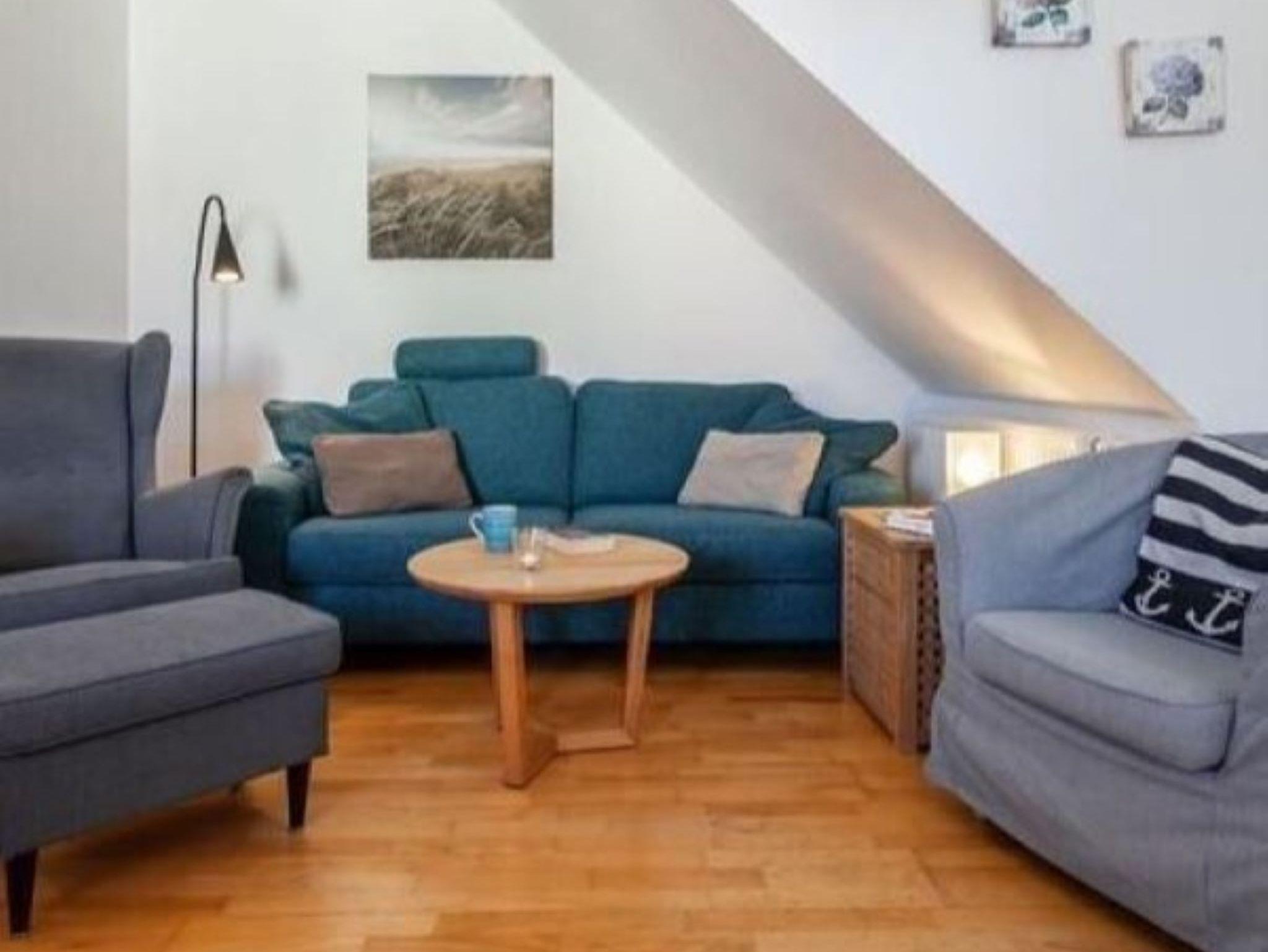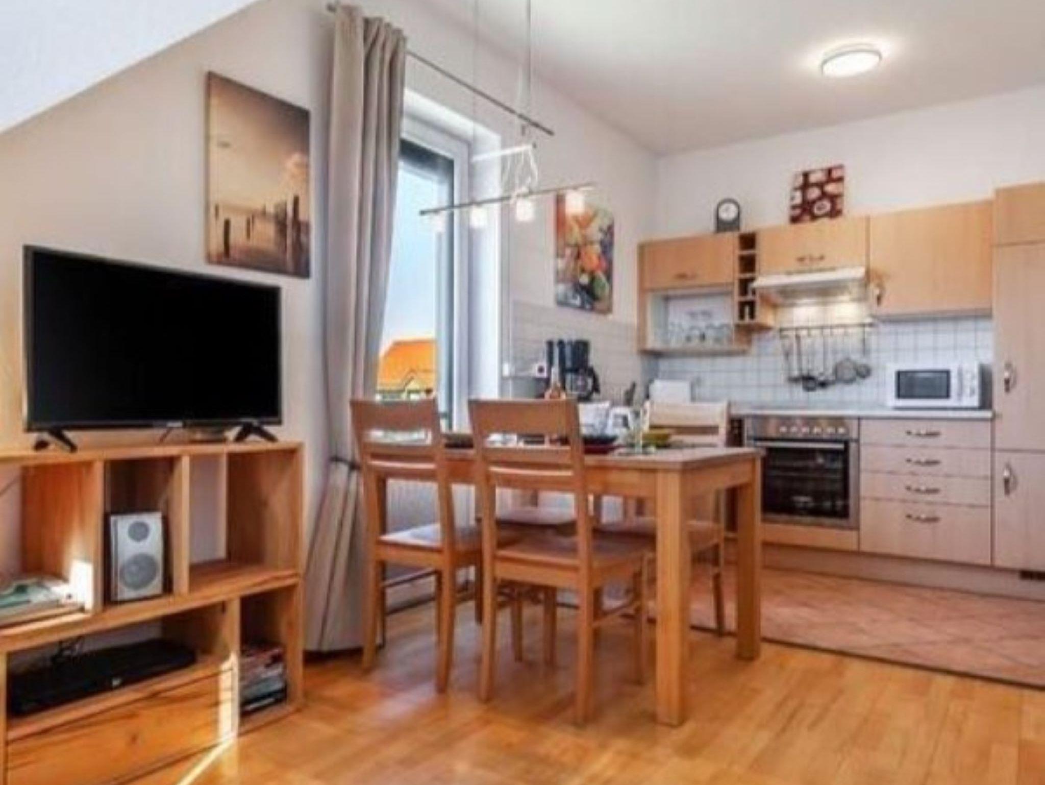 Die ca. 56 qm große Ferienwohnung liegt in der I. Etage hat neben dem Wohnzimmer noch ein Schlafzimmer, ein Kinderzimmer mit 3 Betten,eine Küchenzeile sowie eine Runddusche,eine Waschmaschine und ein Balkon.
