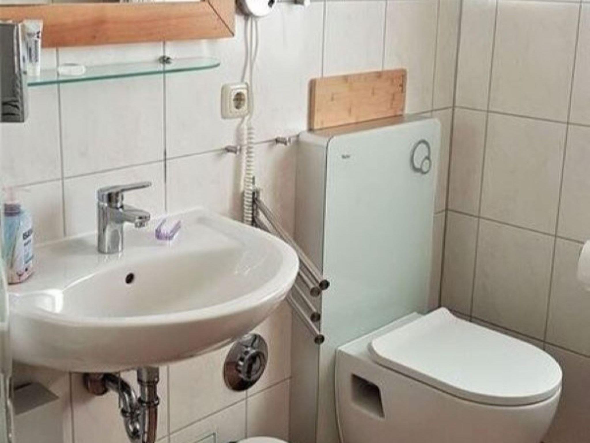 Kühlschrank mit Gefrierfach ausgestattet. Im Bad steht auch eine