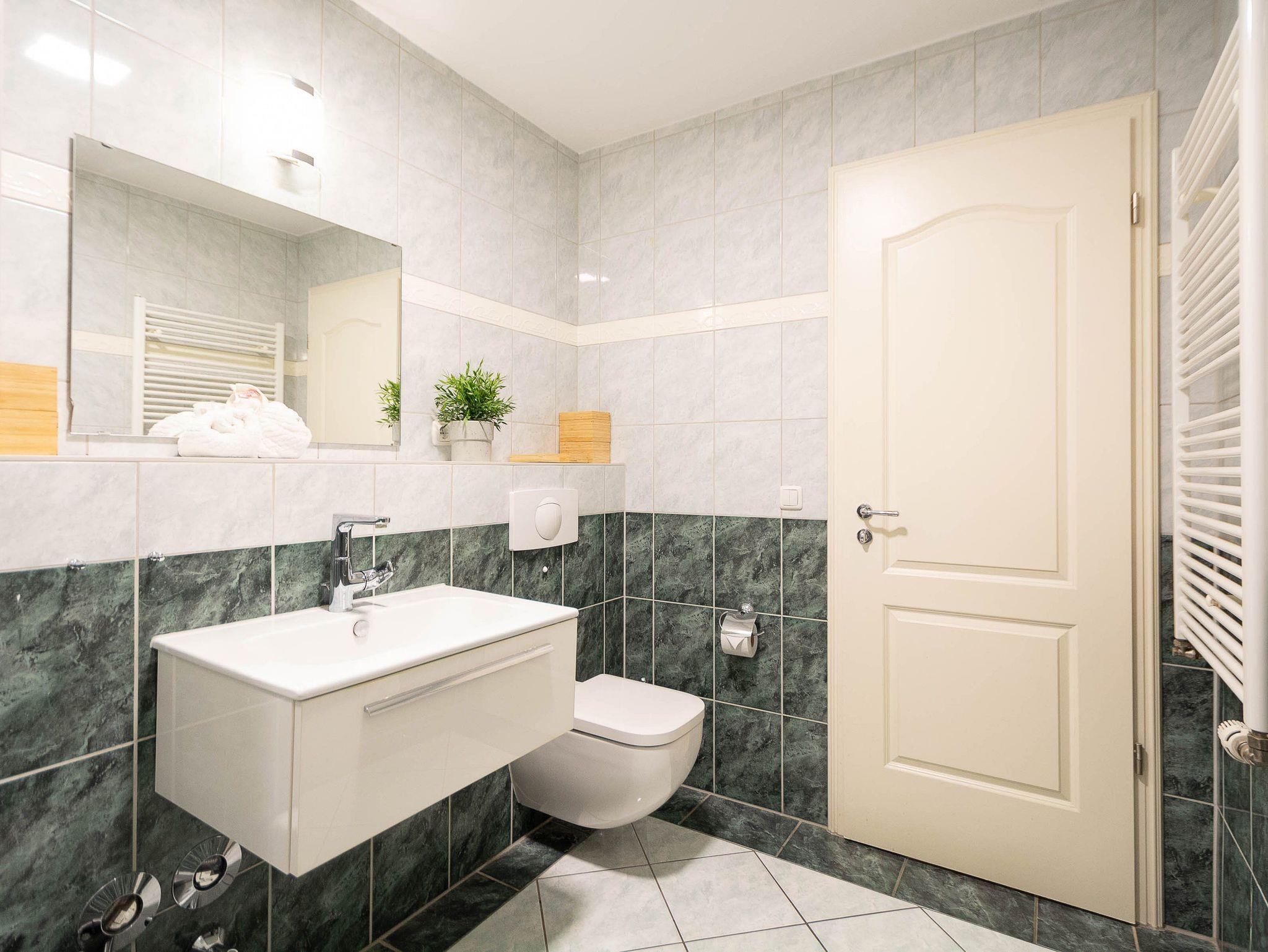 Das Badezimmer ist mit einer Duschwanne, einem Waschbecken, einem WC sowie einem Handtuchheizkörper ausgestattet. Ein Fön und ausreichend Ablageflächen runden die komfortable Ausstattung ab.