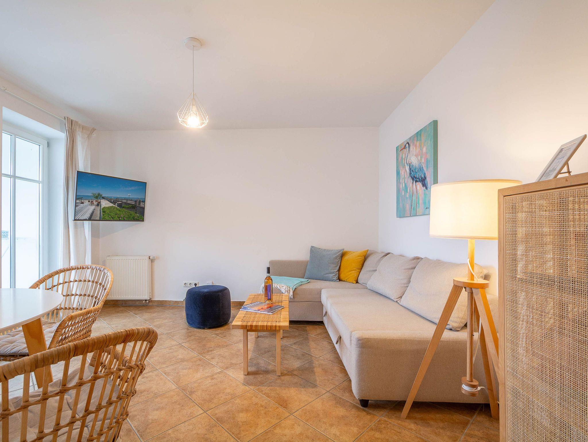 Im großzügigen Wohnbereich erwartet Sie eine gemütliche Sitzgarnitur, ein Esstisch für gemeinsame Mahlzeiten sowie ein Flachbildfernseher für entspannte Stunden. Von hier aus gelangen Sie auf den sonnigen Balkon mit West-Ausrichtung, auf dem Sie das bunte Treiben in der Poststraße beobachten und am Abend den Tag bei einem Glas Wein ausklingen lassen können.