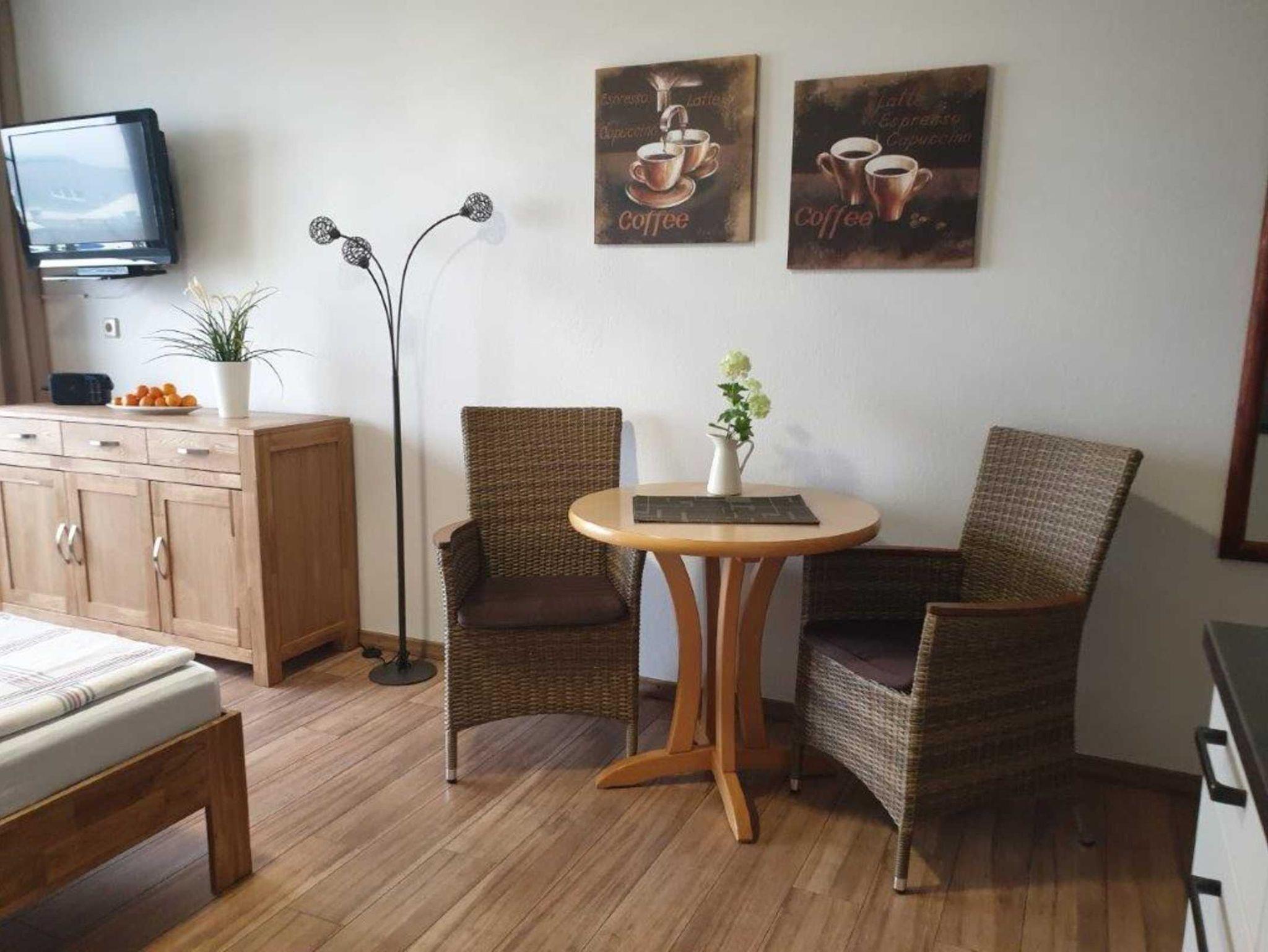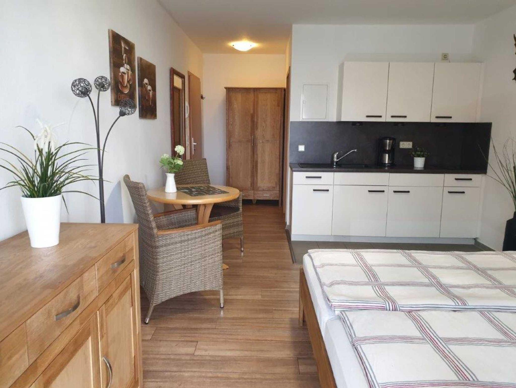 Einrichtung entspricht nicht mehr dem heute üblichen Standard. Schrank, Nachttische, Stühle, Tisch und Beleuchtung gehören auf den Sperrmüll, WLAN und Spülmaschine fehlen!