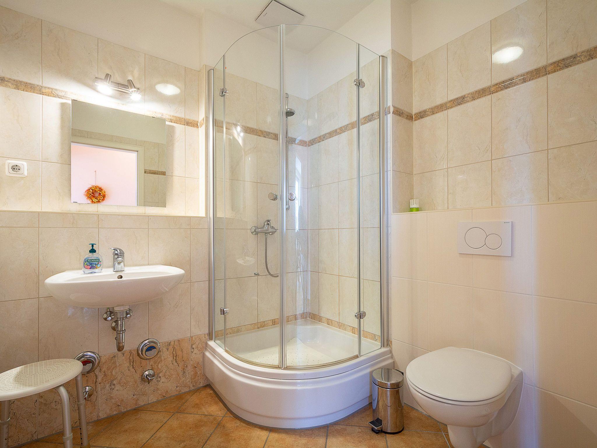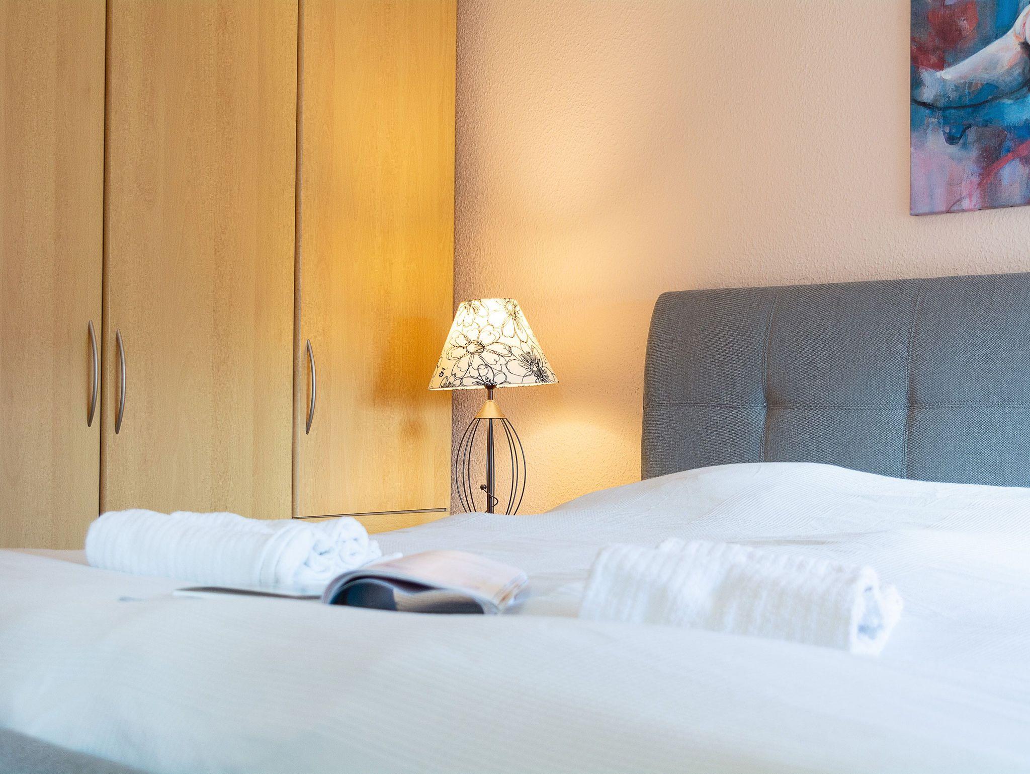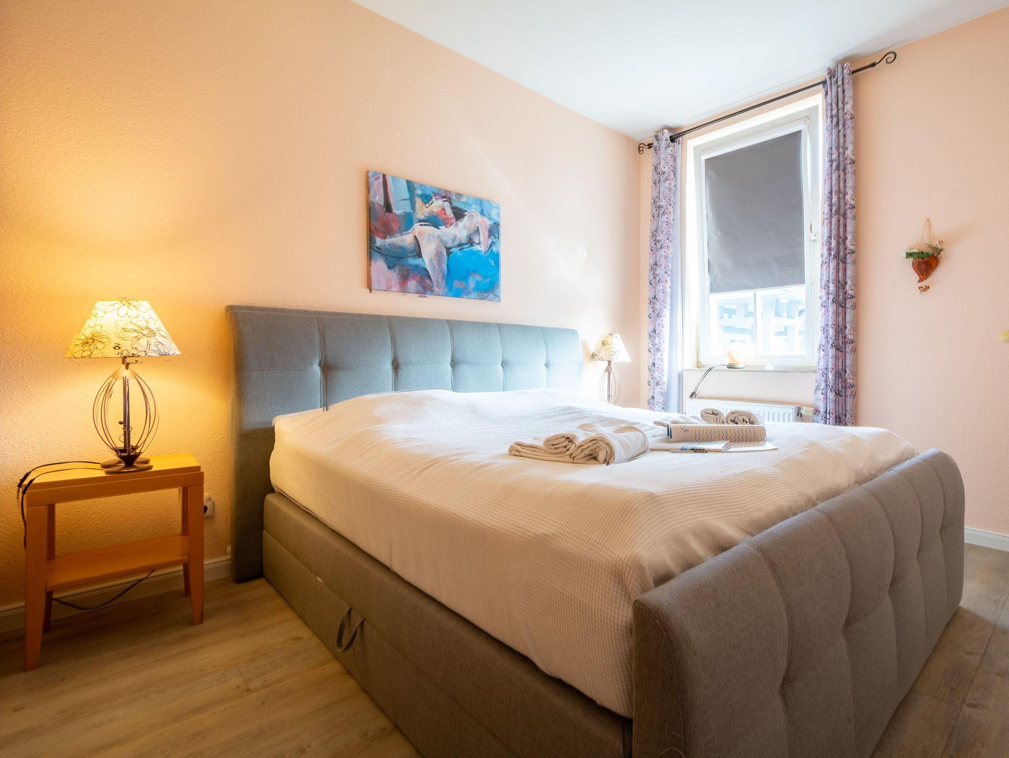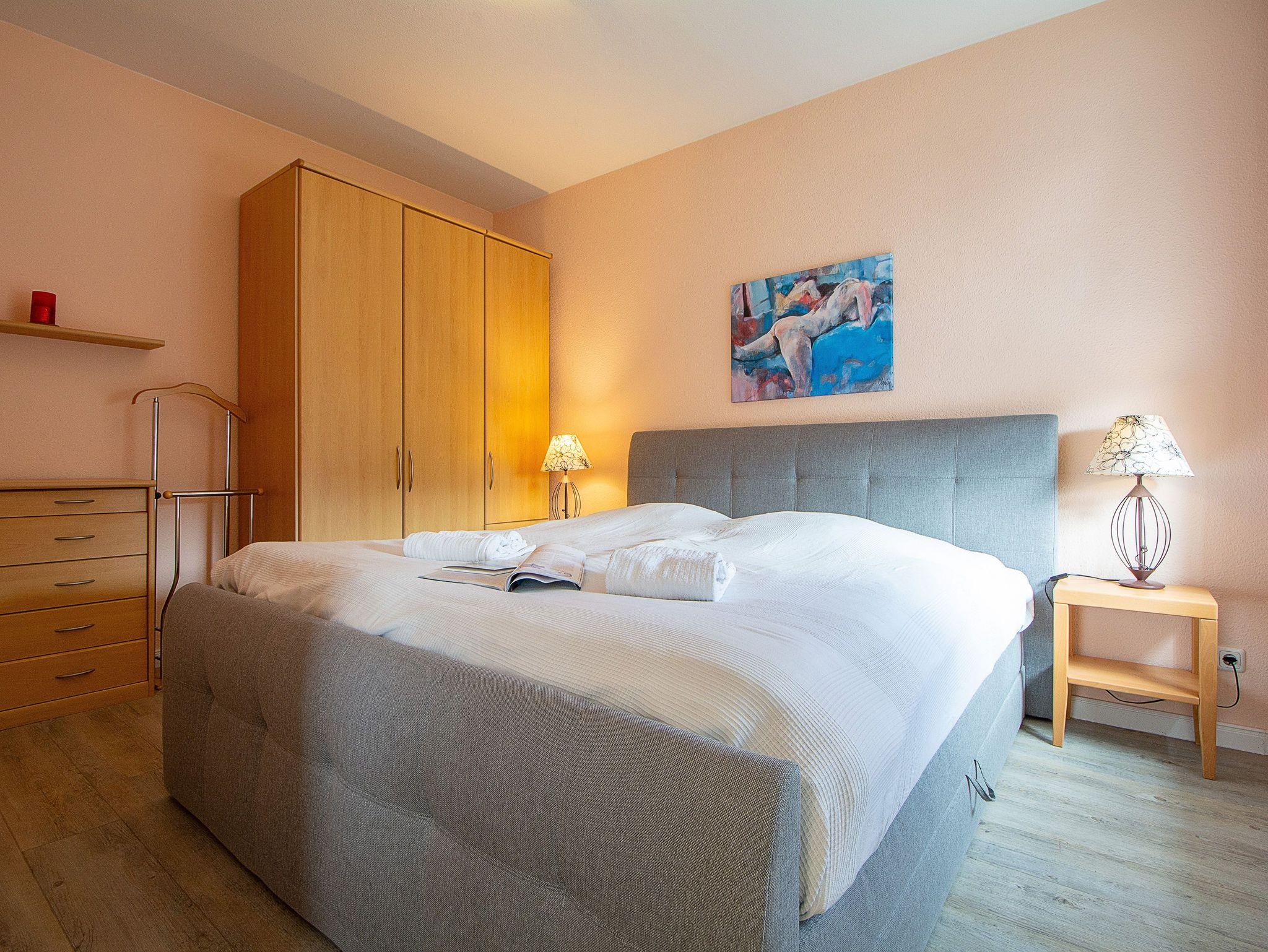 Das gemütliche Schlafzimmer bietet ein modernes Boxspringbett für erholsamen Schlaf. Ein großzügiger Kleiderschrank mit viel Platz für Ihre Urlaubsgarderobe, eine Kommode sowie ein praktischer Herrendiener sorgen für Komfort. Für angenehme Ruhe sorgt das Verdunklungsrollo, das die Nächte wunderbar dunkel macht. Das moderne Badezimmer ist mit Dusche und WC ausgestattet und rundet das Gesamtbild dieser charmanten Ferienwohnung ab.
