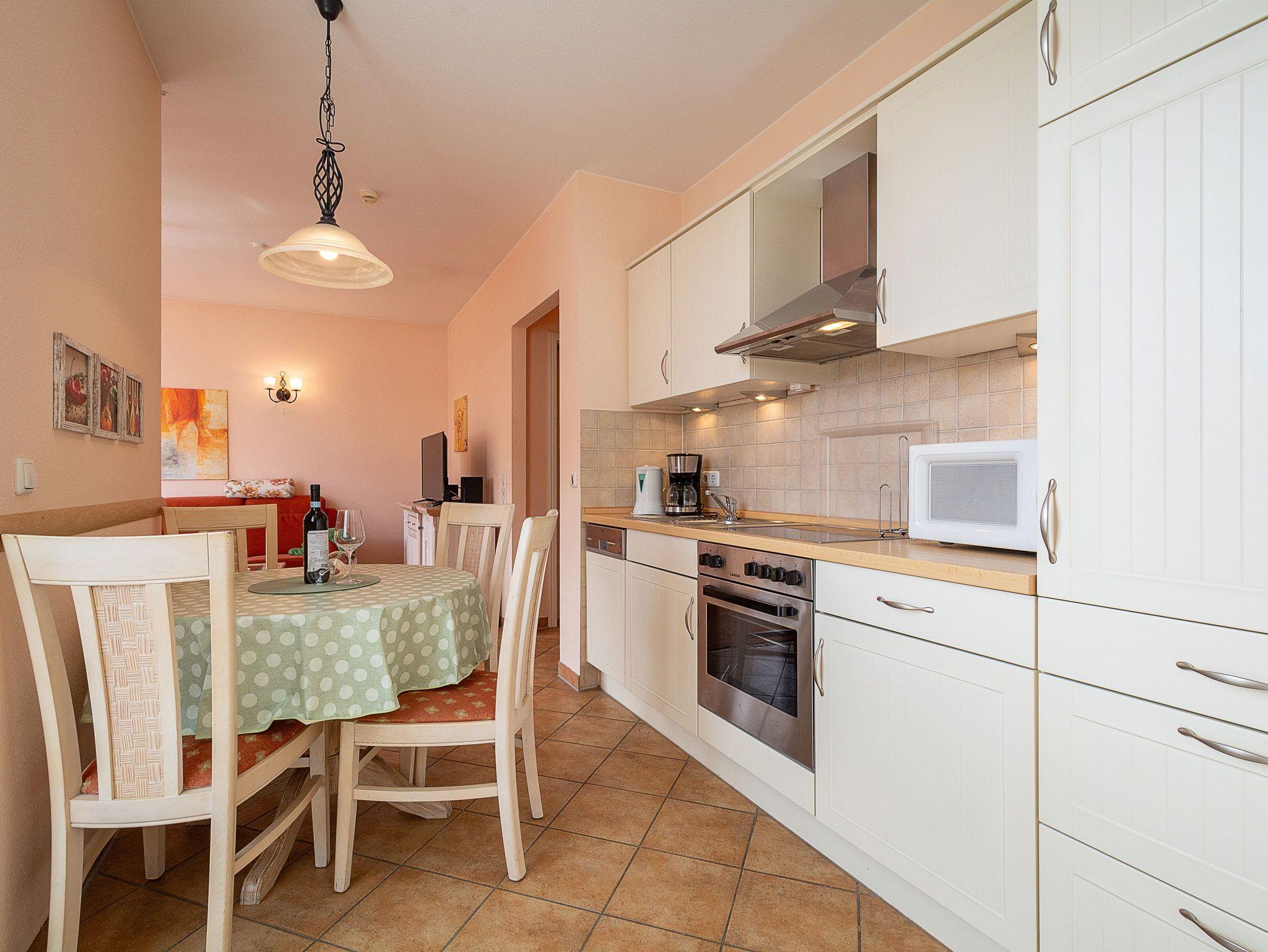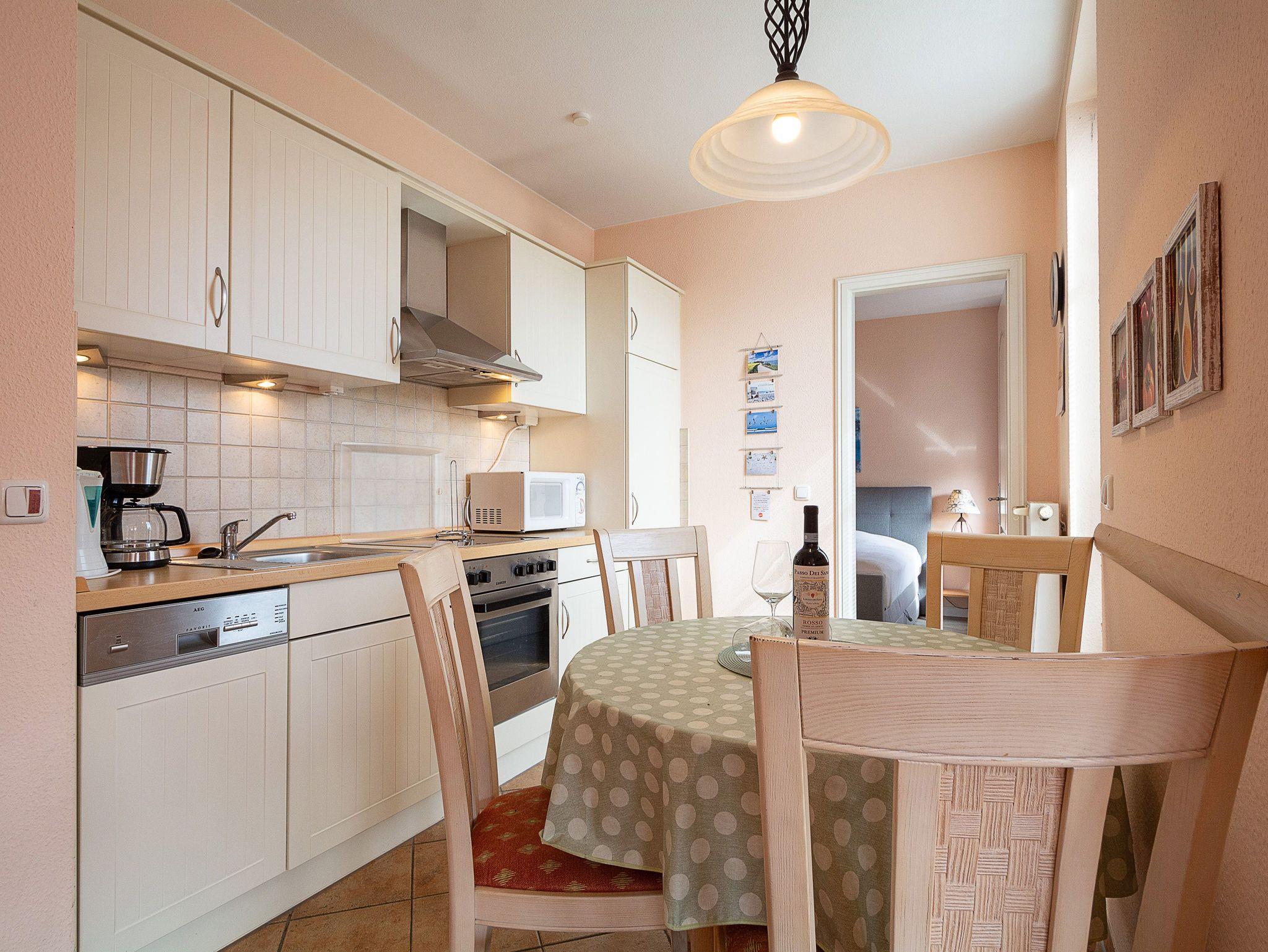 Die offene Küchenzeile im modernen Landhausstil ist voll ausgestattet und lässt keine Wünsche offen: Ein 4-Zonen-Cerankochfeld, Dunstabzug, Backofen, Geschirrspüler, Mikrowelle und Kühlschrank sowie Kaffeemaschine, Wasserkocher und Toaster sorgen dafür, dass Sie sich jederzeit kulinarisch verwöhnen können. Vom Wohn- und Essbereich aus gelangen Sie direkt auf den möblierten Balkon, der nach Osten ausgerichtet ist. Hier können Sie in den Tag starten und Ihr Frühstück in der Morgensonne genießen oder nach einem erlebnisreichen Tag am Meer mit einem Glas Wein den Abend entspannt ausklingen lassen.