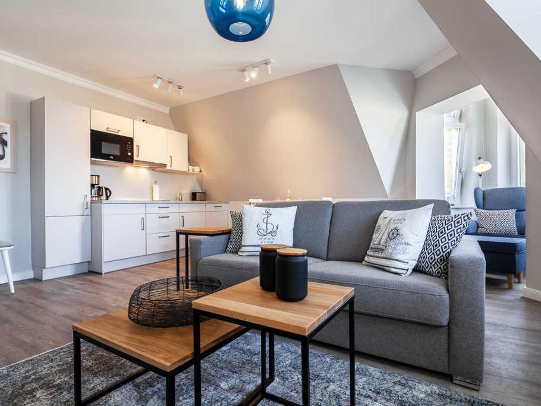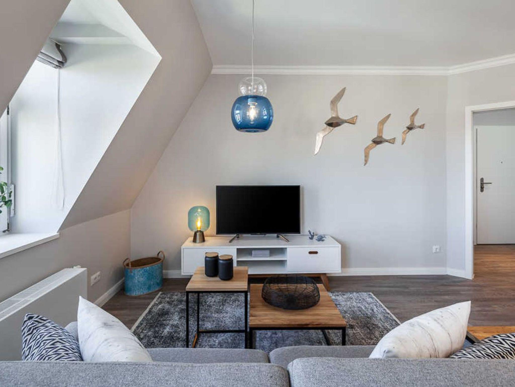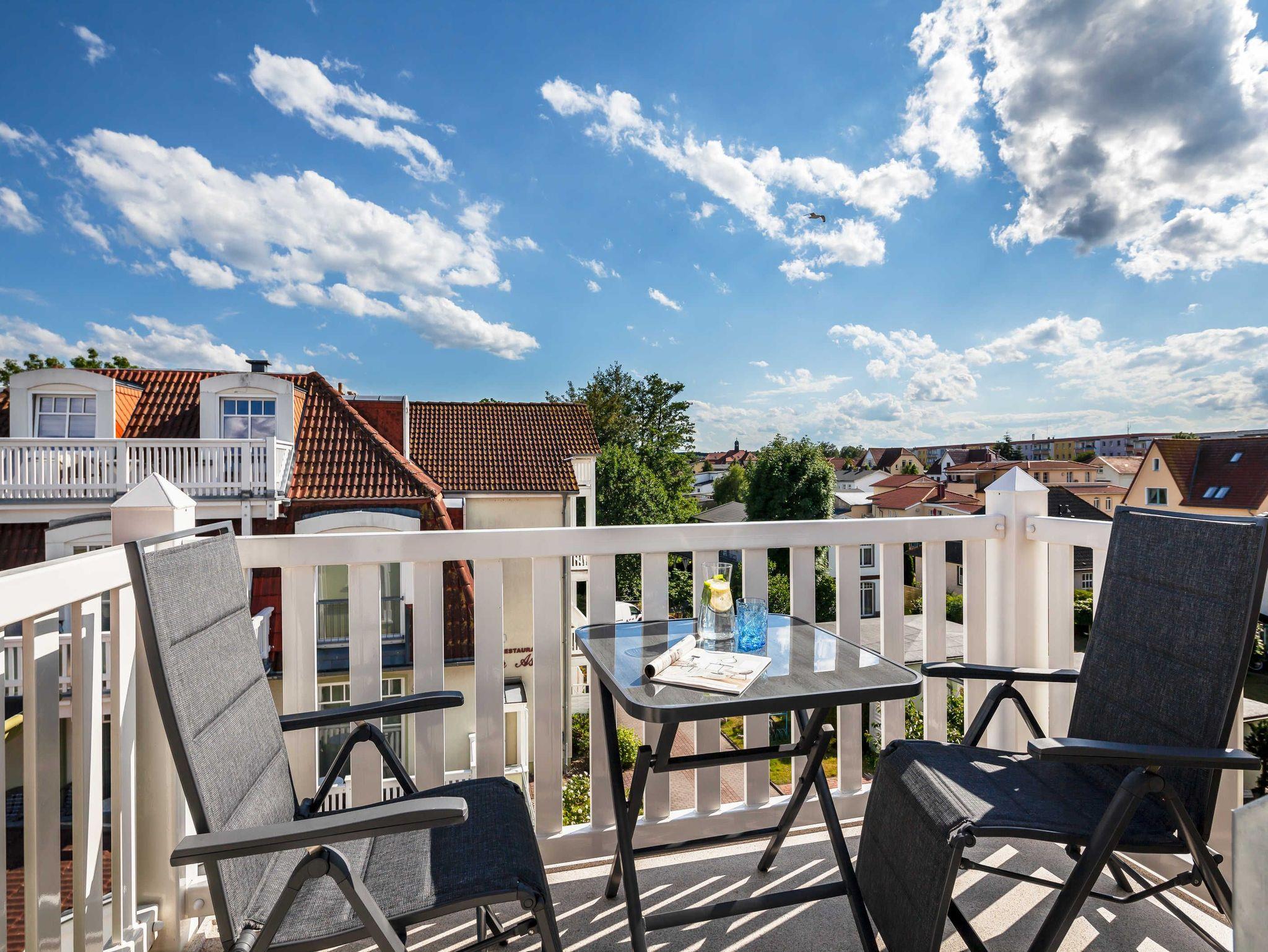 Nur 150 m vom Strand wohnen Sie in einer 2-Raum-Ferienwohnung. Die 51 qm große Wohnung liegt in der 2. Etage. Das Wohnzimmer ist mit einer Couch, Couchtisch, Sessel, Anrichte, mit Kabel-TV, Radio, Essbereich (Tisch und Stühle) und Küchenzeile ausgestattet. Der Balkon mit Tisch und Stühle geht zur Südseite. Im Schlafzimmer stehen ein Doppelbett und ein Kleiderschrank. Die Küchenzeile wurde ausgestattet mit Mikrowelle, Kühlschrank, Kaffeemaschine, Ceran-Kochfeld, Geschirrspüler, Toaster und Wasserkocher. Das Bad mit ebenerdiger Dusche und WC komplettiert die Wohnung.
