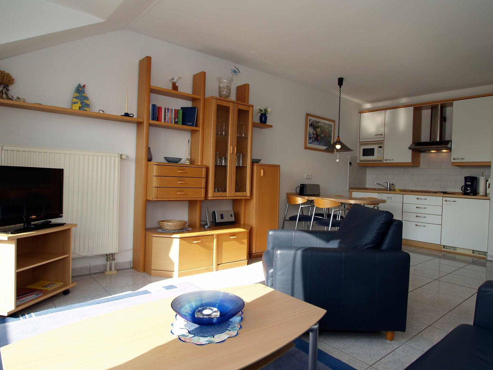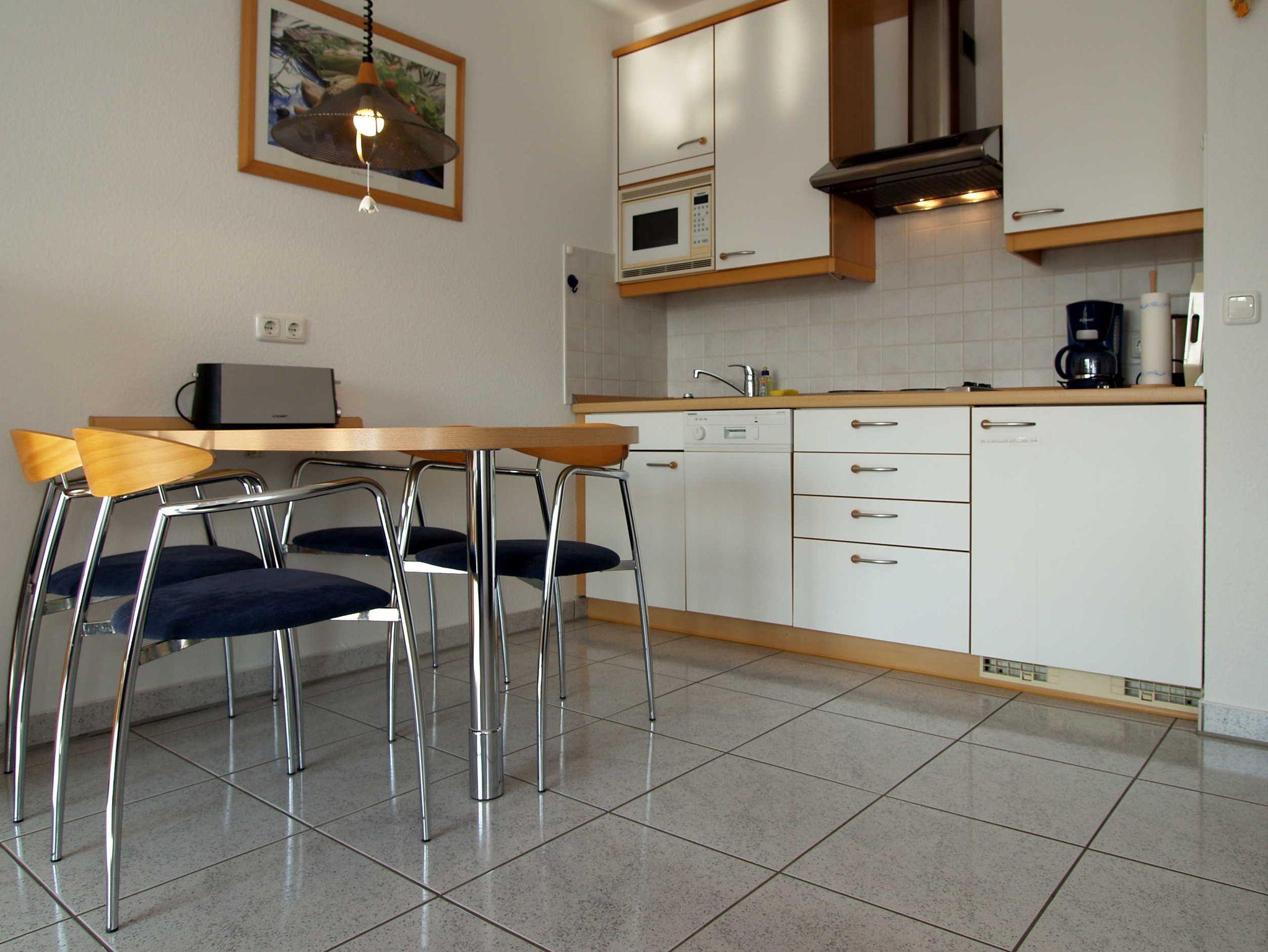 Die offene Küchenzeile hält für Sie alle wichtigen Küchengeräte und -utensilien bereit, die Sie für Ihr perfektes Dinner benötigen: Ein 4-Platten-Herd mit Dunstabzug, ein Geschirrspüler, eine Mikrowelle sowie ein Kühlschrank mit Gefrierfach befinden sich in der Küche. Eine Kaffeemaschine, ein Wasserkocher und ein Toaster sowie genügend Koch- und Essgeschirr vervollständigen die Kücheneinrichtung. Vom Wohnraum aus betreten Sie die möblierte Loggia in Richtung Süden. Hier können Sie Sonne tanken, relaxen und den Abend nach einem schönen Tag am Meer ausklingen lassen.