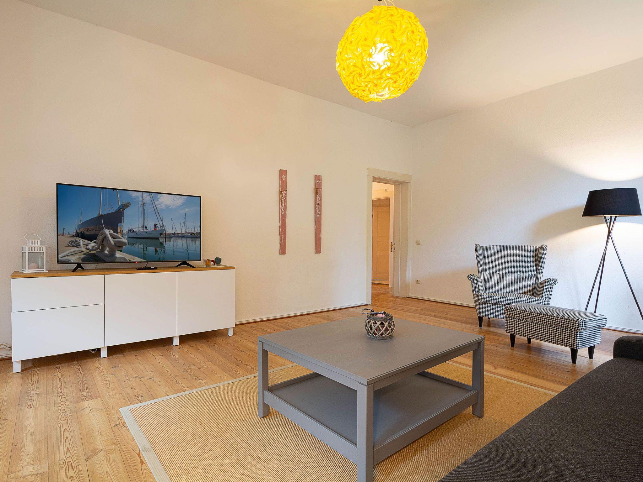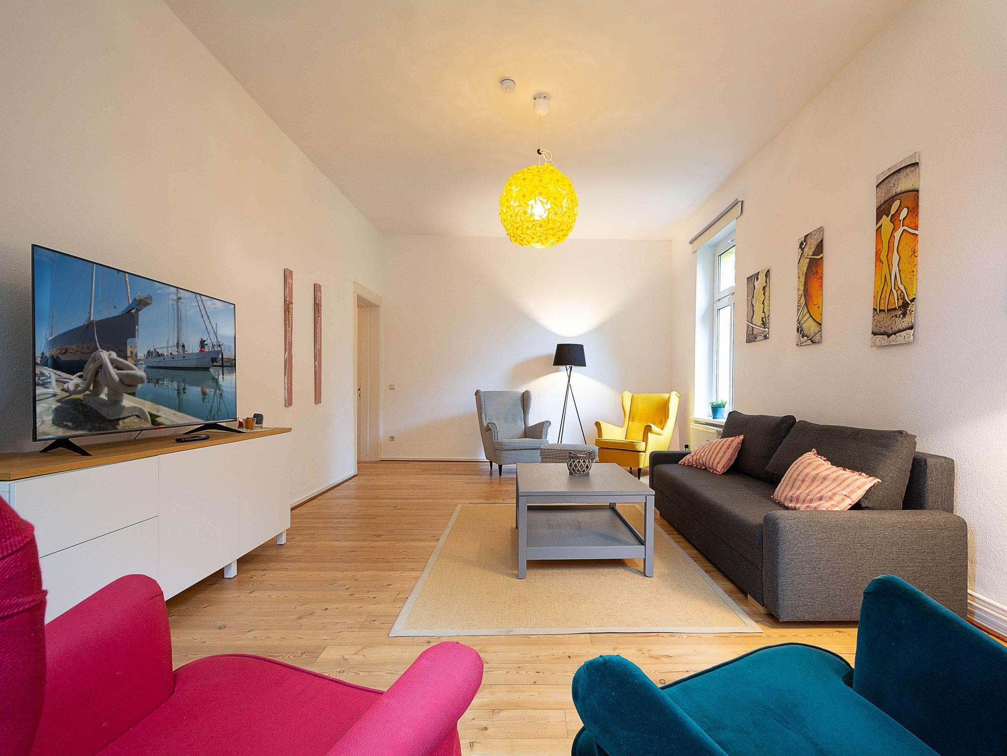 Es begrüßt Sie ein großer Wohnflur sowie ein heller freundlicher Wohnraum mit Couchgarnitur und Flachbildfernseher. In nur wenigen Handgriffen lässt sich das Sofa in einen gemütlichen Schlafplatz für 2 weitere Gäste (ausziehbar auf 140 cm x 190 cm) umbauen.