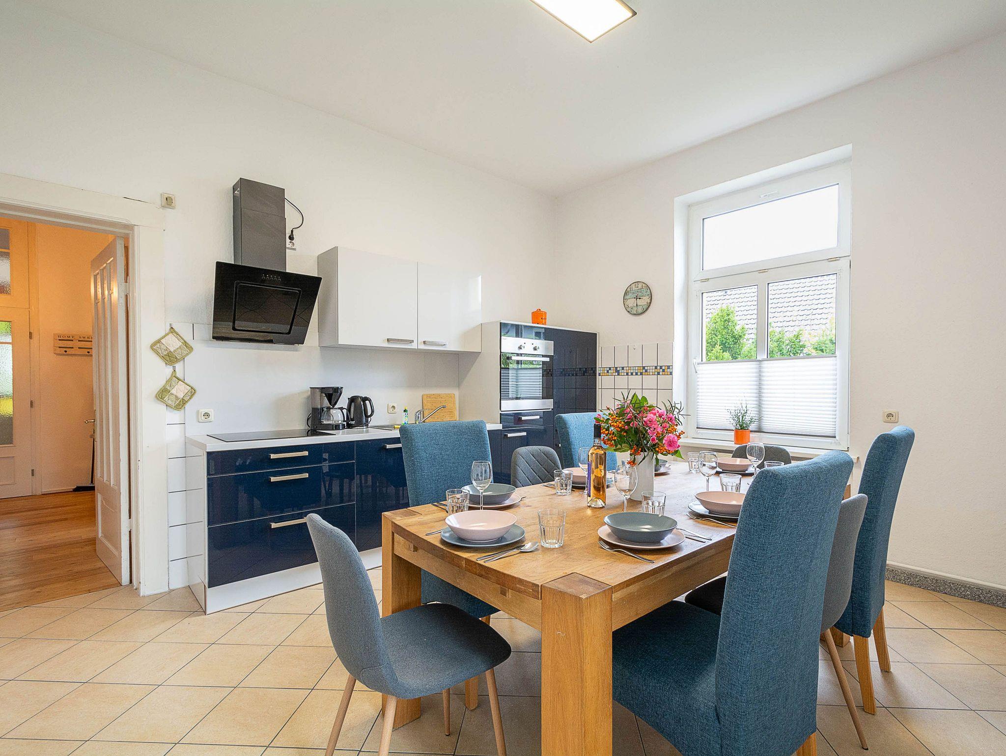 Die separate Küche ist großzügig geschnitten und bietet allen Gästen Platz für ein gemütliches Zusammensein. Sie ist ausgestattet mit allen wichtigen Küchengeräten und -utensilien, die Sie für Ihren Urlaub an der Ostsee benötigen. Ein 4-Zonen-Ceranfeld mit Dunstabzug, ein Backofen, ein Geschirrspüler sowie ein Kühlschrank mit kleinem Tiefkühlfach befinden sich in der Küche. Eine Kaffeemaschine, ein Toaster sowie ein Wasserkocher vervollständigen die Kücheneinrichtung.