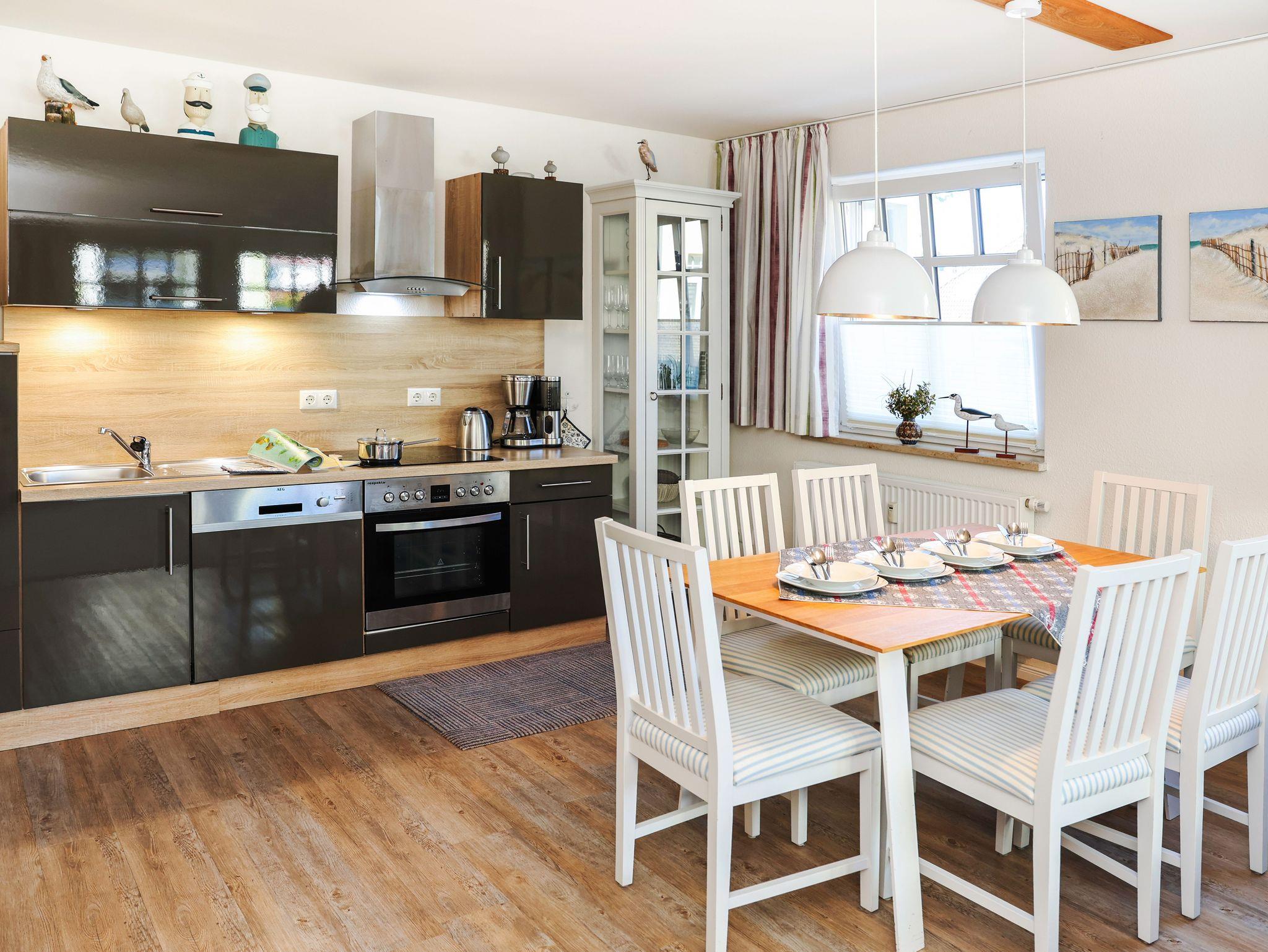 Küche mit Mikrowelle, 4 Platten-Ceran-Herd mit Backofen, Kühlschrank mit Gefrierfach, Geschirrspüler und Kaffeemaschine