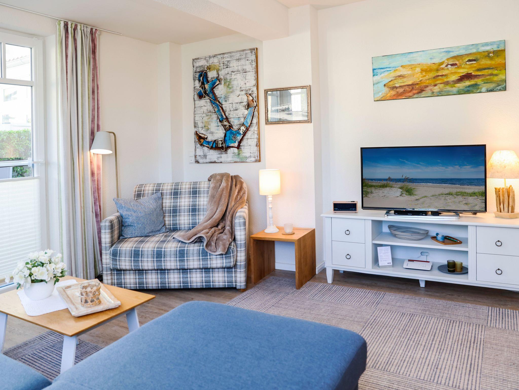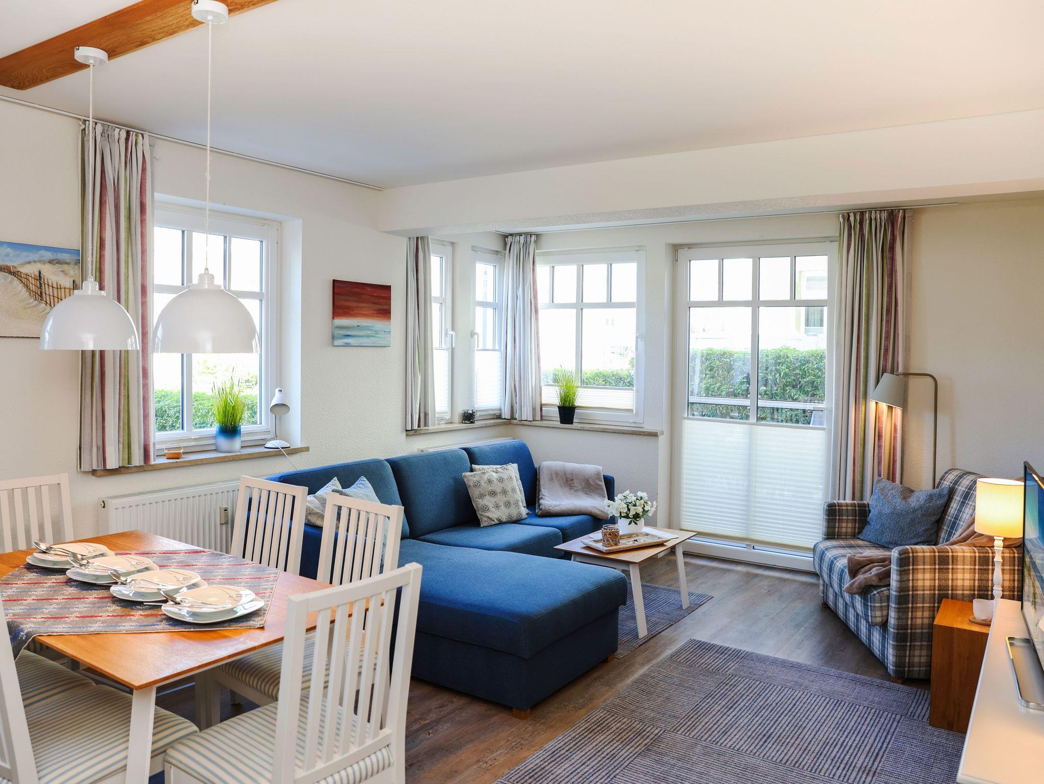 Wohnzimmer mit Schlafcouch, Sessel, Esstisch, Kabel-TV und Radio