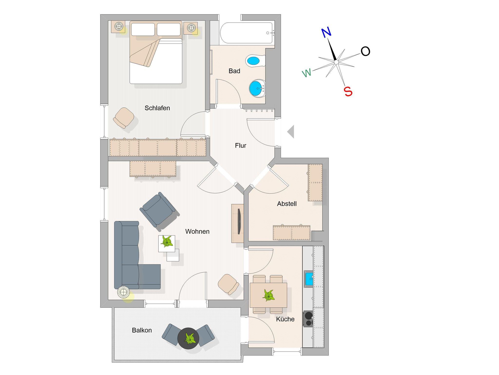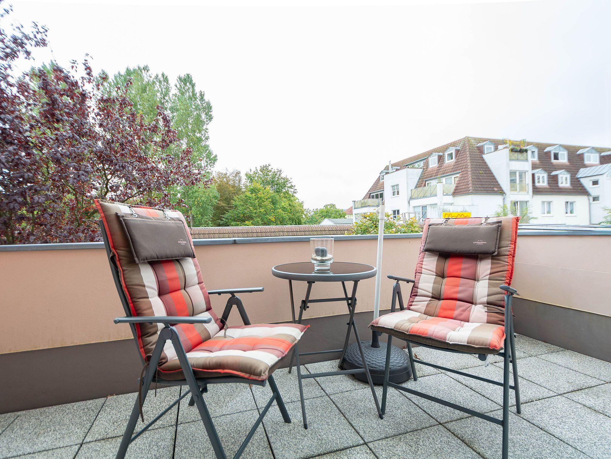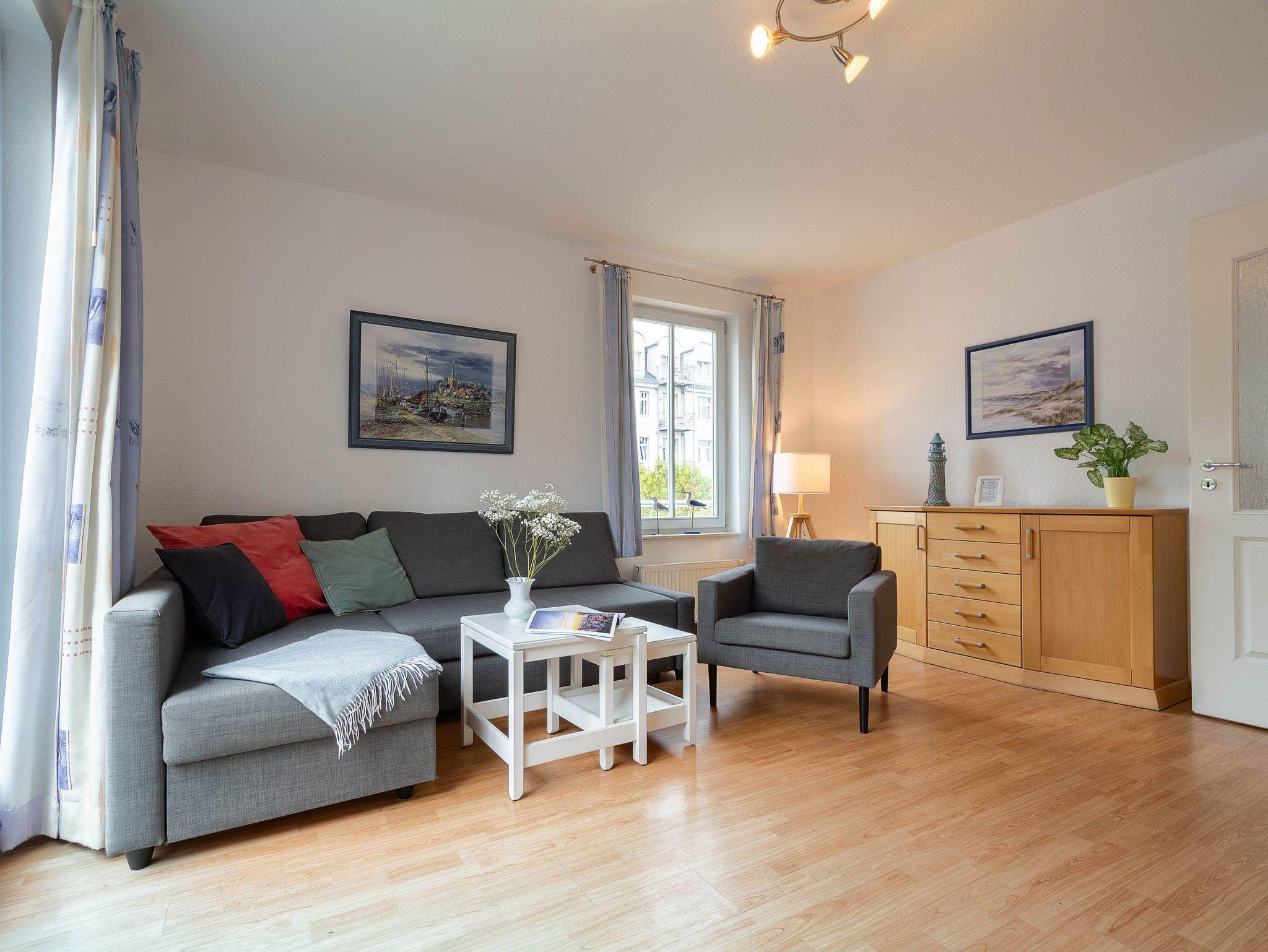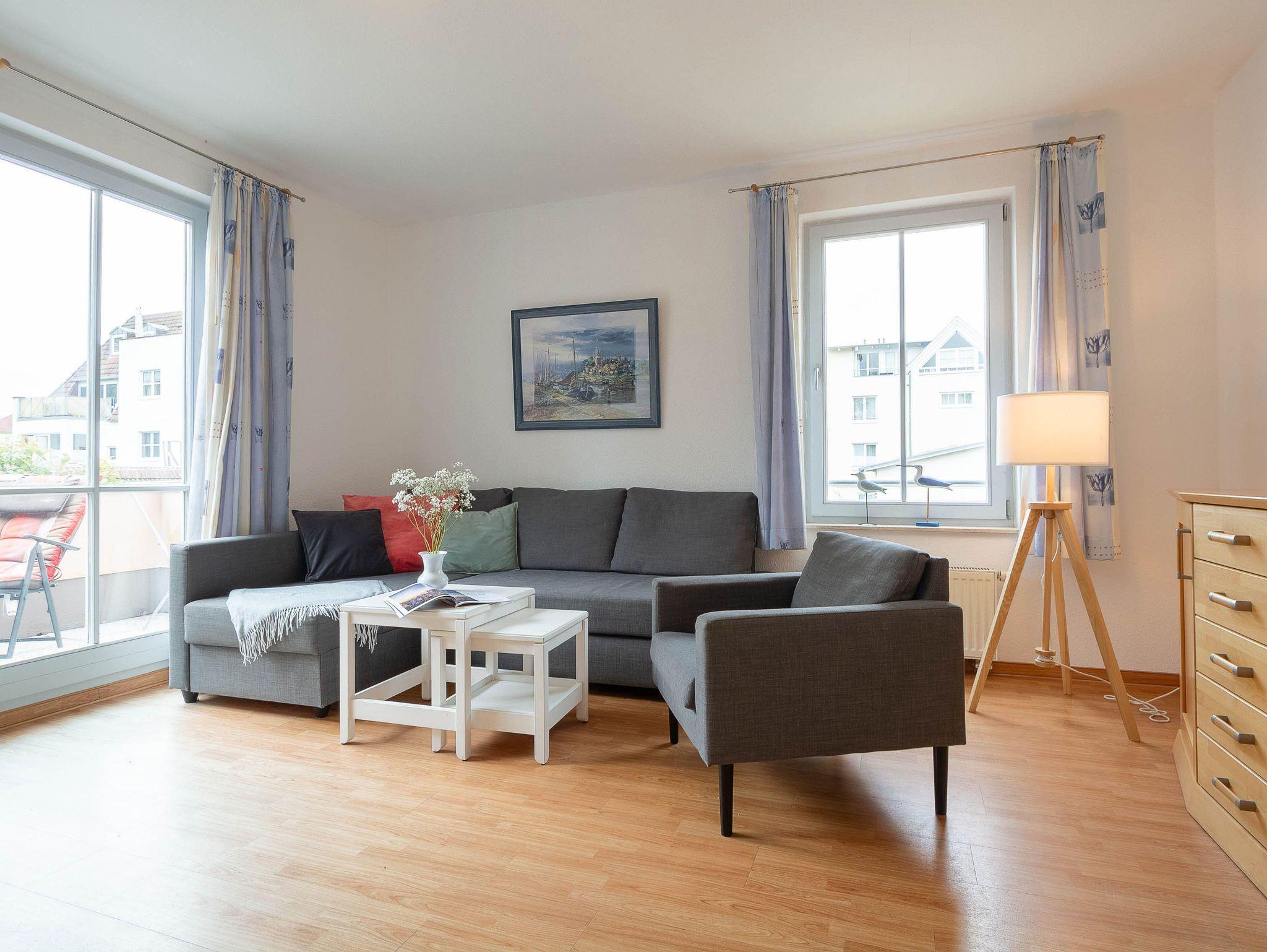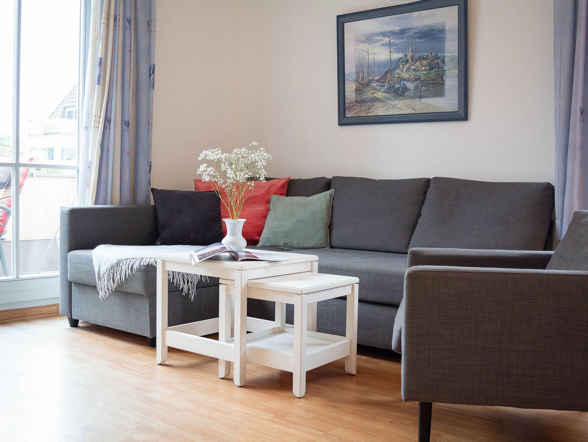 Das helle Wohnzimmer ist mit einer bequemen Schlafcouch, einem Flat-TV und einem DVD-Player ausgestattet. Von hier aus gelangen Sie direkt auf den sonnigen Balkon in Süd-West-Lage. Hier können Sie den Tag bei einem ausgedehnten Frühstück beginnen oder abends mit einem Glas Wein den Sonnenuntergang genießen. Der möblierte Balkon bietet einen ruhigen Platz im Freien, um frische Ostseeluft zu tanken und die Urlaubsstunden entspannt ausklingen zu lassen.