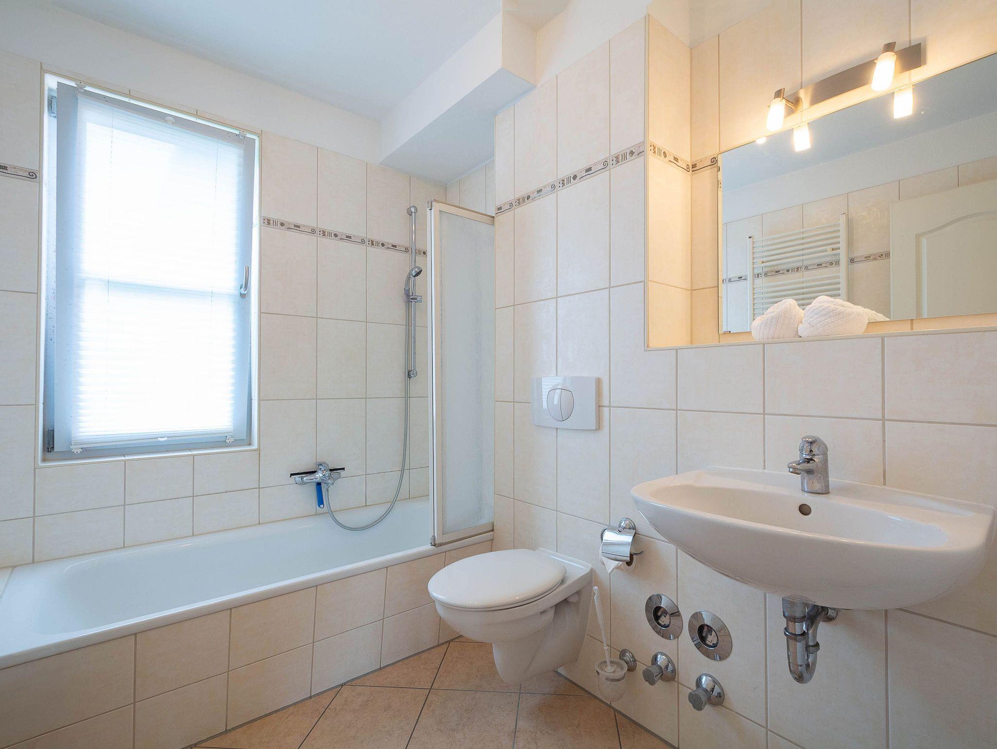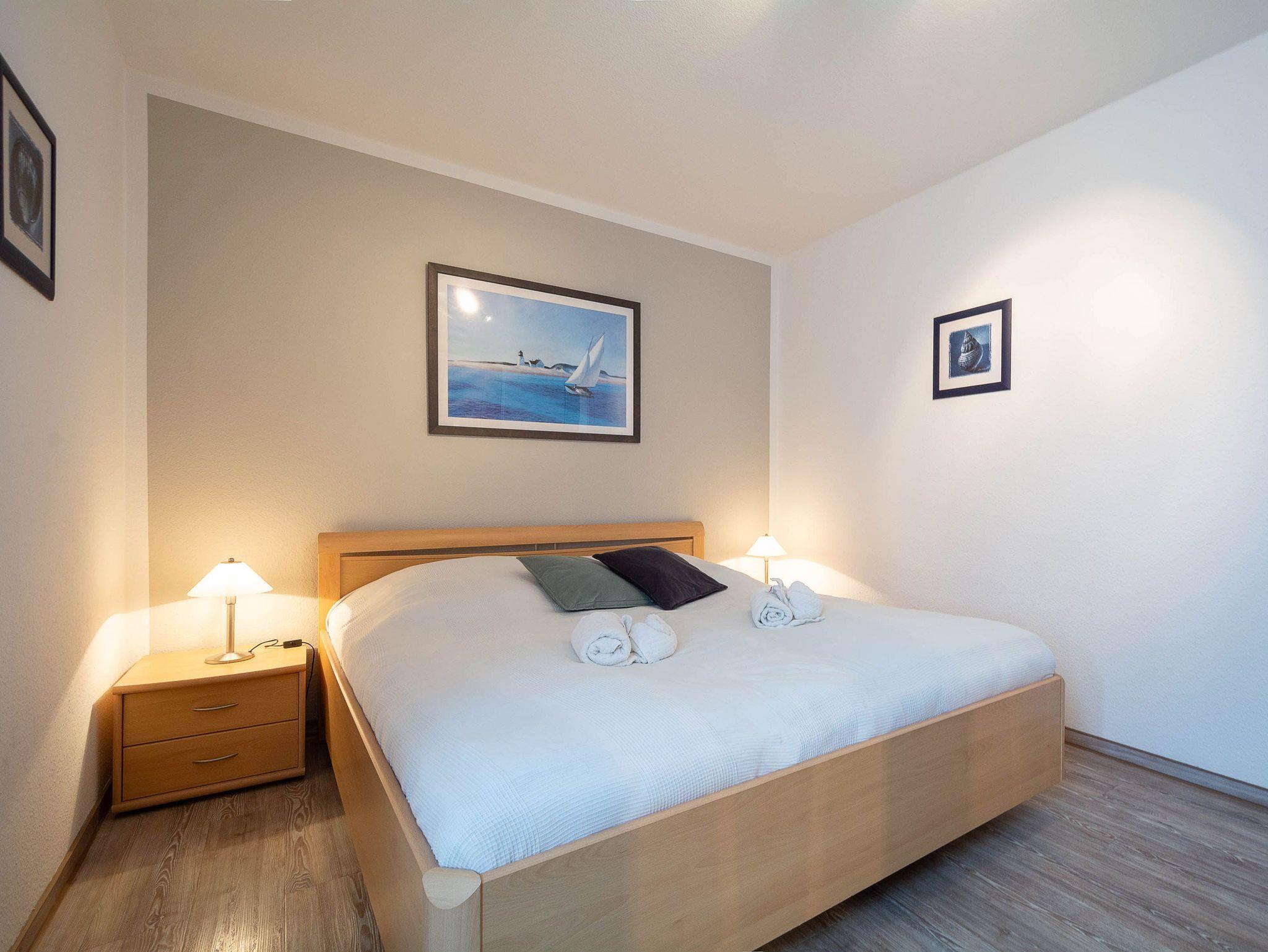 Das Schlafzimmer ist mit einem komfortablen Doppelbett eingerichtet und bietet durch den großen Kleiderschrank mit Ganzkörperspiegel ausreichend Stauraum. Das Badezimmer ist mit einer Badewanne mit Duschvorrichtung, Waschbecken, WC, Handtuchheizkörper und Fön ausgestattet und sorgt sowohl für entspannte Wannenbäder als auch für eine schnelle Dusche.