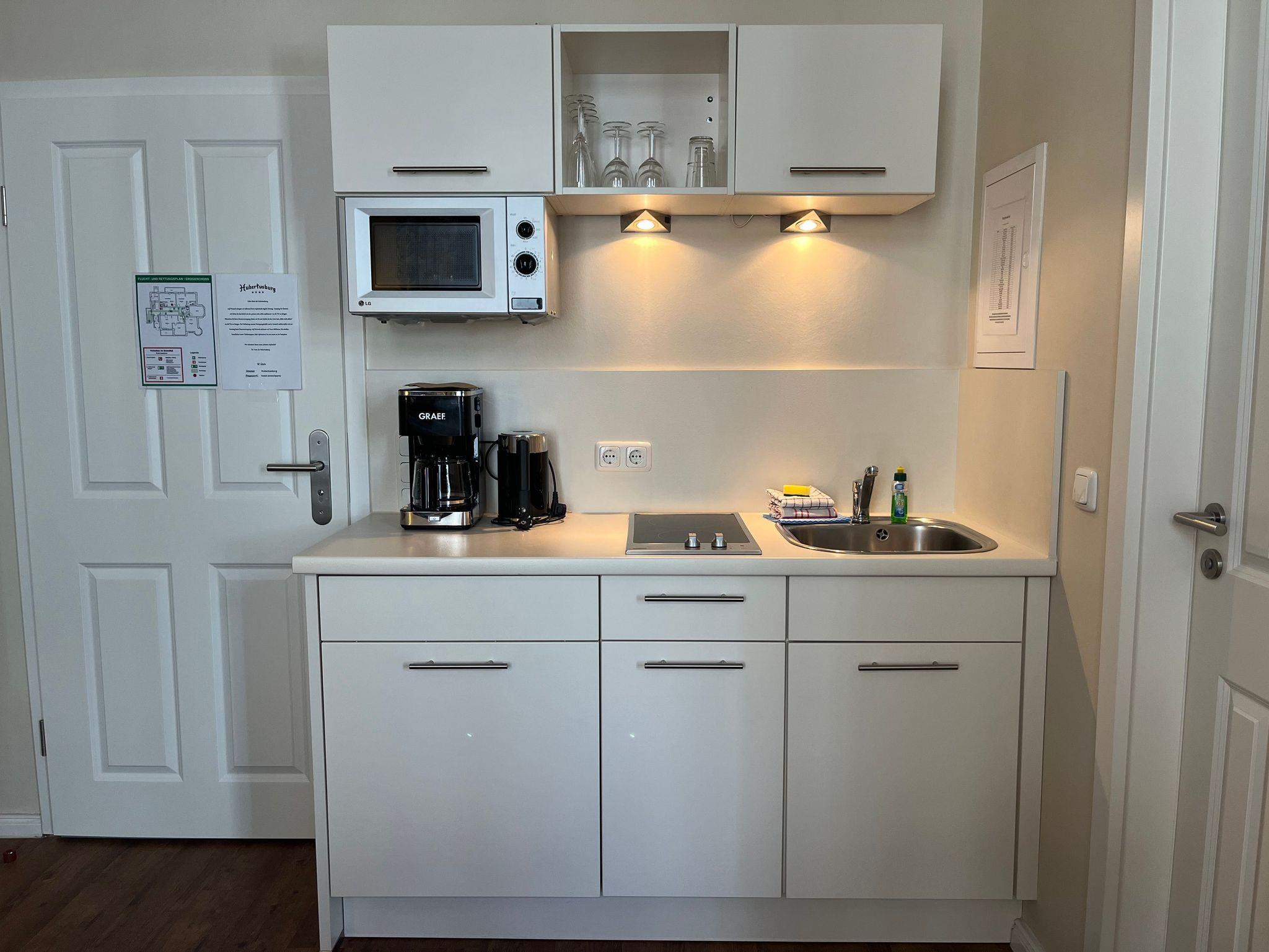 • Pantry-Küche (mit Mikrowelle, Wasserkocher, 2 Kochfelder, Kaffeemaschine, Kühlschrank)