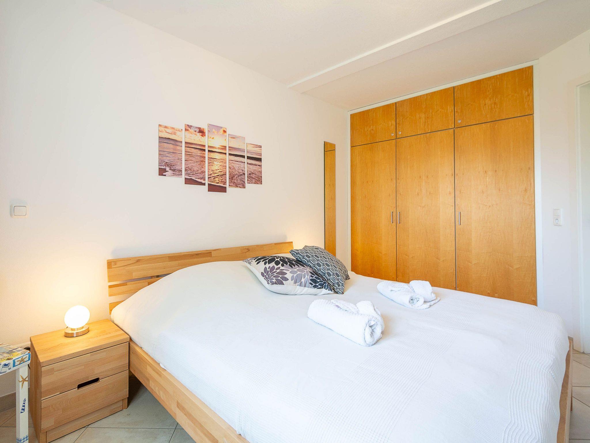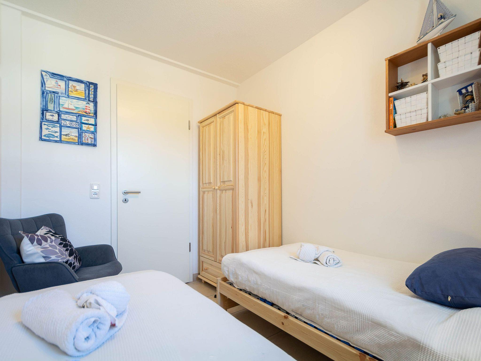 Das erste Schlafzimmer verfügt über ein komfortables Doppelbett, einen geräumigen Kleiderschrank sowie einen zusätzlichen LCD-TV. Im zweiten Schlafzimmer befinden sich zwei Einzelbetten (je 80 x 200 cm) mit verstellbarem Lattenrost und hochwertigen Irisette-Kaltschaummatratzen. Eine Kommode bietet Stauraum für Ihre Urlaubsgarderobe.