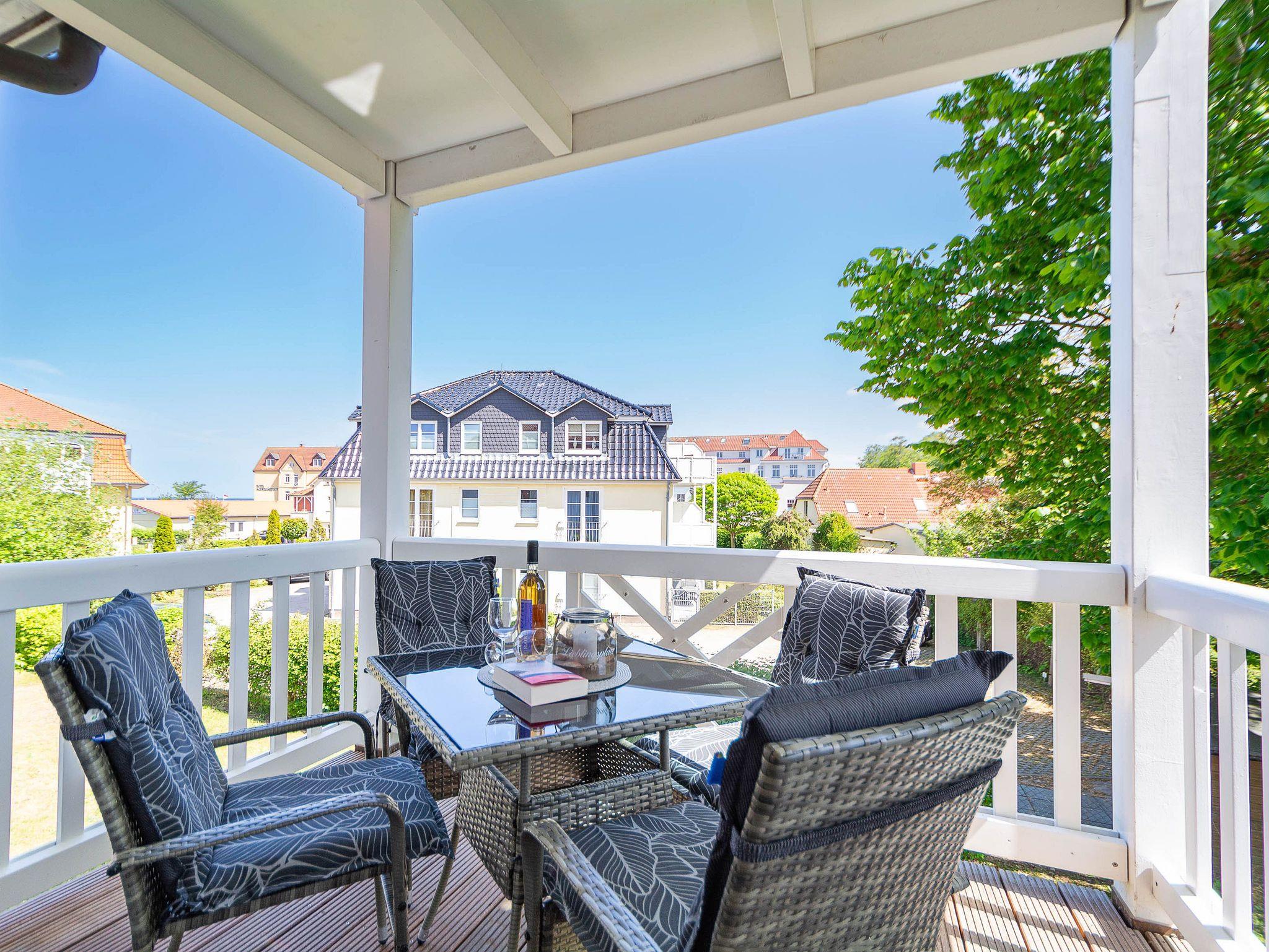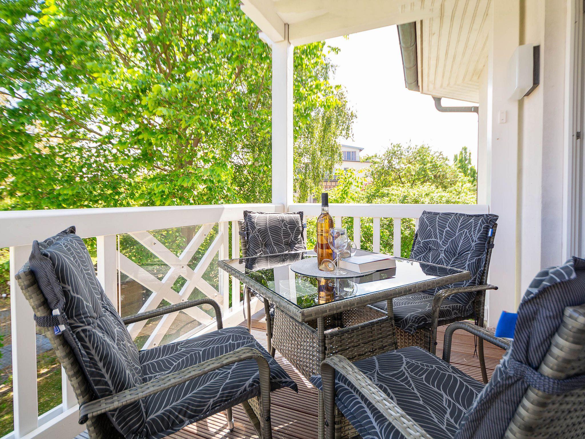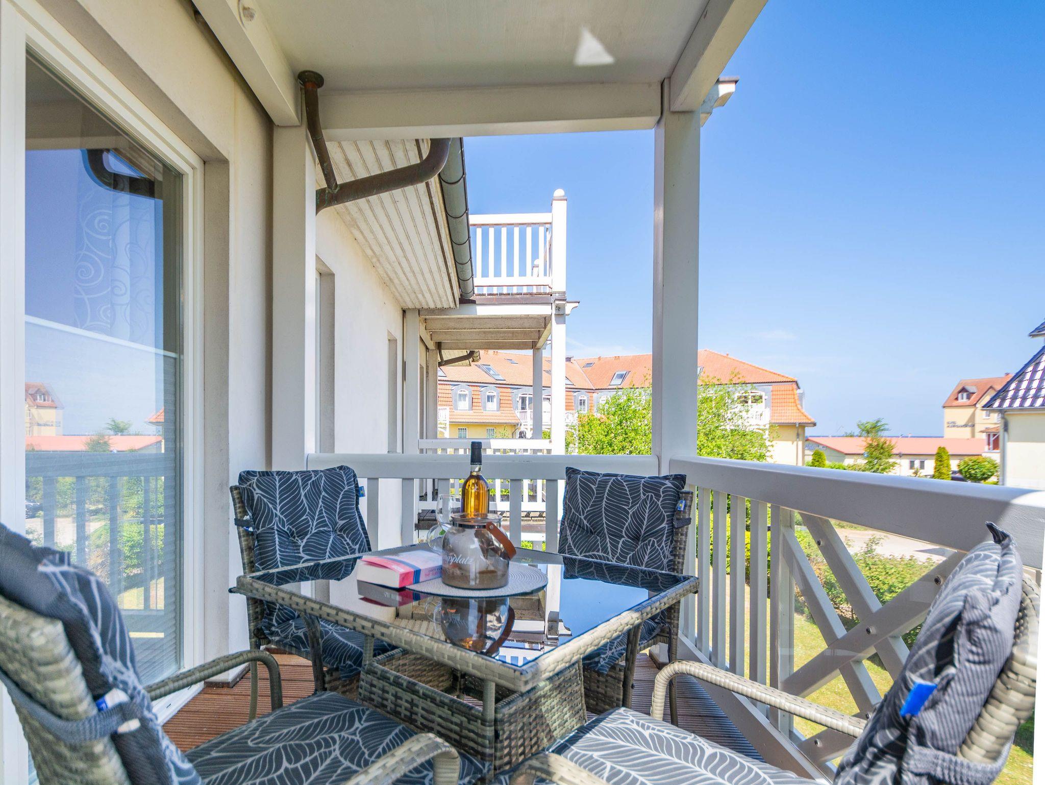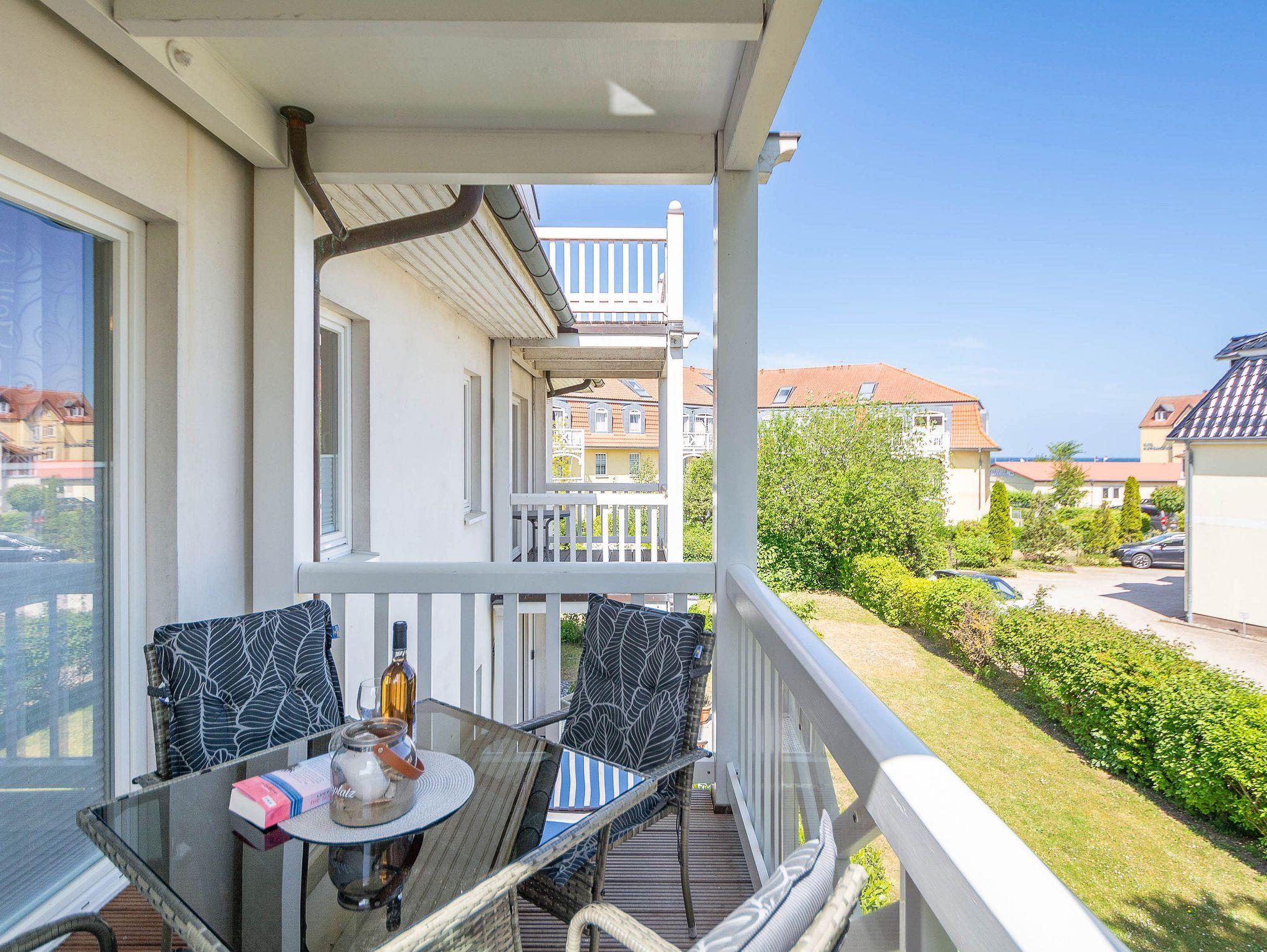 Die Ferienwohnung verfügt über ein offenes Wohn- und Esszimmer mit integrierter Küchenzeile, zwei separate Schlafzimmer, ein modernes Badezimmer sowie einen möblierten Balkon mit Ostseeblick ? ideal, um den Tag bei einem Frühstück in der Morgensonne zu beginnen oder gemütlich ausklingen zu lassen.