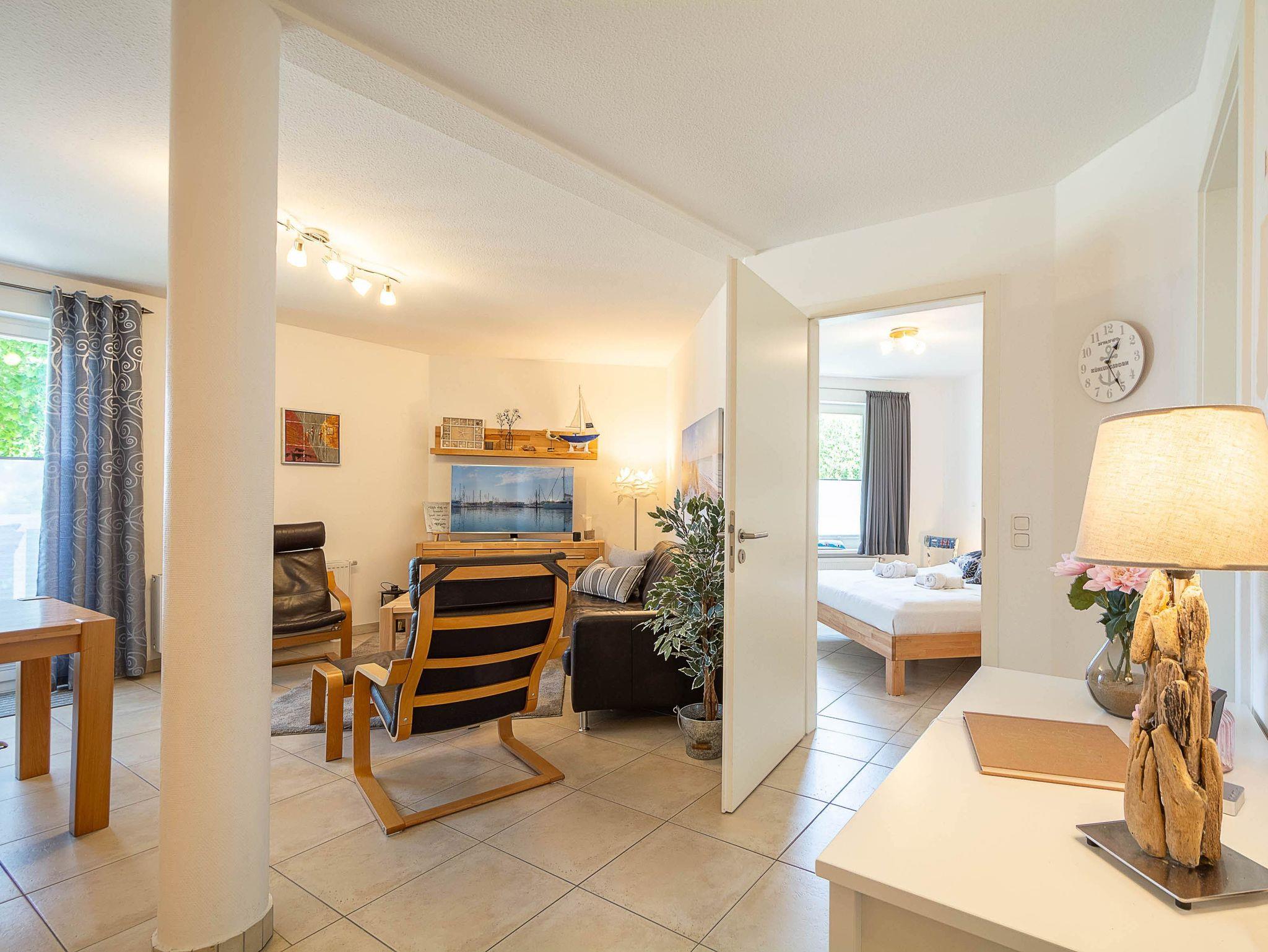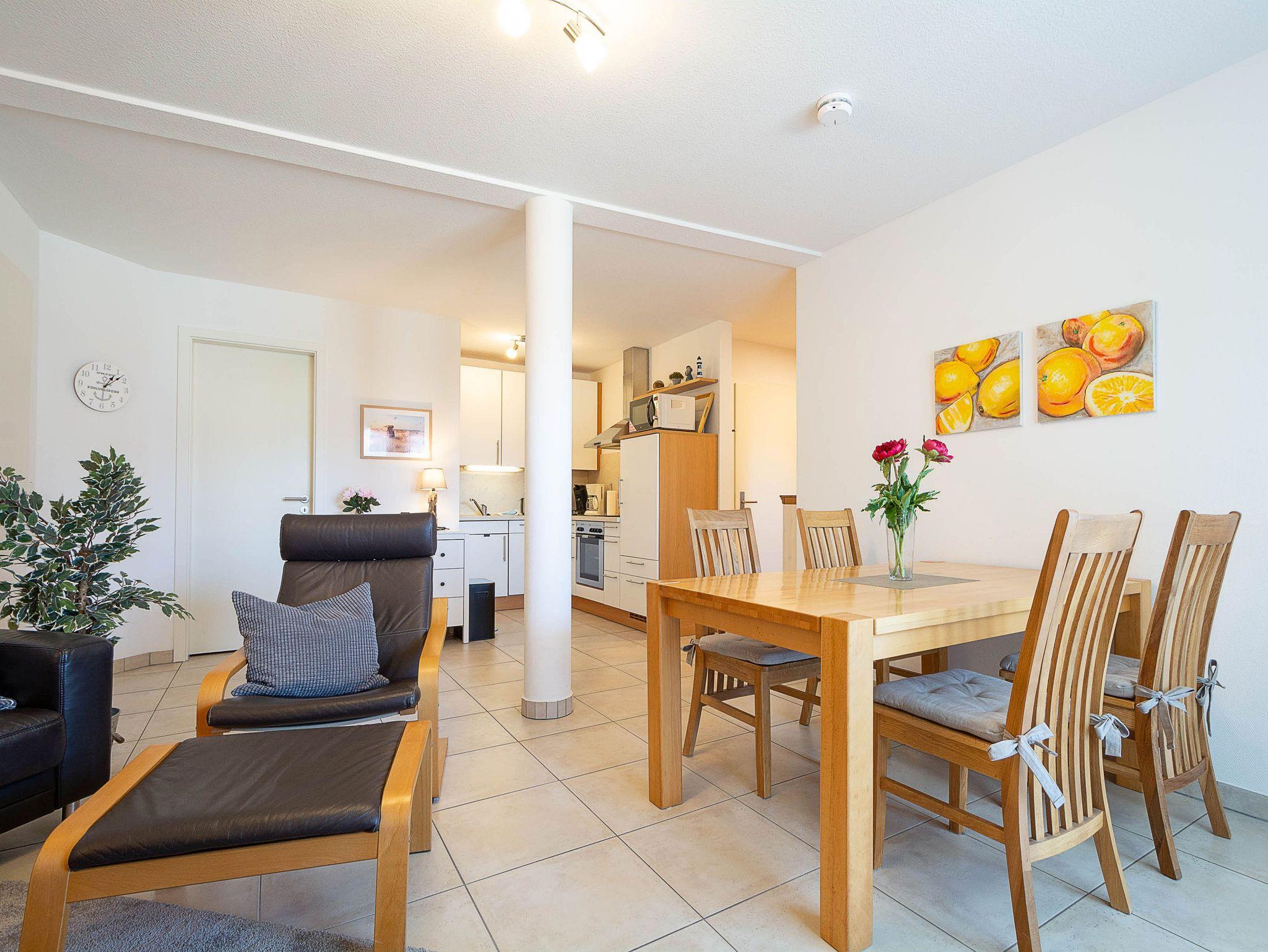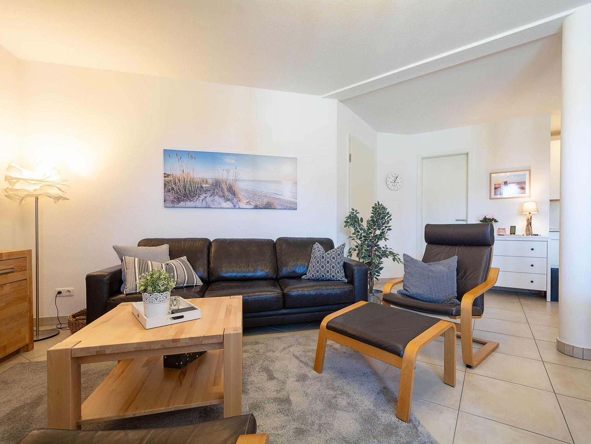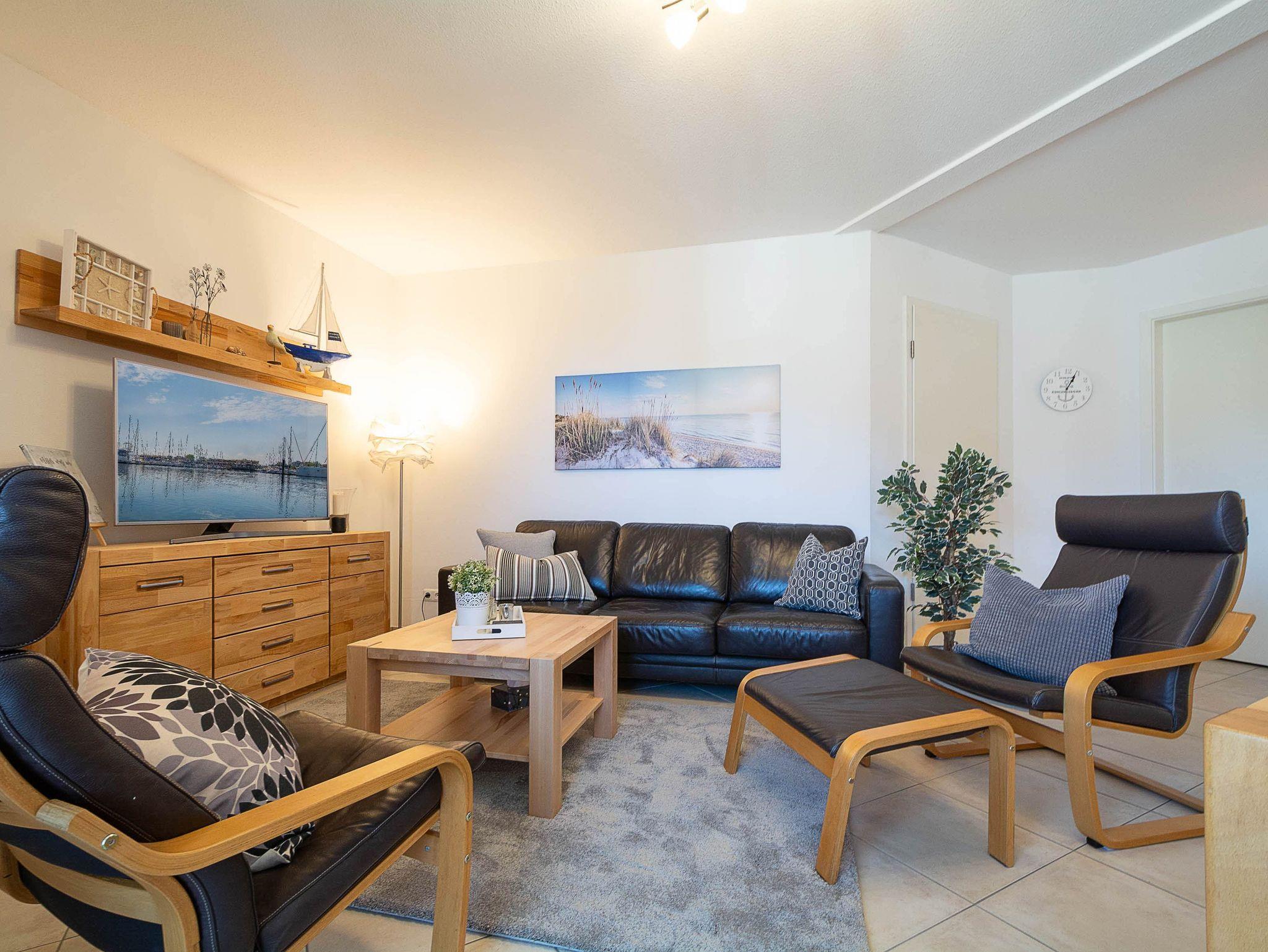 Das helle Wohnzimmer lädt mit einer gemütlichen Couchgarnitur zum Entspannen ein. Ein 50-Zoll-Flachbild-TV und ein Bluetooth-Lautsprecher sorgen für beste Unterhaltung. Der angrenzende Essbereich bietet Platz für gemeinsame Mahlzeiten. Von hier aus gelangen Sie direkt auf den möblierten Ost-Balkon, der zum Verweilen einlädt und einen schönen Blick in Richtung Ostsee bietet.