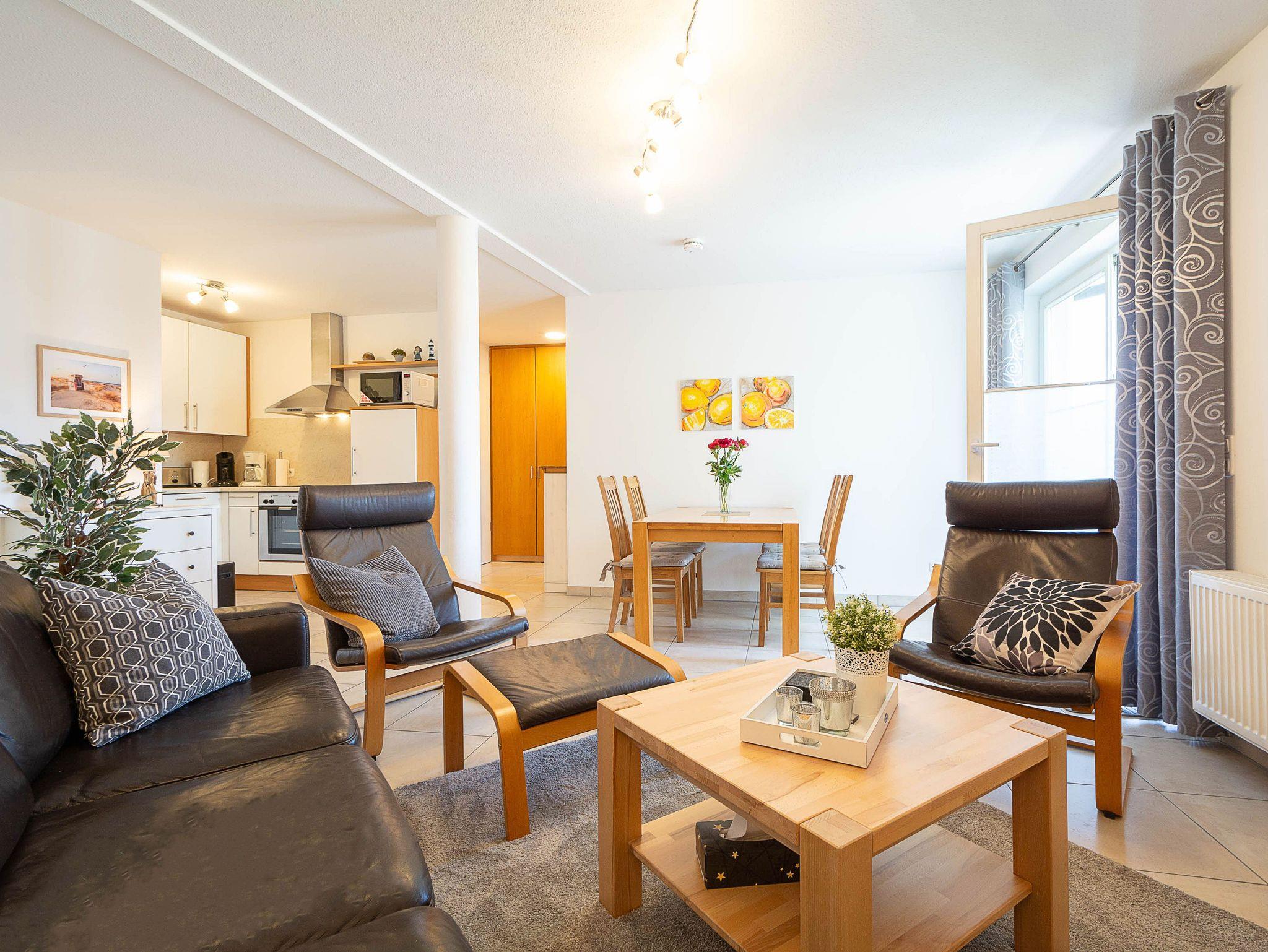 Die großzügig geschnittene und komfortabel ausgestattete 3-Raum-Ferienwohnung bietet auf ca. 60 m² ausreichend Platz für 2 bis 4 Personen. Sie befindet sich in der 1. Etage der beliebten Appartementanlage Strandkrone und überzeugt durch ihre stilvolle Einrichtung, funktionale Raumaufteilung und die strandnahe Lage.