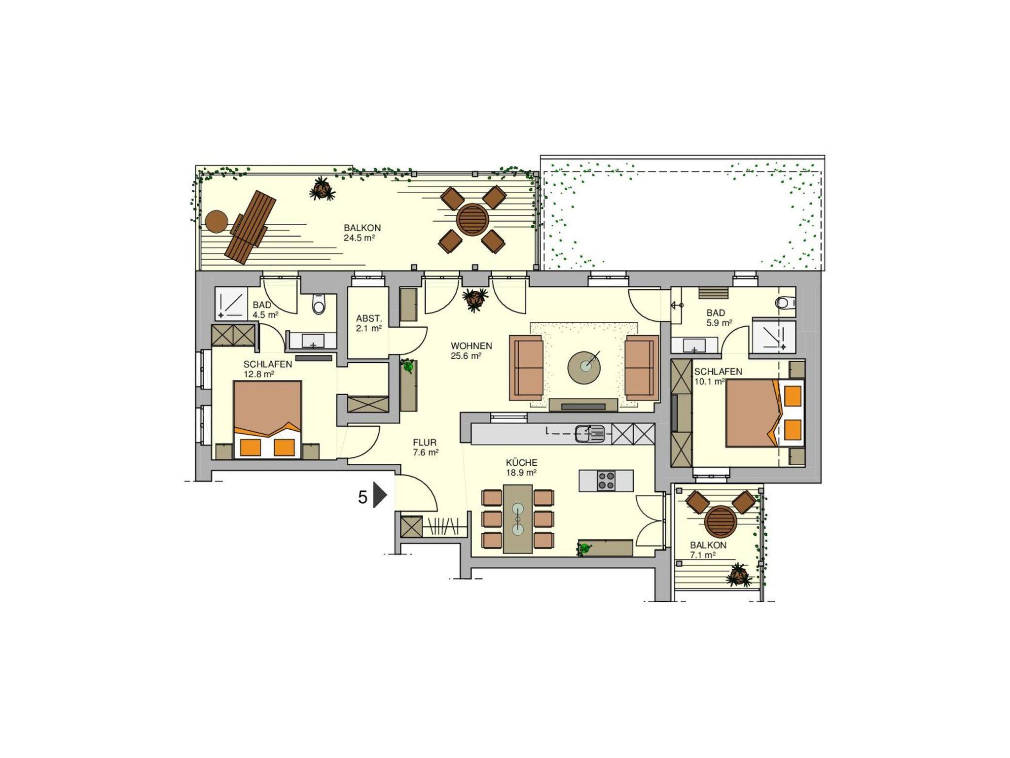 Bei der Ferienwohnung 05 handelt es sich um ein 3-Raum-Ferienwohnung, bestehend aus einem großzügigen Wohn-/Essbereich mit offen gestalteter Küche, zwei Schlafzimmern mit Doppelbett und je einem Duschbad sowie einem Gäste-WC.
