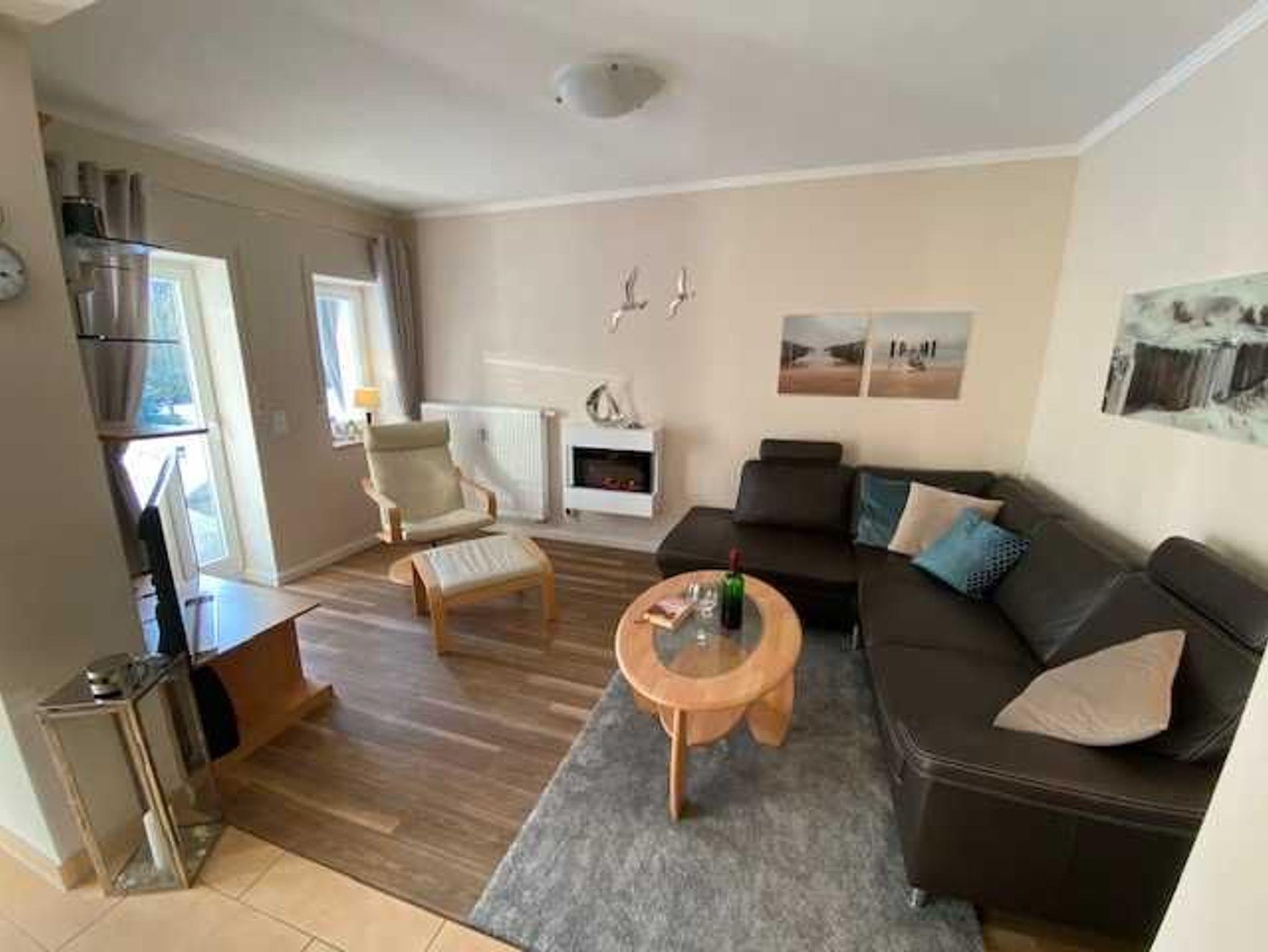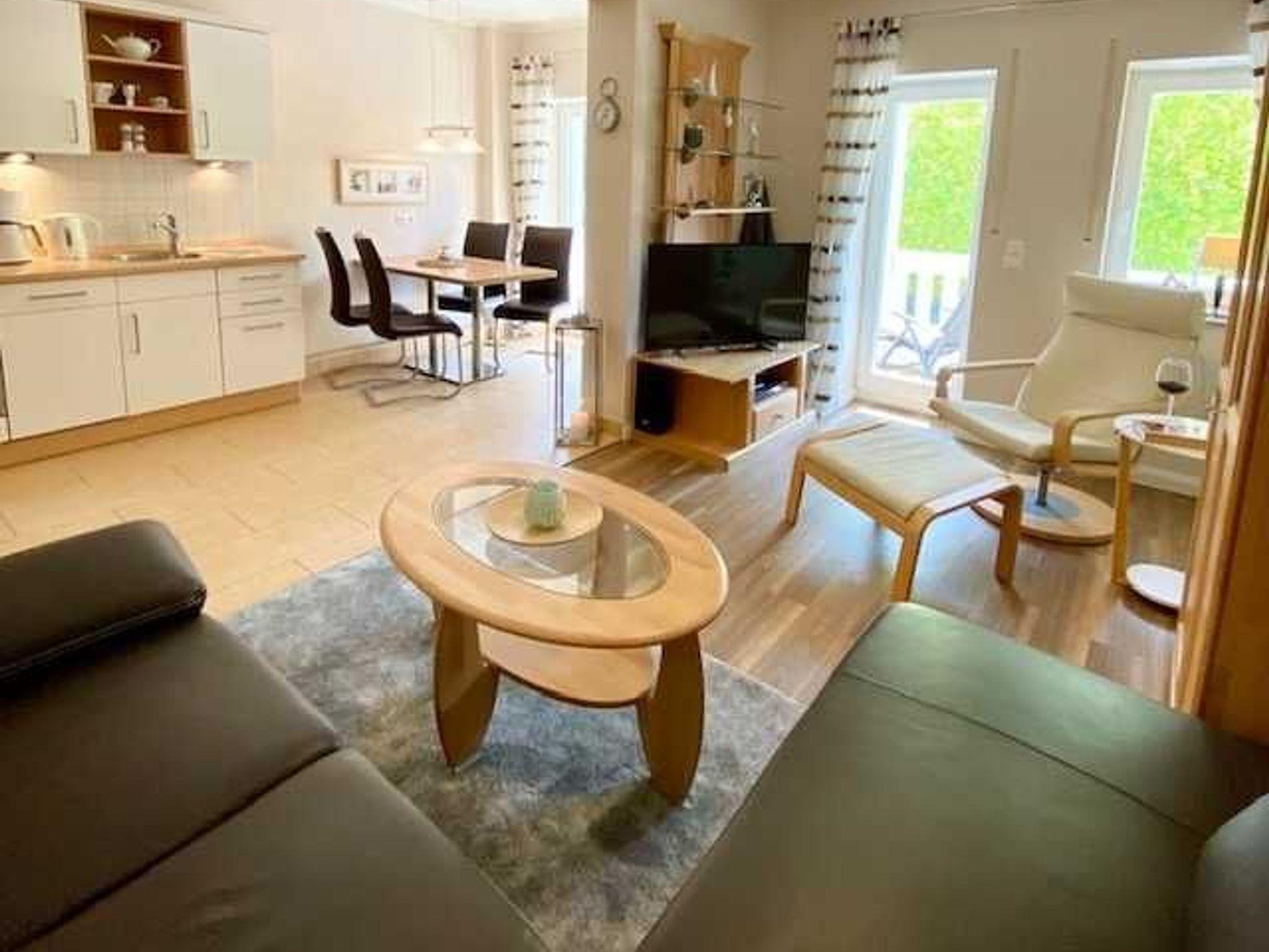 - Wohnbereich mit Echtledercouch, integrierter Küche und Essplatz