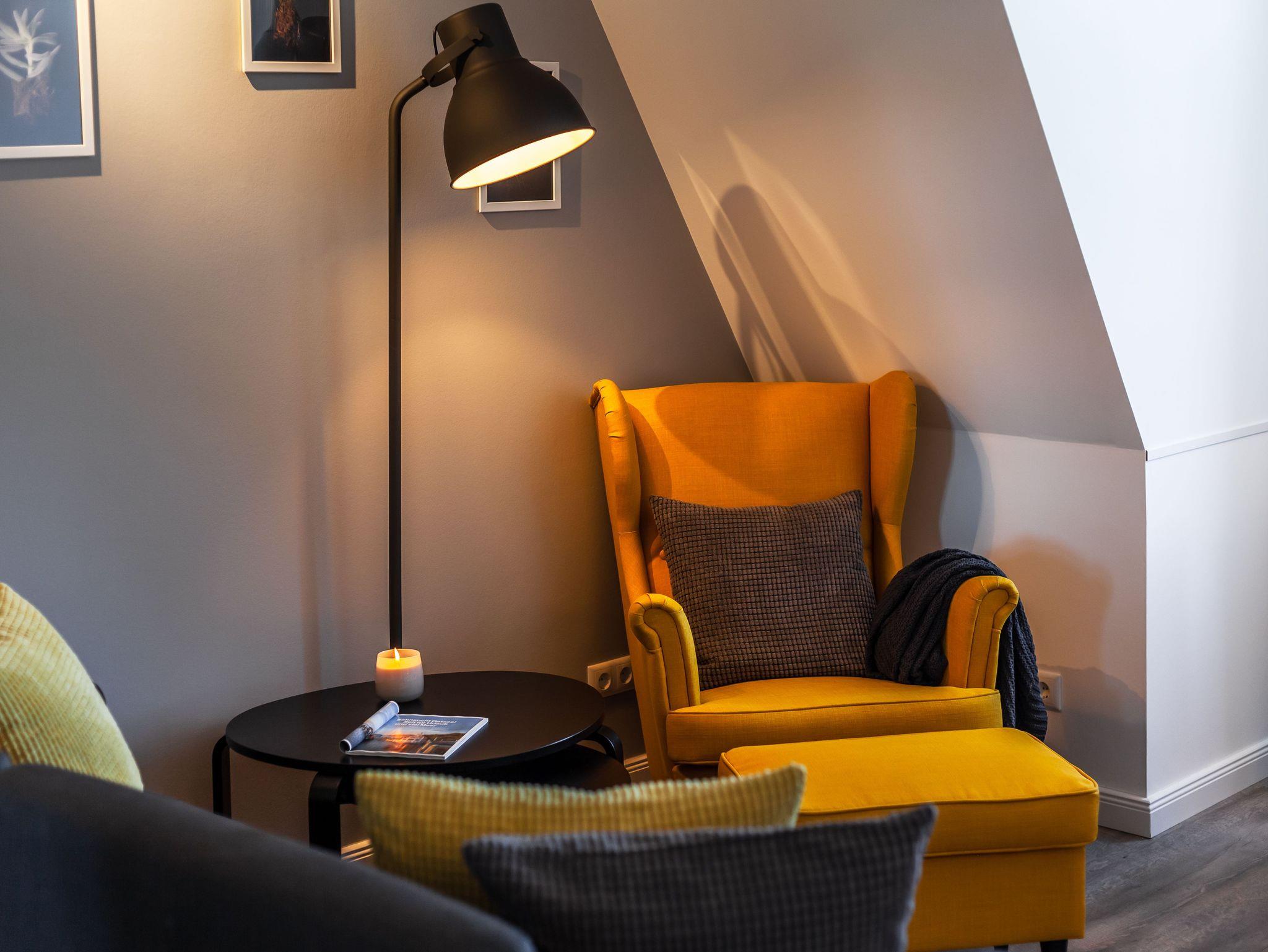 Nur 150 m vom Strand wohnen Sie in einer 2-Raum-Ferienwohnung. Die 38 qm große Wohnung liegt in der 2. Etage. Das Wohnzimmer ist mit einer Couch, Couchtisch, Sessel, Anrichte, mit Kabel-TV, Radio, Essbereich (Tisch und Stühle) und Küchenzeile ausgestattet. Der Balkon mit Tisch und Stühle geht zur Nordseite. Im Schlafzimmer stehen ein Doppelbett und ein Kleiderschrank. Die Küchenzeile wurde ausgestattet mit Mikrowelle, Kühlschrank, Kaffeemaschine, Ceran-Kochfeld, Geschirrspüler, Toaster und Wasserkocher. Das Bad mit ebenerdiger Dusche und WC komplettiert die Wohnung.