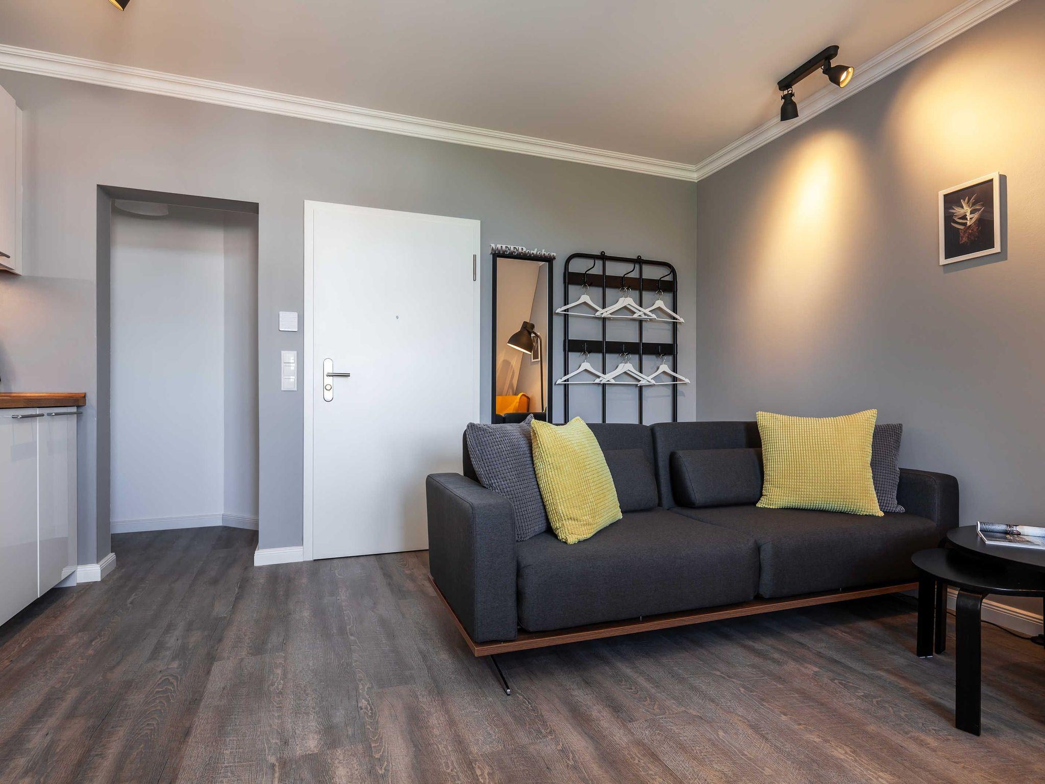 Wohnzimmer mit Schlafcouch, Esstisch, Küchenzeile, Kabel-TV, Radio und passwortgeschütztem WLan