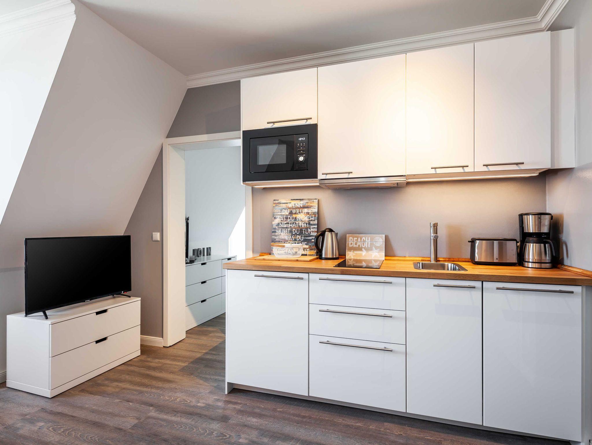 Küchenzeile mit Mikrowelle, Zweiplattenceranfeld, Kühlschrank mit Gefrierfach, Kaffeemaschine, Wasserkocher, Toaster, Geschirrspüler