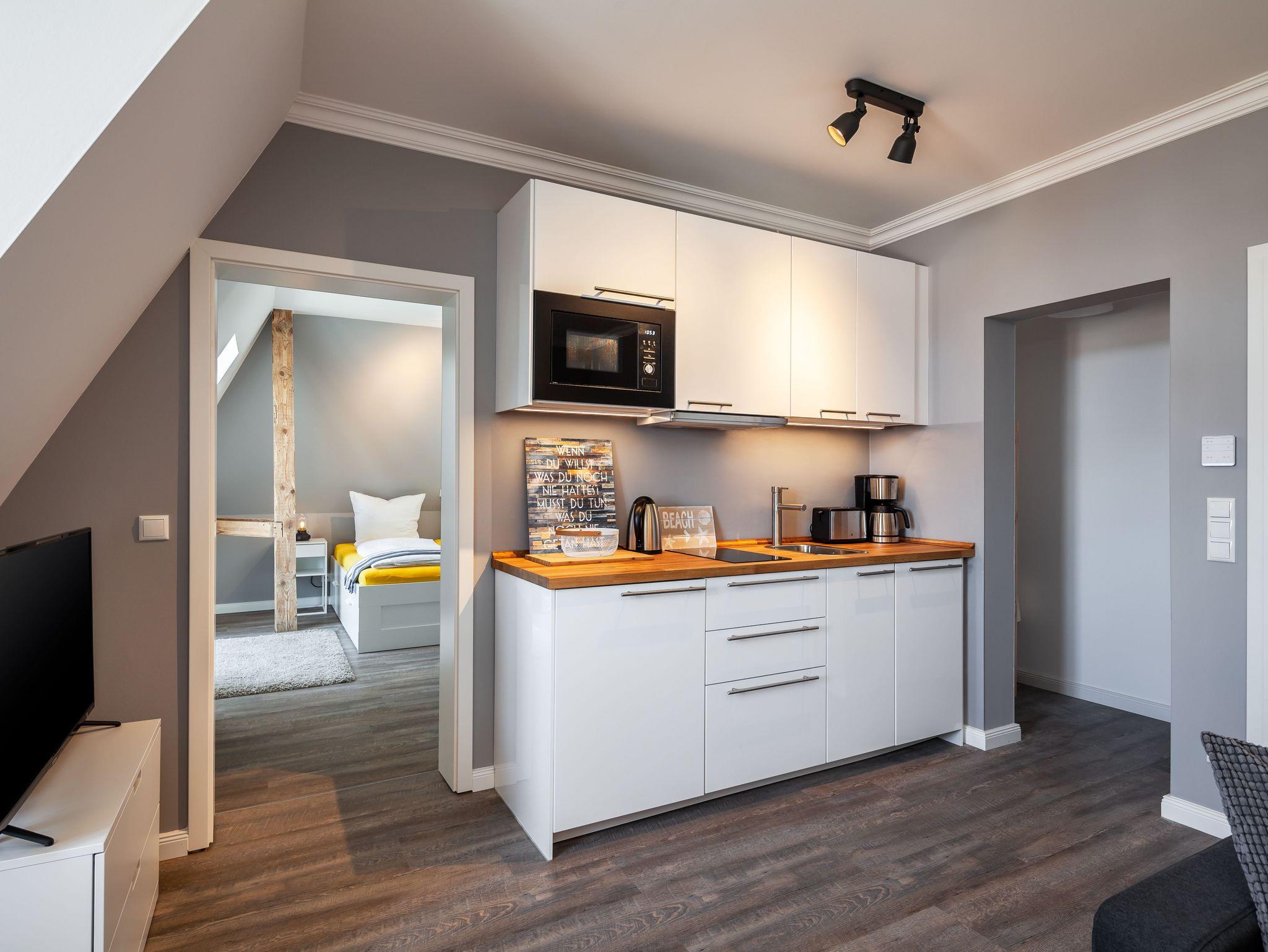 Dieses 2-Raum-Appartement strahlt einen ganz besonderen Charme aus. Die Küchenzeile ist mit hochwertigen Geräten wie, Geschirrspüler, E-Herd, Kühlschrank, Mikrowelle, Kaffeemaschine, Wasserkocher, Toaster