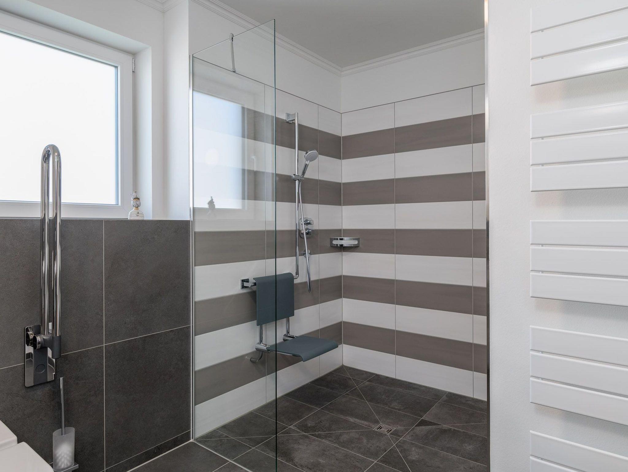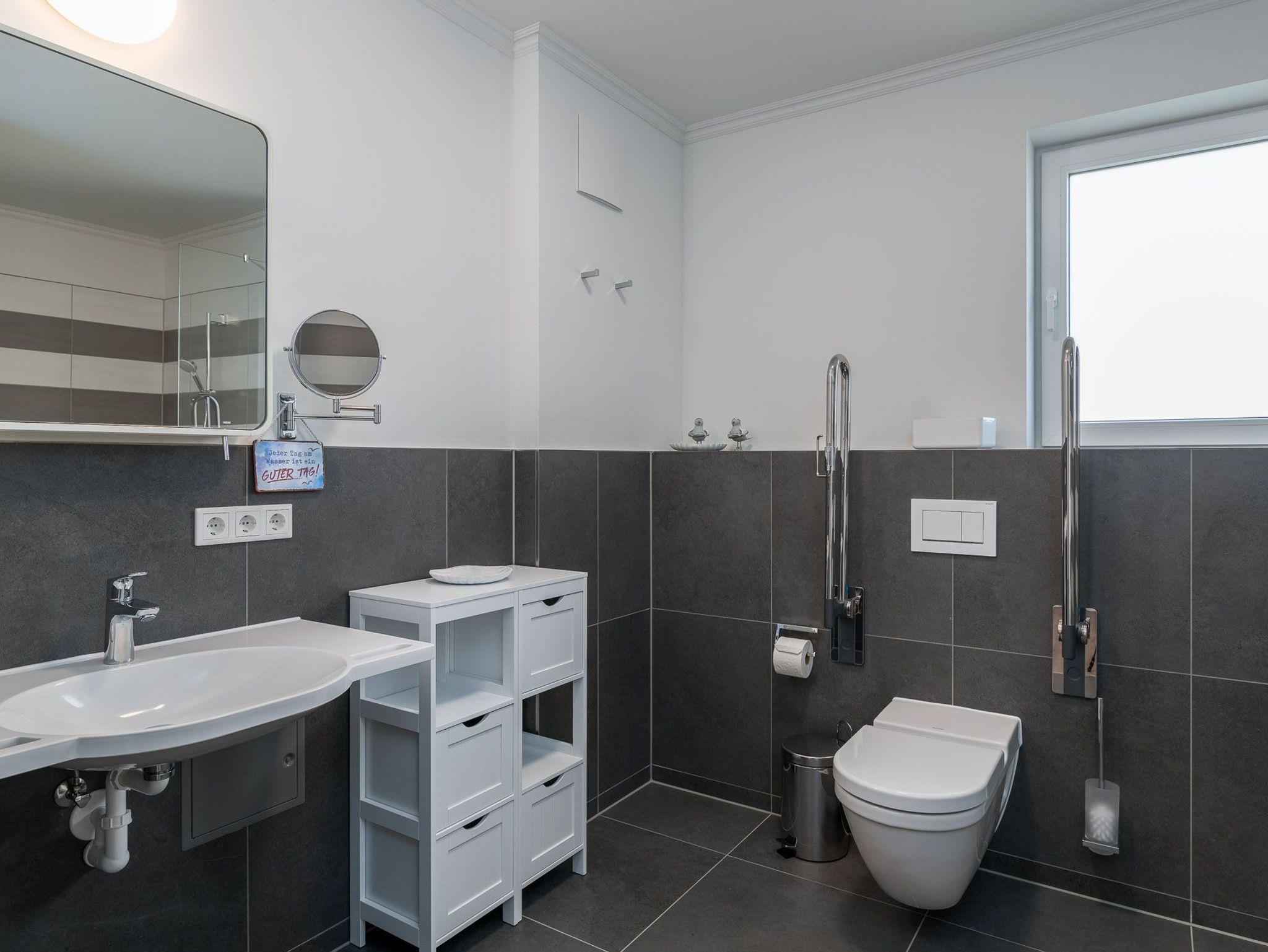 Wir haben das Apartment Rollstuhlgerecht (barrierefrei) ausgelegt. Rollstuhlfahrer können sich ohne hinderliche Schwellen, innen und außen, gut bewegen. Die breiten Türen und die befahrbare Dusche (1,50m*1,50 m) mit Einhängesitz und Haltestange, sowie die rollstuhlgerechten Sanitärobjekte (rollstuhlgerechtes WC, unterfahrbarer Waschtisch), erlauben mehr Selbstständigkeit. Das unterfahrbare Kochfeld und der Kleiderlift im Schlafzimmerschrank sind weitere Annehmlichkeiten.