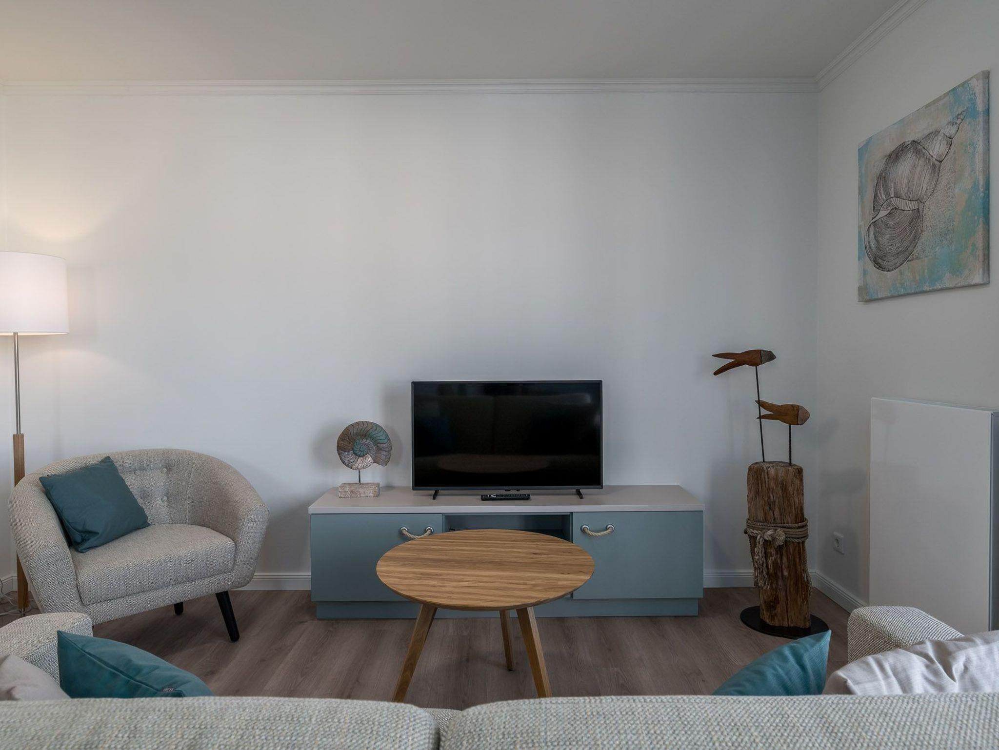Im Wohnbereich finden Sie ein großes Sofa zum Entspannen, das schnell zum Schlafsofa ausgeklappt werden kann (Liegefläche 1,60 x 1,95 m), einen Sessel, ein kleiner Tisch, einen Smart TV und WLAN.