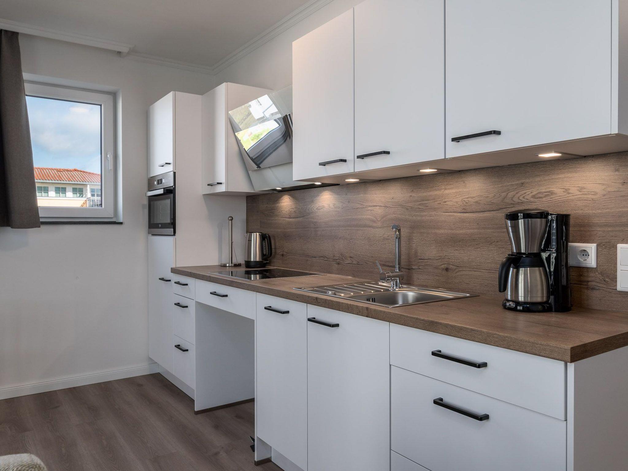 Zu Ihrem Apartment gehört ebenfalls ein großer und lichtdurchfluteter Wohn- und Essbereich mit offener Pantry-Küche. Die sehr gut ausgestattete Küche mit Geschirrspüler, 4-Platten Glaskeramik-Kochfeld, Backofen, Kühlschrank mit Gefrierfach, Kaffeemaschine, Wasserkocher sowie Toaster, macht das Zubereiten Ihrer Mahlzeiten zu einer Freude.