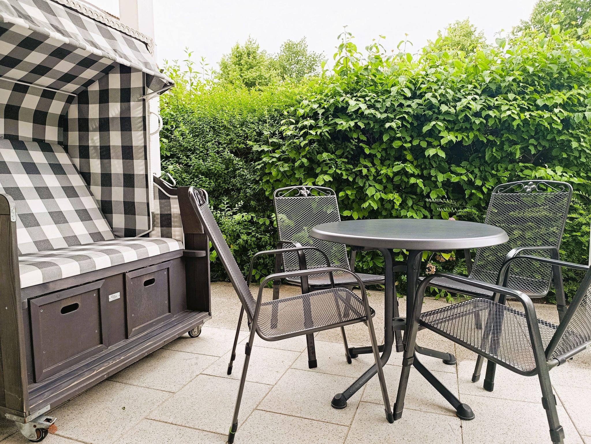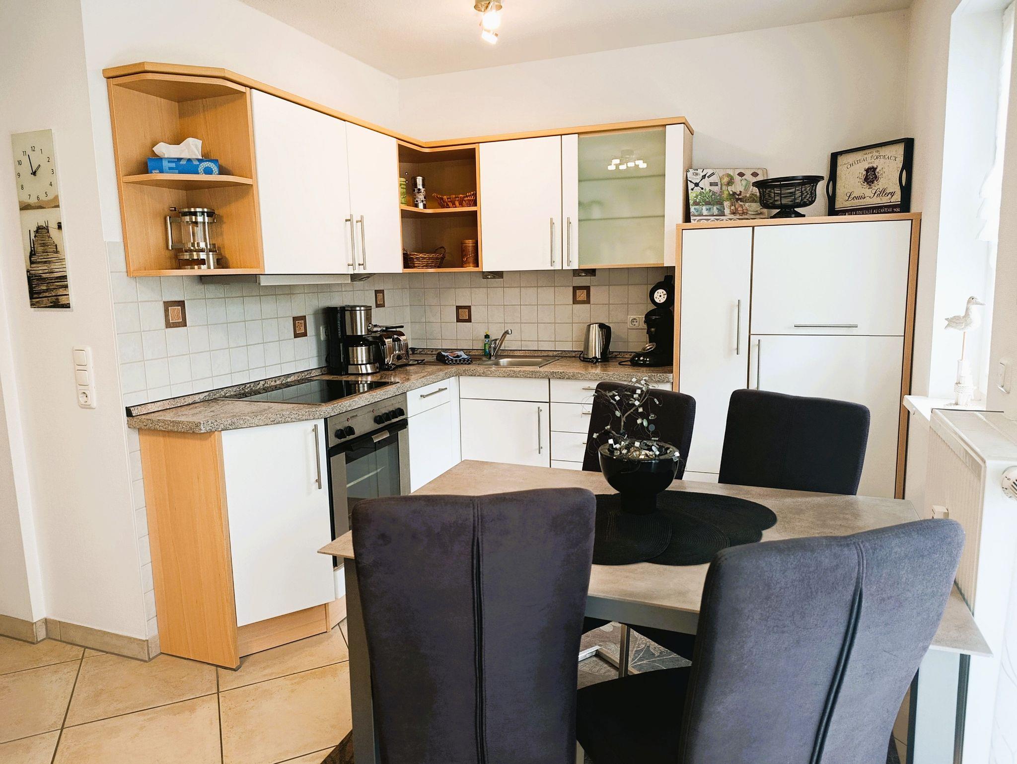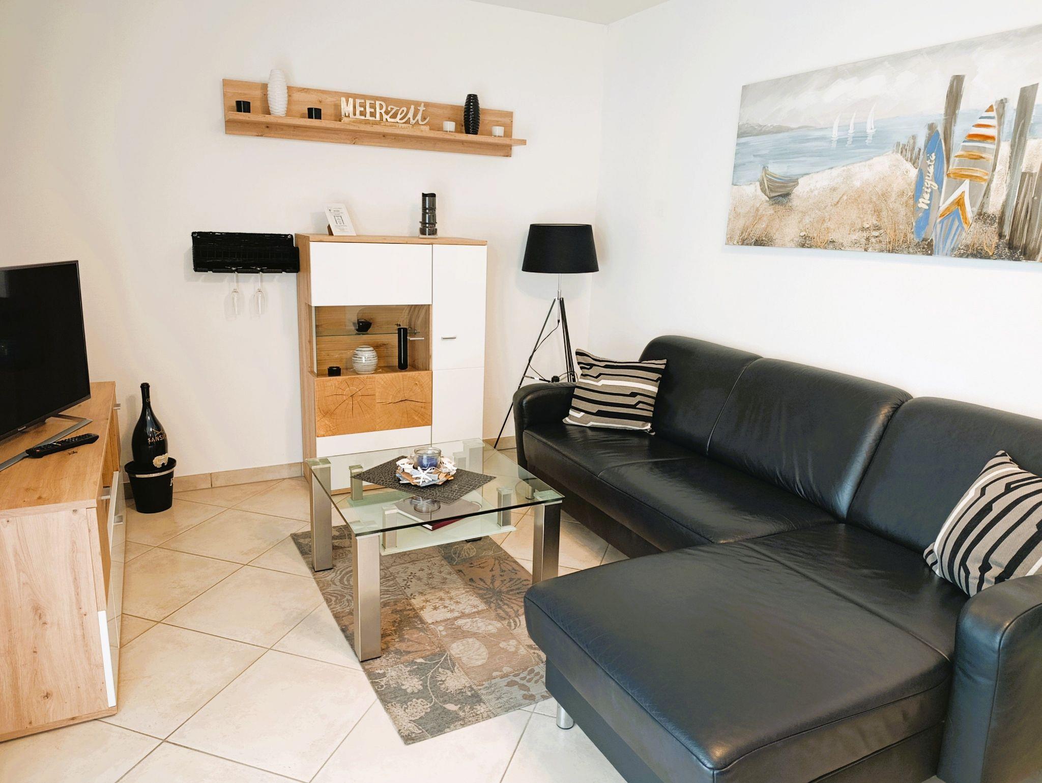 Nur 100 m vom Strand wohnen Sie in einer modern eingerichteten 2-Raum-Ferienwohnung. Die 45 qm große Wohnung liegt im Erdgeschoss. Das Wohnzimmer ist mit einer Schlafcouch, Couchtisch, Anrichte, Regal, Kabel-TV, Radio, Essbereich (Tisch und Stühle) und Küchenzeile ausgestattet. Die Terrasse geht zur Nordseite. Im Schlafzimmer stehen ein Doppelbett und ein Kleiderschrank. Die Küchenzeile wurde sehr modern ausgestattet mit Mikrowelle, Kühlschrank, Kaffeemaschine, Vierplattenherd mit Backofen, Toaster, Geschirrspüler und Wasserkocher. Das Bad mit Dusche und WC komplettiert die Wohnung.