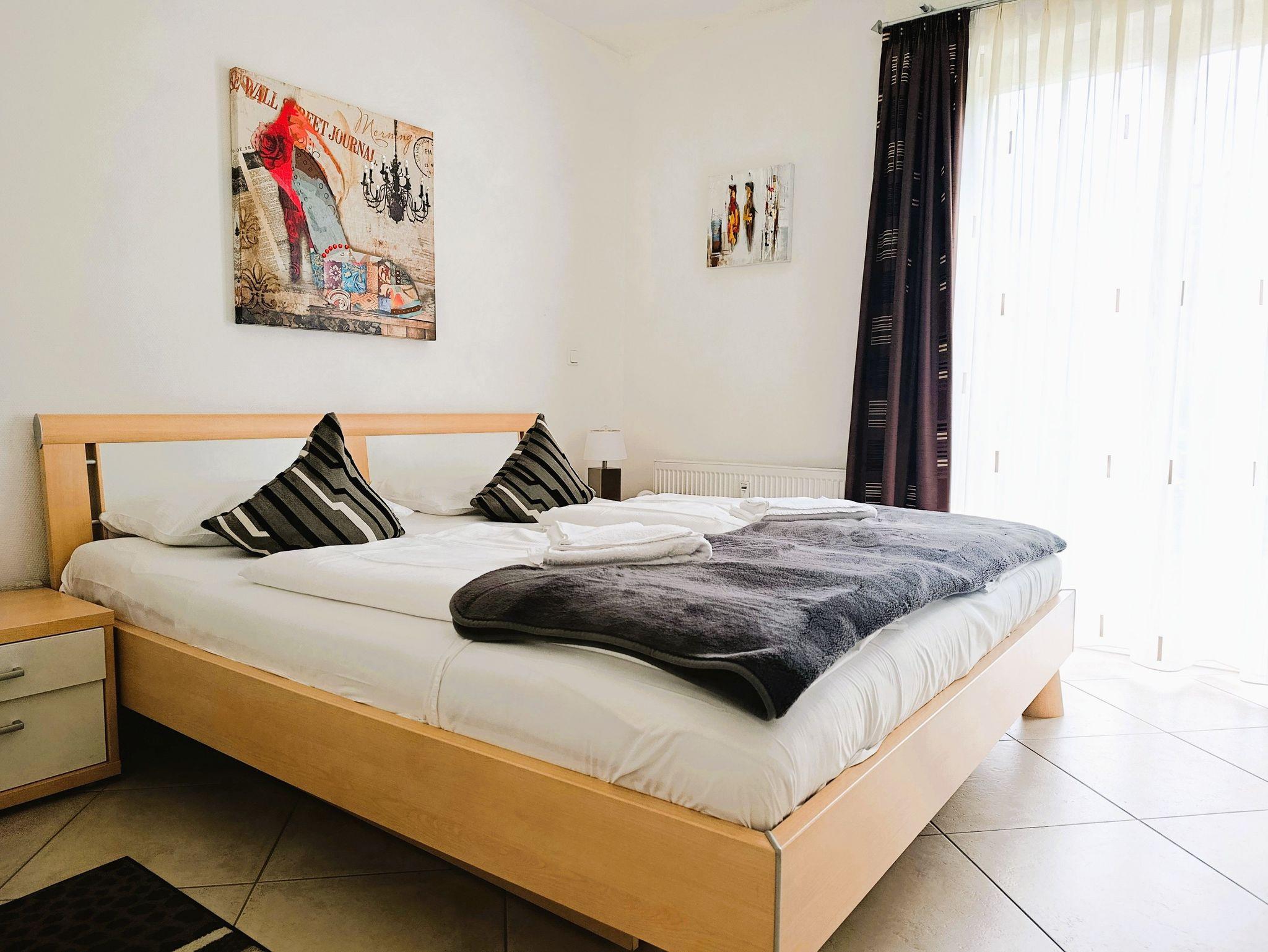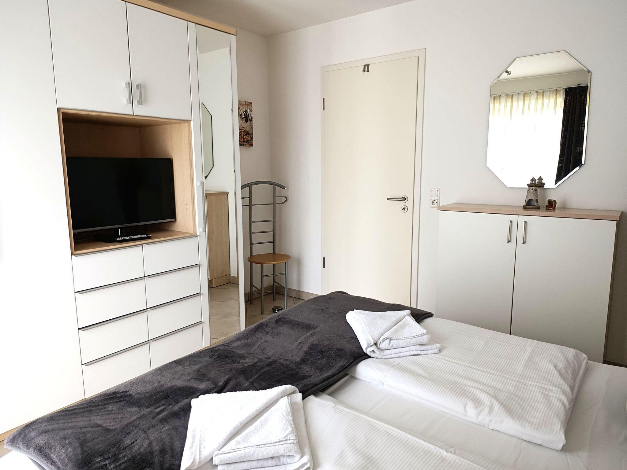 Schlafzimmer mit Doppelbett und Kleiderschrank