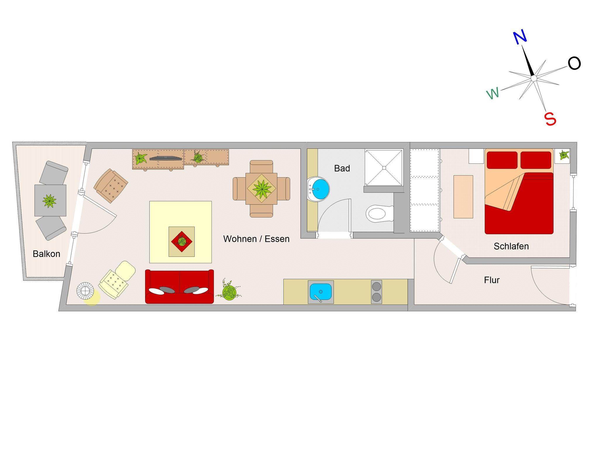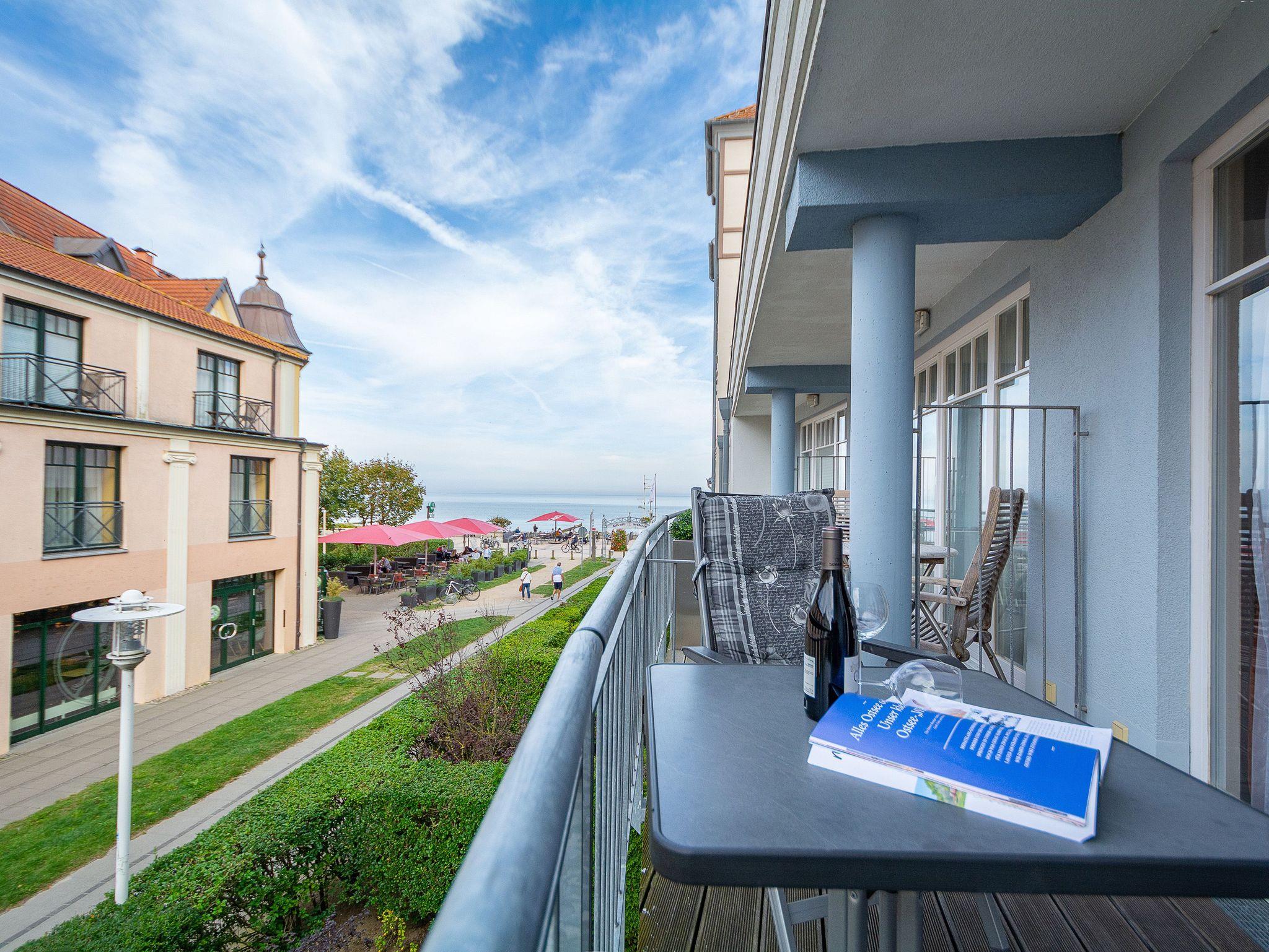 Herzlich Willkommen in unserer liebevoll eingerichteten Ferienwohnung Nr. 1.18 im Haus Meeresblick. Die gemütliche 2-Raum-Ferienwohnung von etwa 50qm Größe befindet sich auf der westlichen Seite des Hauses Meeresblick im ersten Obergeschoss und ist hervorragend für 2 Personen geeignet. Die Wohnung bietet all jenen Komfort, den der anspruchsvolle Gast für seinen erholsamen Urlaub erwartet. Es begrüßt Sie ein freundlicher offener Wohn- und Essbereich mit Ledersofa, Relax-Sessel, 43-Zoll-QLED-Flachbildfernseher, Blu-ray-Player, Stereoanlage etc.. Für die seltenen Regentage sind mehrere DVD's und eine Spielesammlung vorhanden. Die offene Küchenzeile ist mit allen wichtigen Küchengeräten ausgestattet, die Sie für Ihr „perfektes Dinner“ benötigen: Geschirrspüler, Kühlschrank mit Eisfach, 2 Platten-Kochfeld, Mikrowelle, Kaffeemaschine, Wasserkocher, Toaster sowie reichlich Geschirr, Gläser, Besteck und Kochutensilien sind vorhanden. Vom Wohnbereich betreten Sie den möblierten West-Balkon mit herrlichem seitlichen Ausblick über die Strandpromenade auf die Ostsee. Von hier können Sie den Abend zu einem Gläschen Wein ausklingen lassen. Im zum bepflanzten Atrium des Hauses ausgerichteten Schlafzimmer befinden sich ein Doppelbett (1,60 m), ein Kleiderschrank sowie ein 32-Zoll-Fernseher. Zusätzlich ist es auch sehr bequem möglich, auf der modernen und stabilen Leder-Schlafcouch (mit durchgängiger Bultex-Matratze) zu übernachten. Das moderne Bad ist funktionell eingerichtet mit flacher Duschwanne, einem in massivem Eichenholz eingelassenen Waschtisch, WC, großflächigem Spiegel sowie einem Fön.