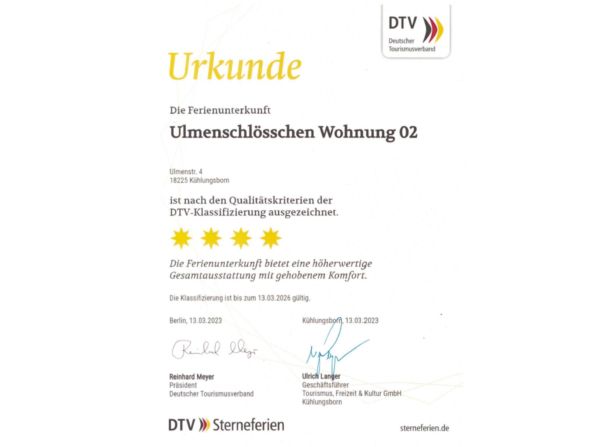 Die Klassifizierung mit 4 Sternen erfolgte im Jahr 2003 durch den Deutschen Tourismusverband (DTV) und bestätigt die hohe Qualität und Ausstattung der Wohnung.