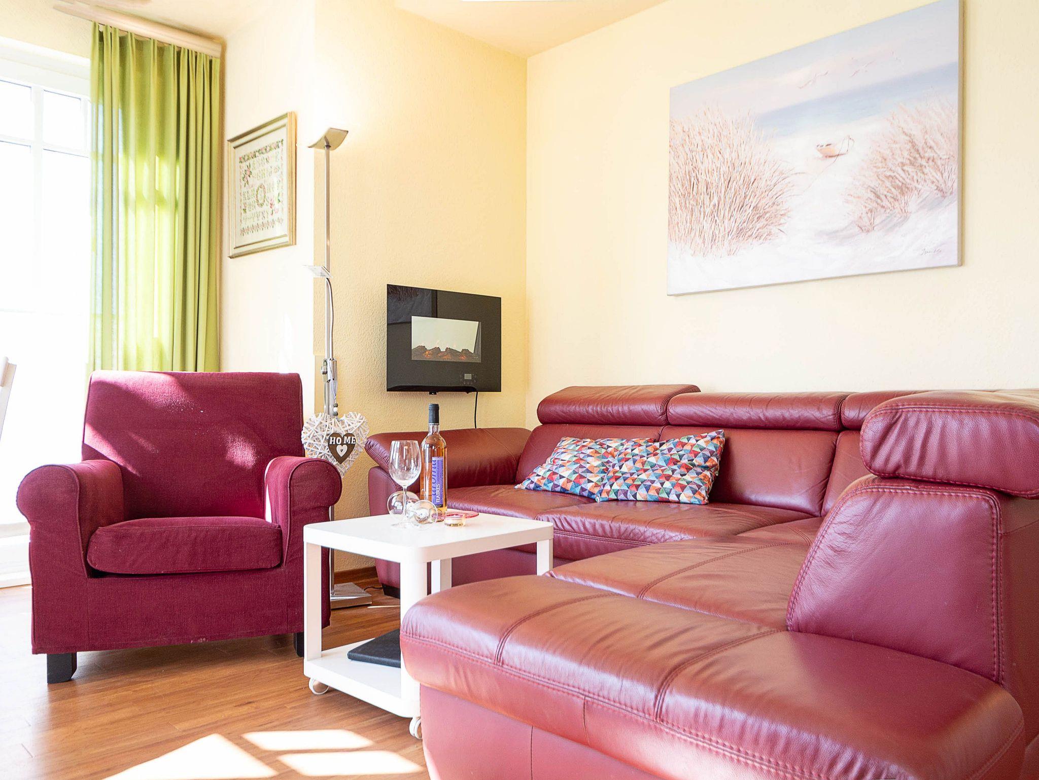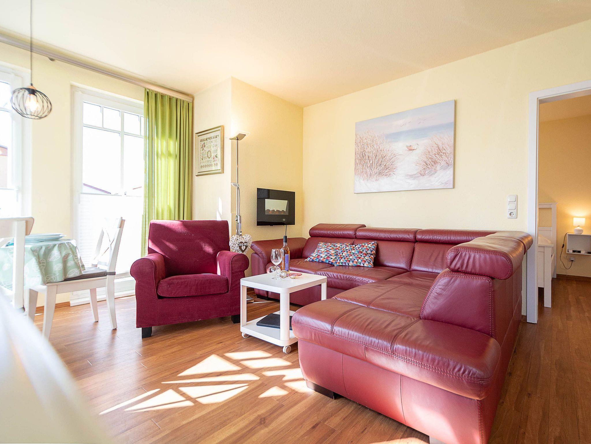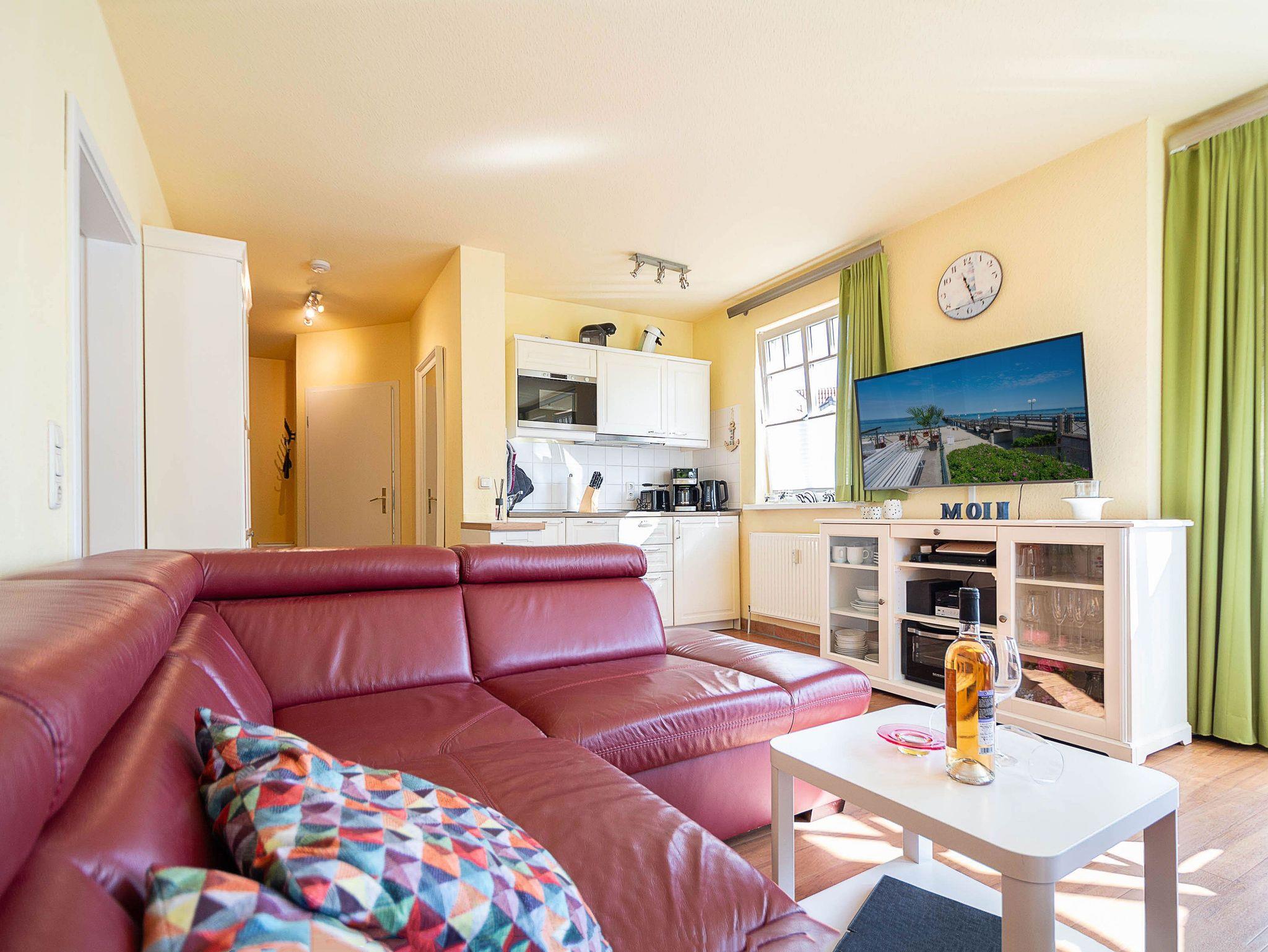 Im Wohnbereich erwartet Sie eine gemütliche Ledercouch mit großzügiger Ottomane, die zu entspannten Stunden einlädt. Für Unterhaltung sorgen ein großer Flachbild-TV mit Kabelanschluss, eine Stereoanlage sowie ein Blu-ray-Player. Der angrenzende Essbereich mit einem stilvollen Holztisch und vier Stühlen bietet Platz für gemeinsame Mahlzeiten.